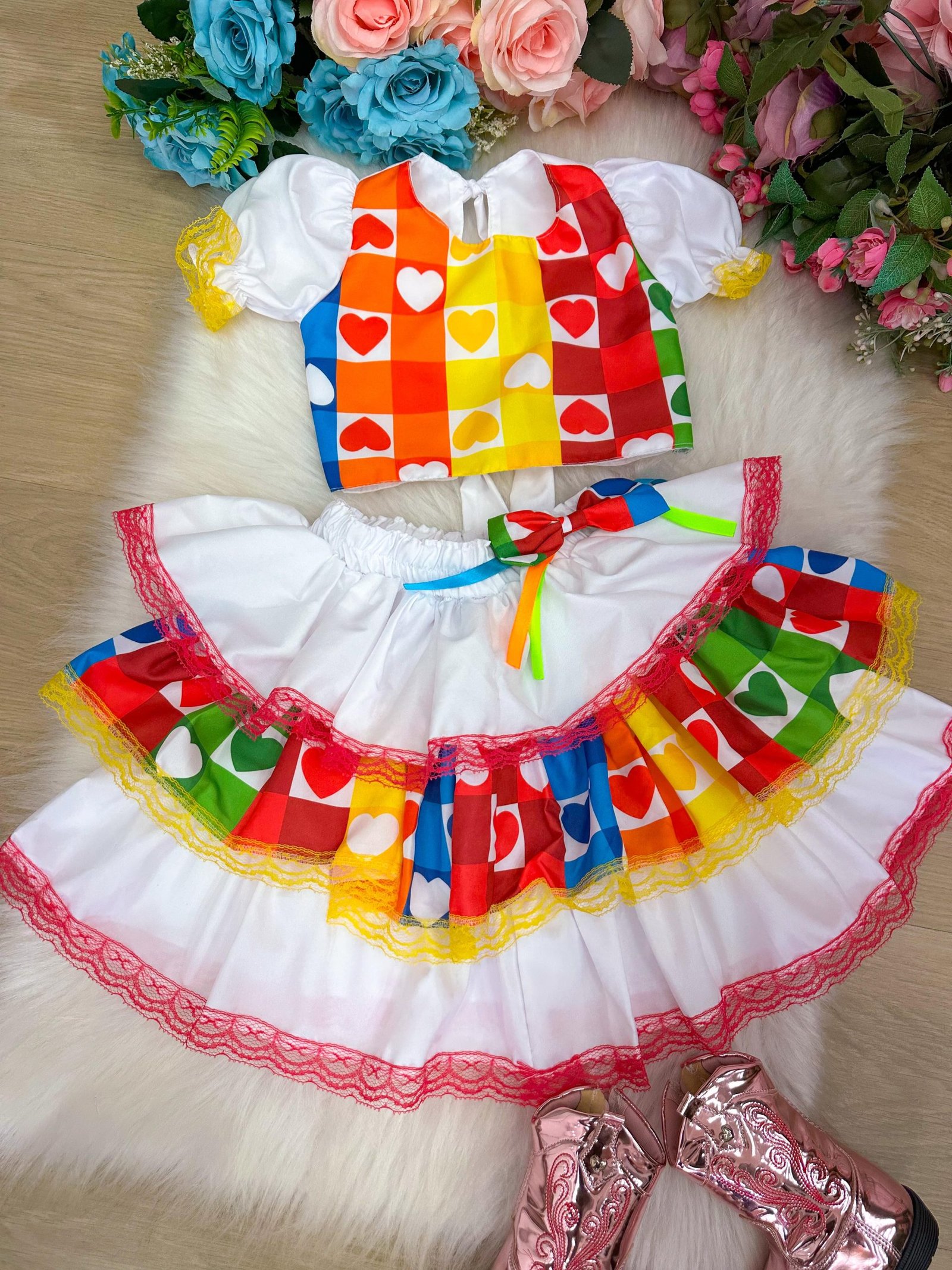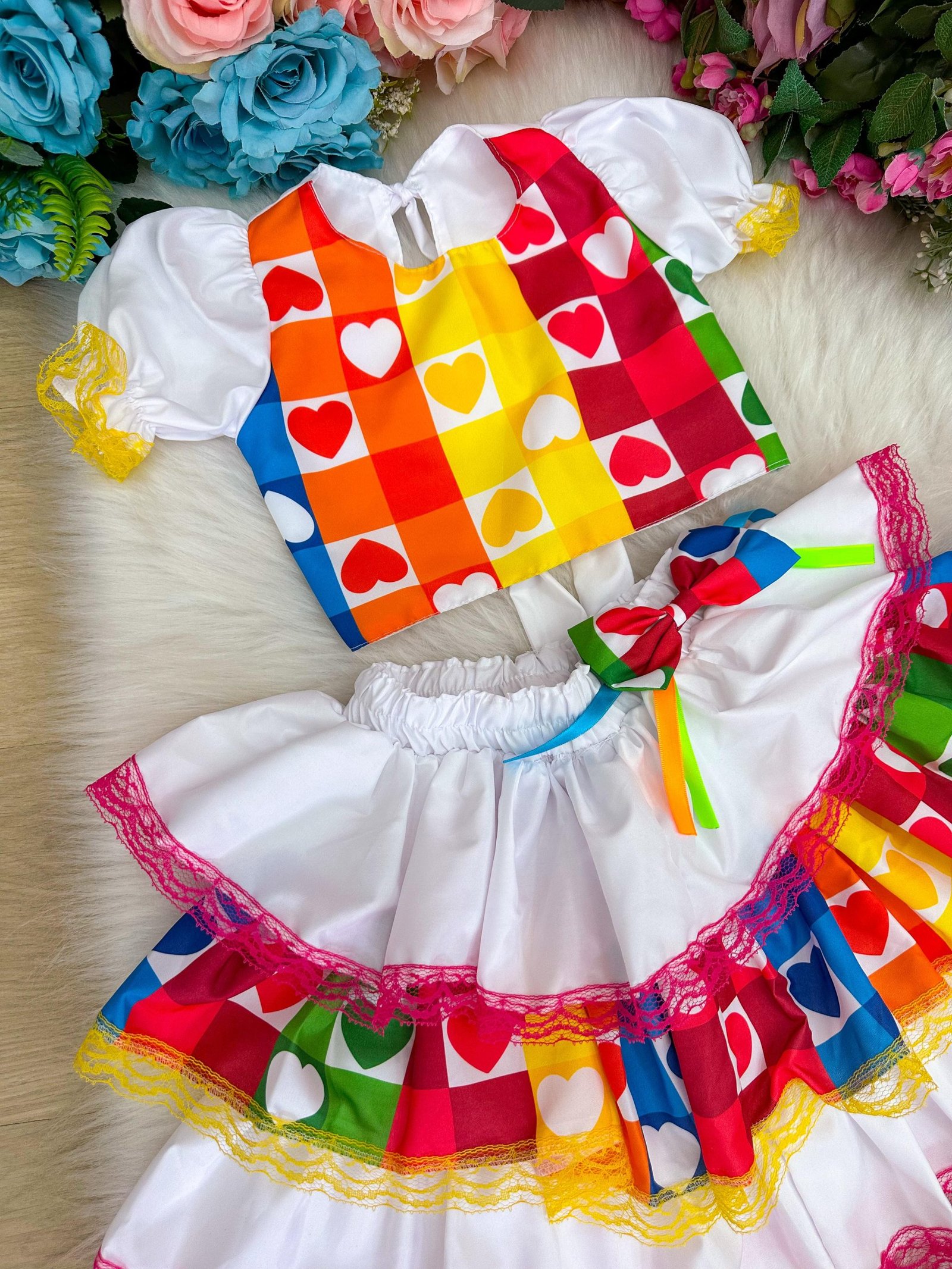 Confeccionado em tecido misto possui forro em poliéster e algodão para não incomodar a criança e proporcionando um caimento incrível e sofisticado, possui gola redonda, comprimento médio, mangas curtas, possui elástico na cintura para melhor ajuste e blusinha com elástico nas costas para ajustar a parte posterior do conjunto completando o look dos sonhos!