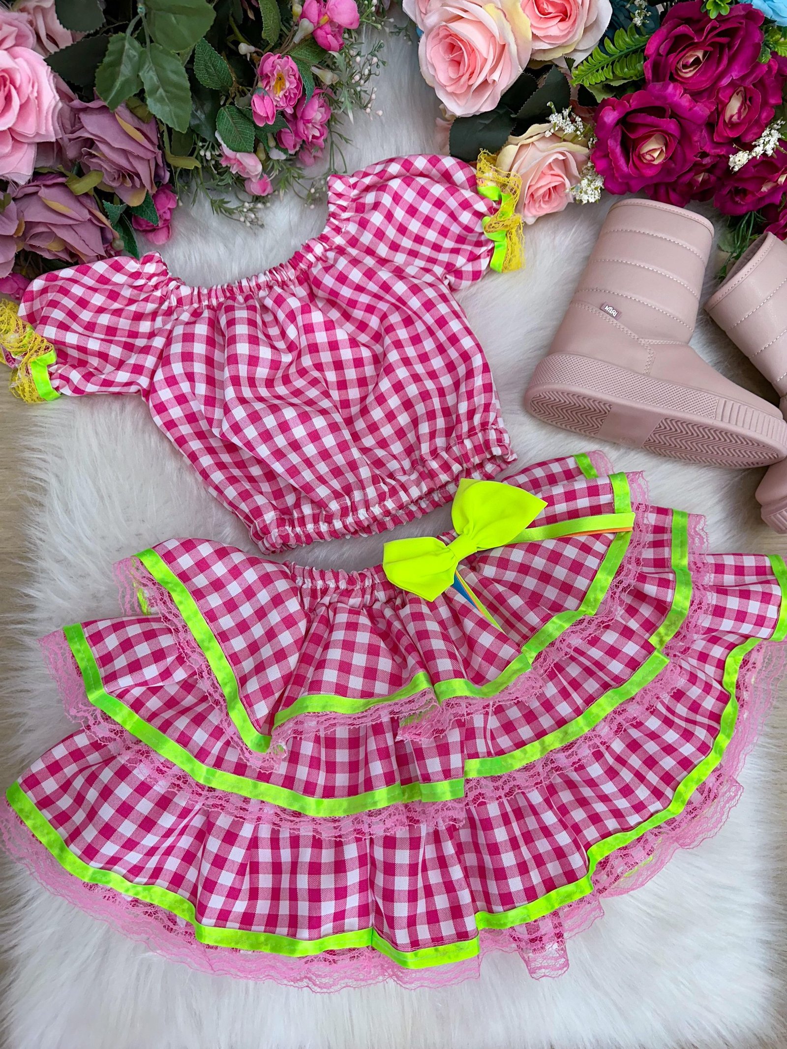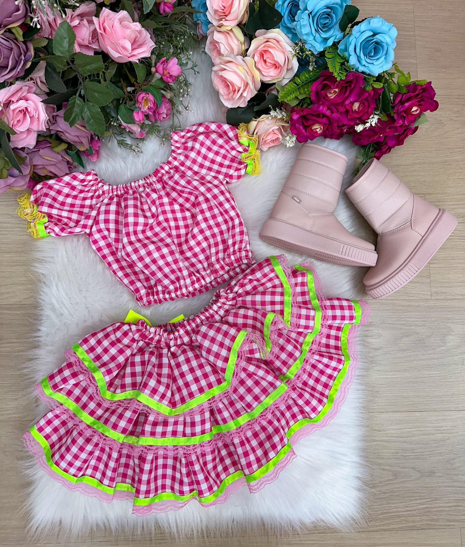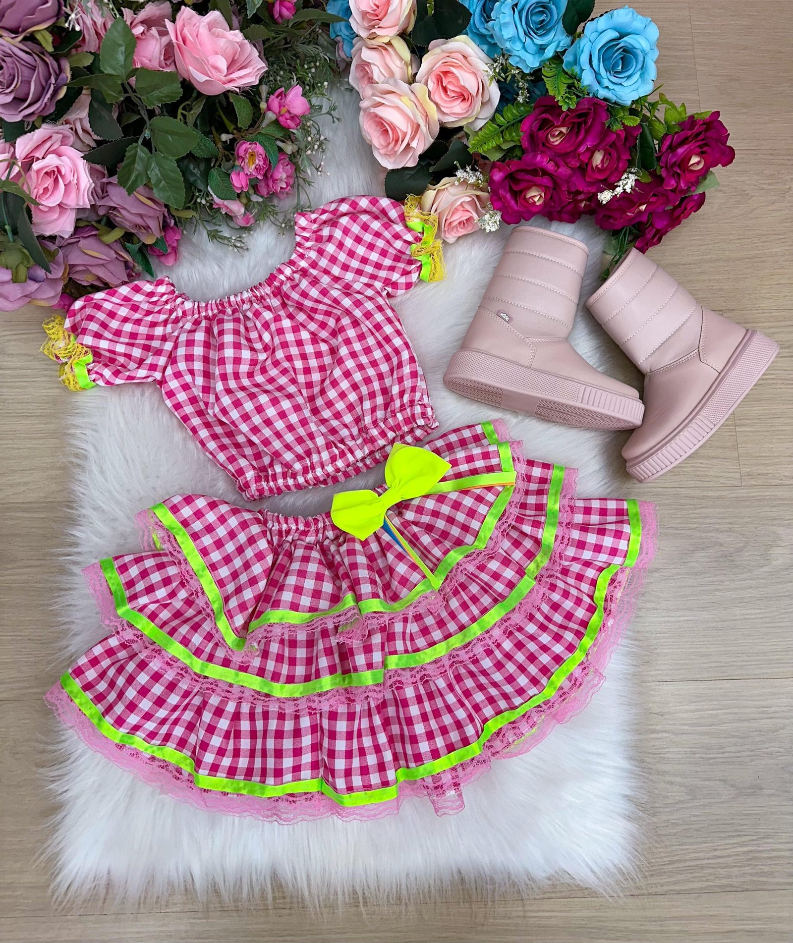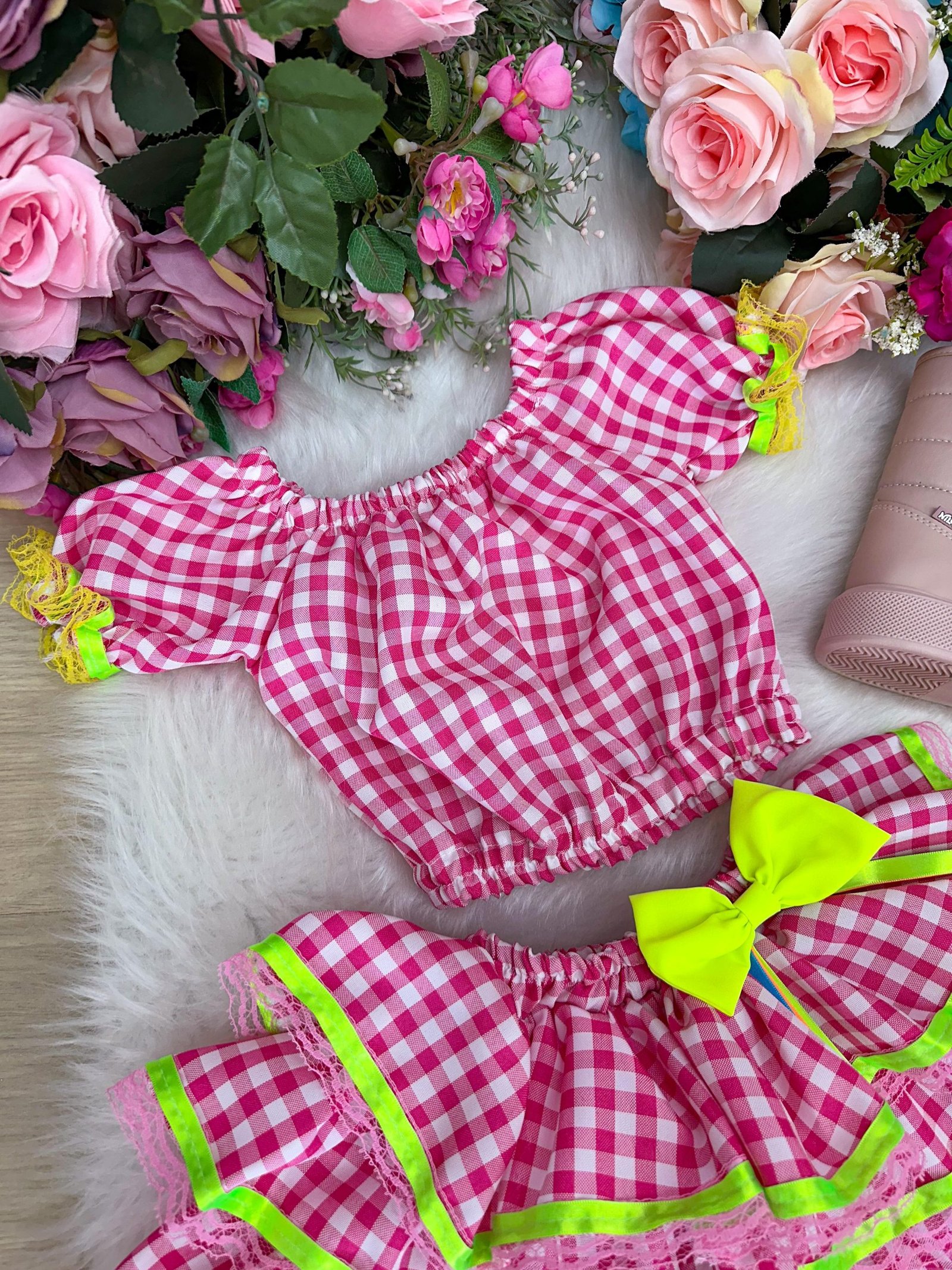 Seja o primeiro a avaliar “Conjunto Junino Banana Club Luxo Sofia Xadrez Rosa”