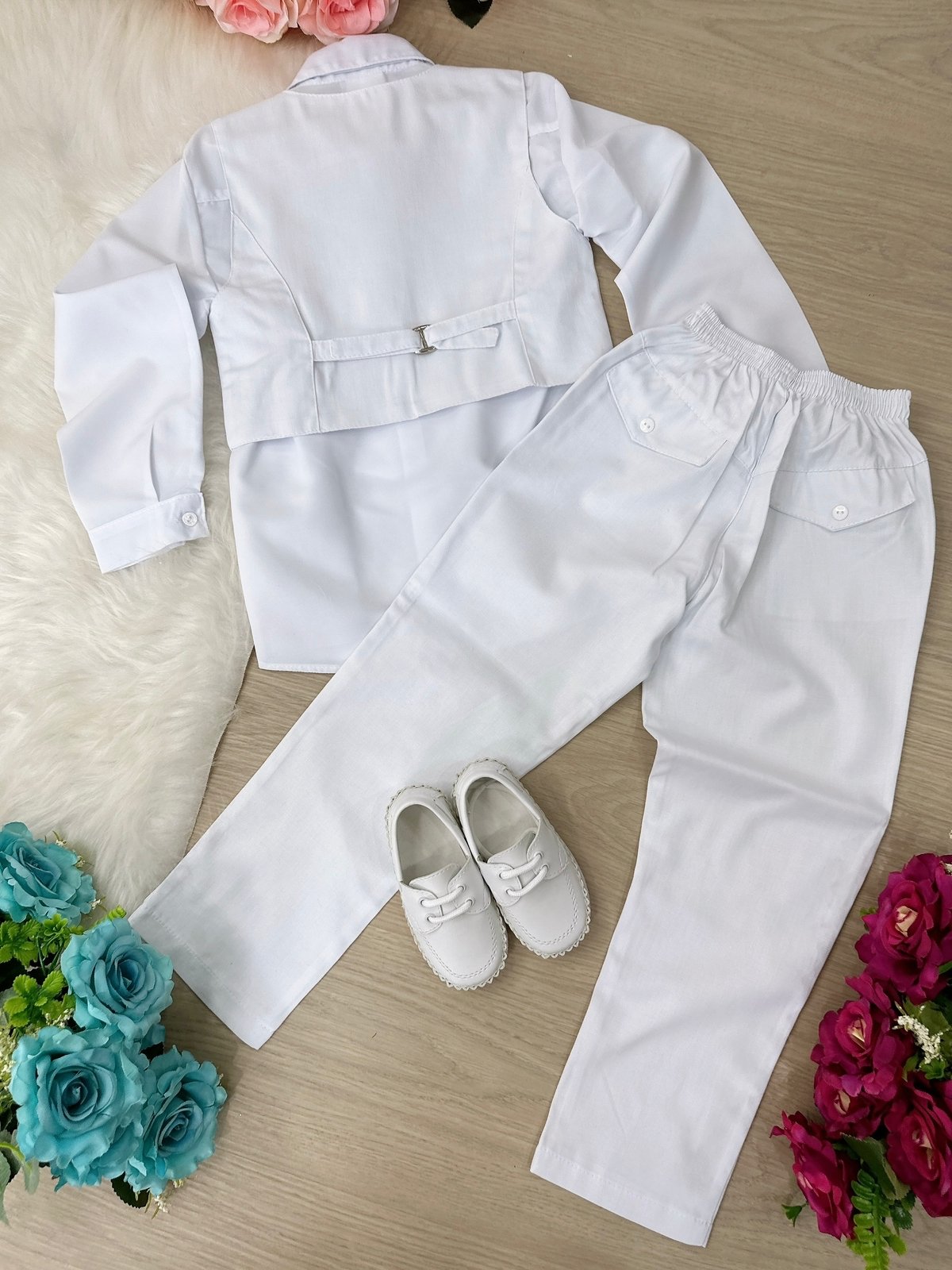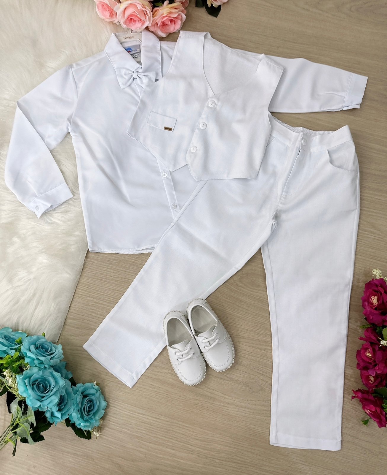 Conjunto composto por: Camisa social manga longa, gravata borboleta, calça, colete na cor branca.