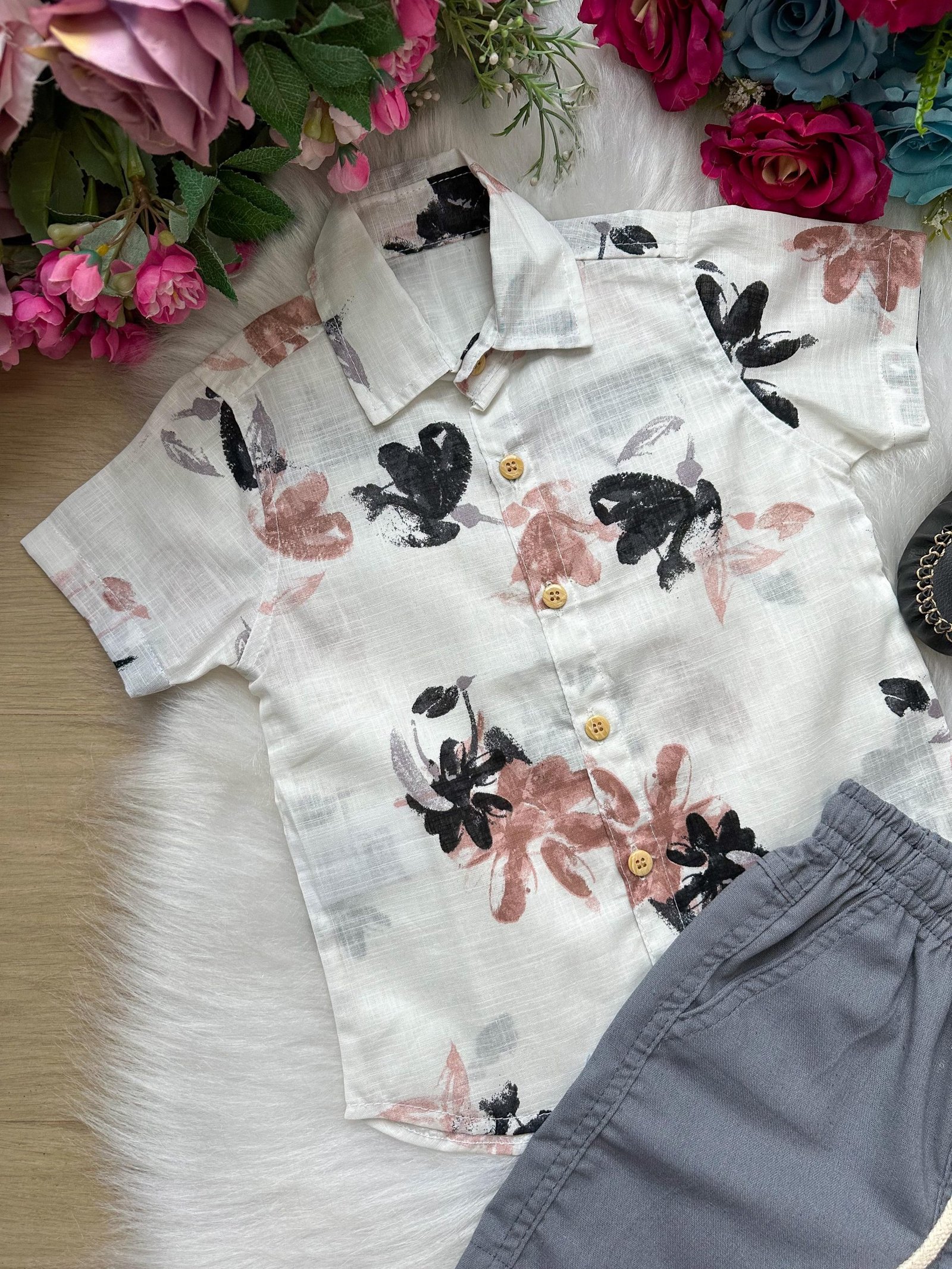 Conjunto composto por: Camisa Social Manga Curta off florida e Shorts na cor cinza