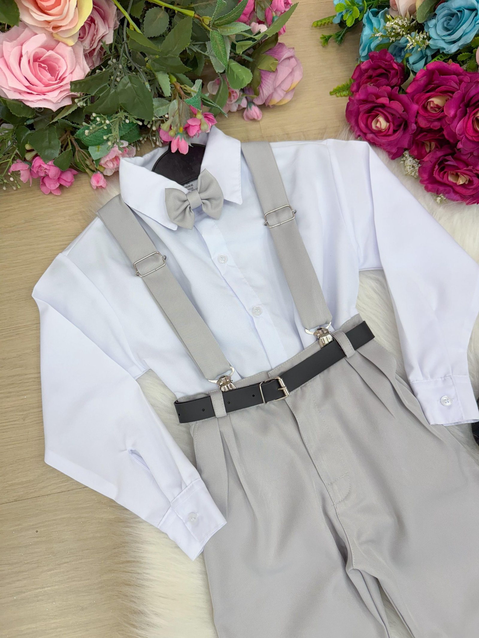 Conjunto composto por: Camisa social na cor Branca manga longa, gravata borboleta bege calça na cor bege, suspensorio begee Cinto marrom