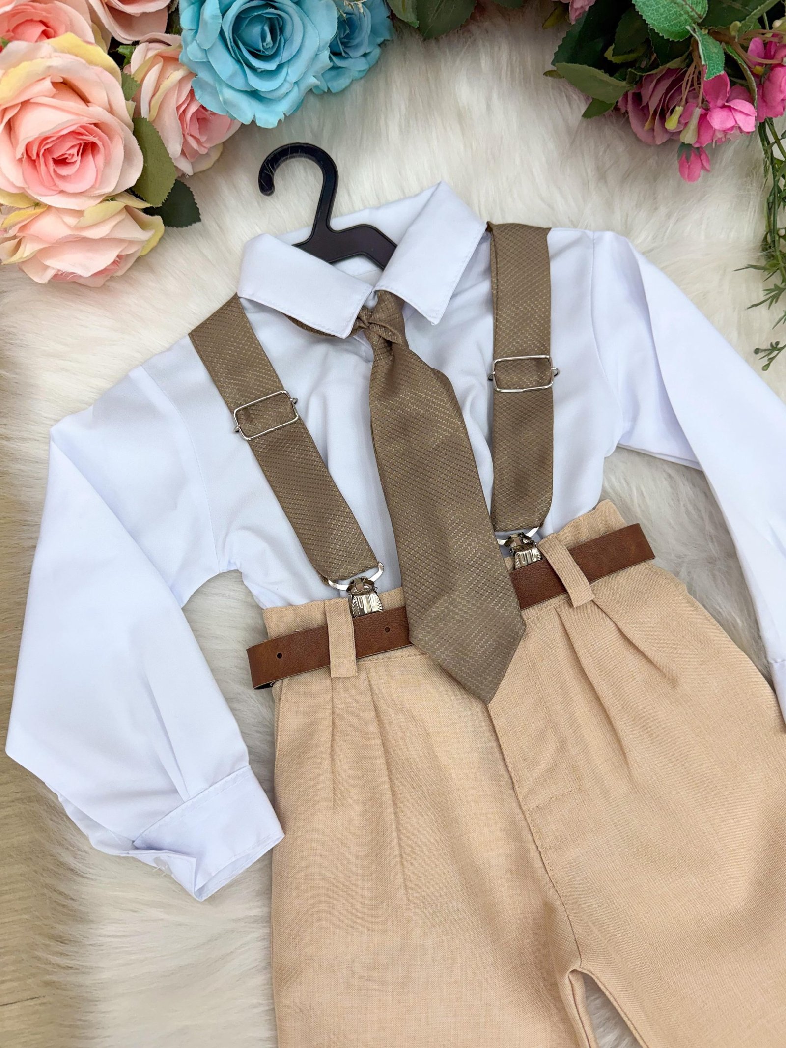 Conjunto composto por: Camisa social na cor Branca manga longa, gravata caramelo, calça na cor caramelo, suspensorio caramelo e cinto.