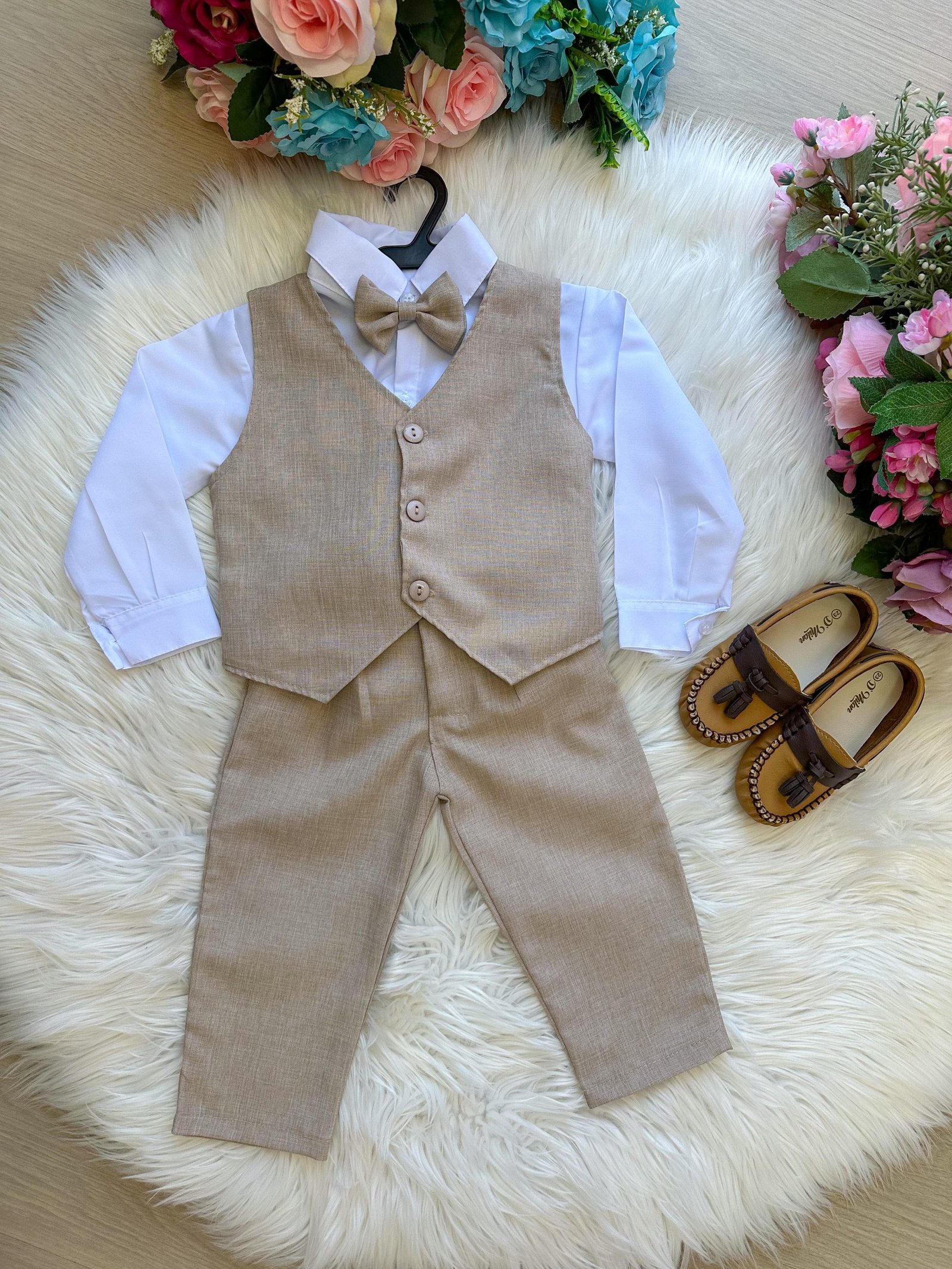 Conjunto composto por: Camisa social na cor Branca manga longa, gravata borboleta bege, calça na cor bege, colete de alfaiataria bege e cinto.