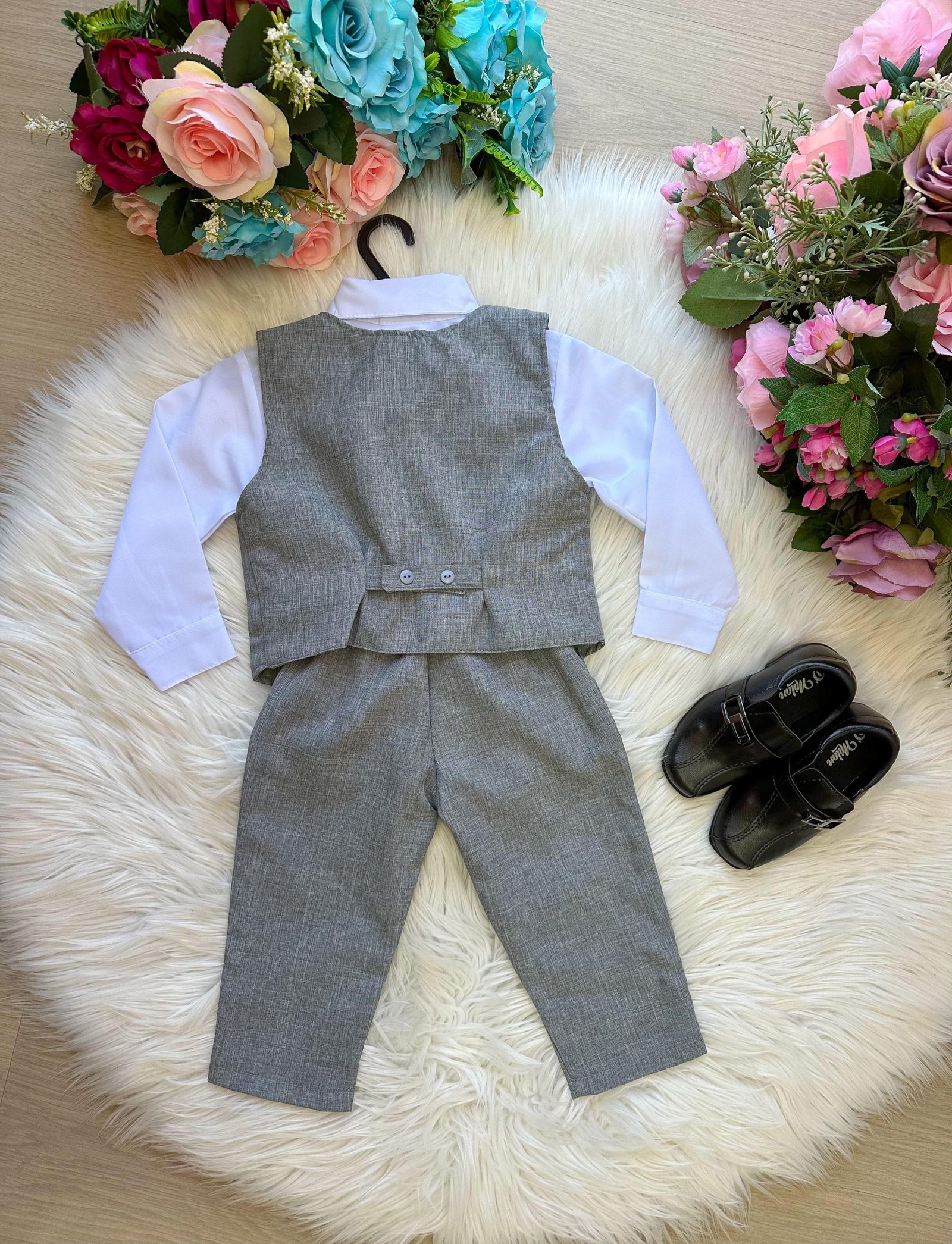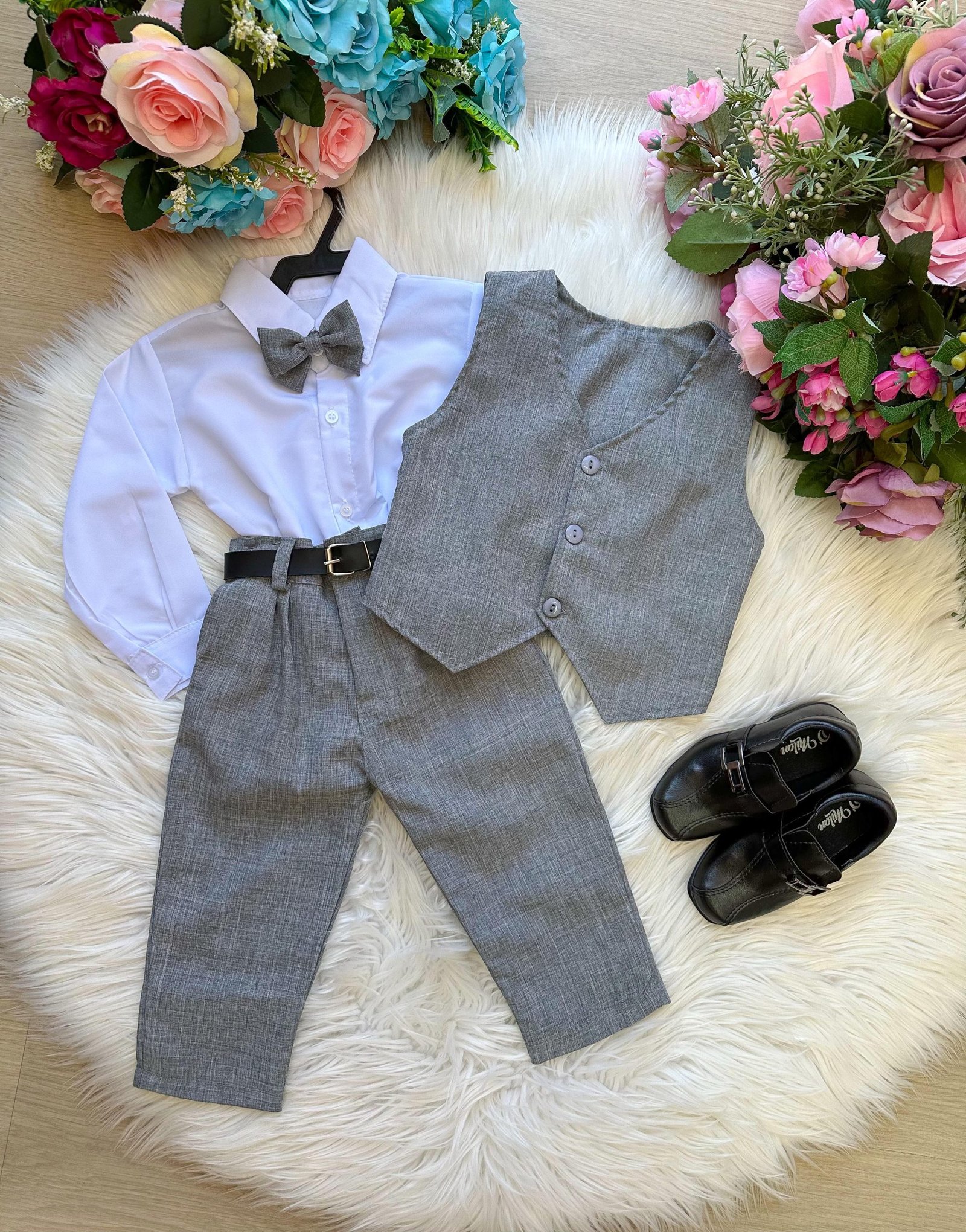 Conjunto composto por: Camisa social na cor Branca manga longa, gravata borboleta Cinza, calça na cor cinza, colete de alfaiataria cinza e cinto.