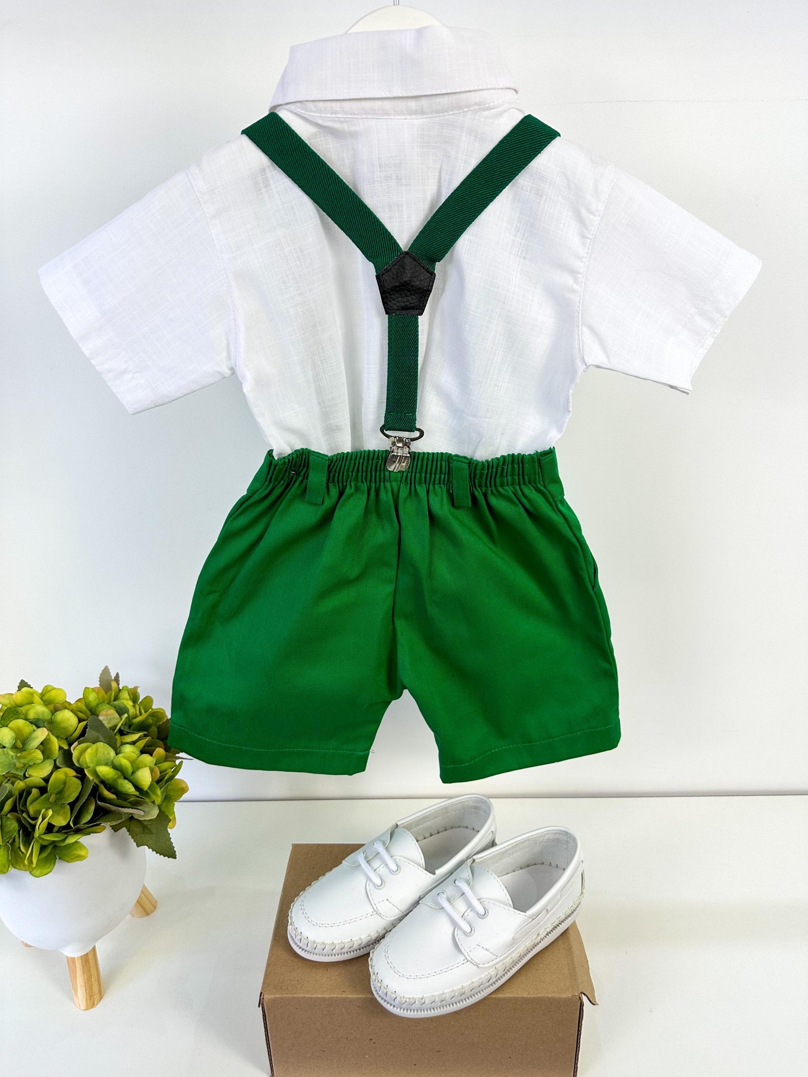 Conjunto composto por: Camisa social na cor Branca manga curta, gravata borboleta Verde, Shorts na cor Verde e suspensorio de elastico.