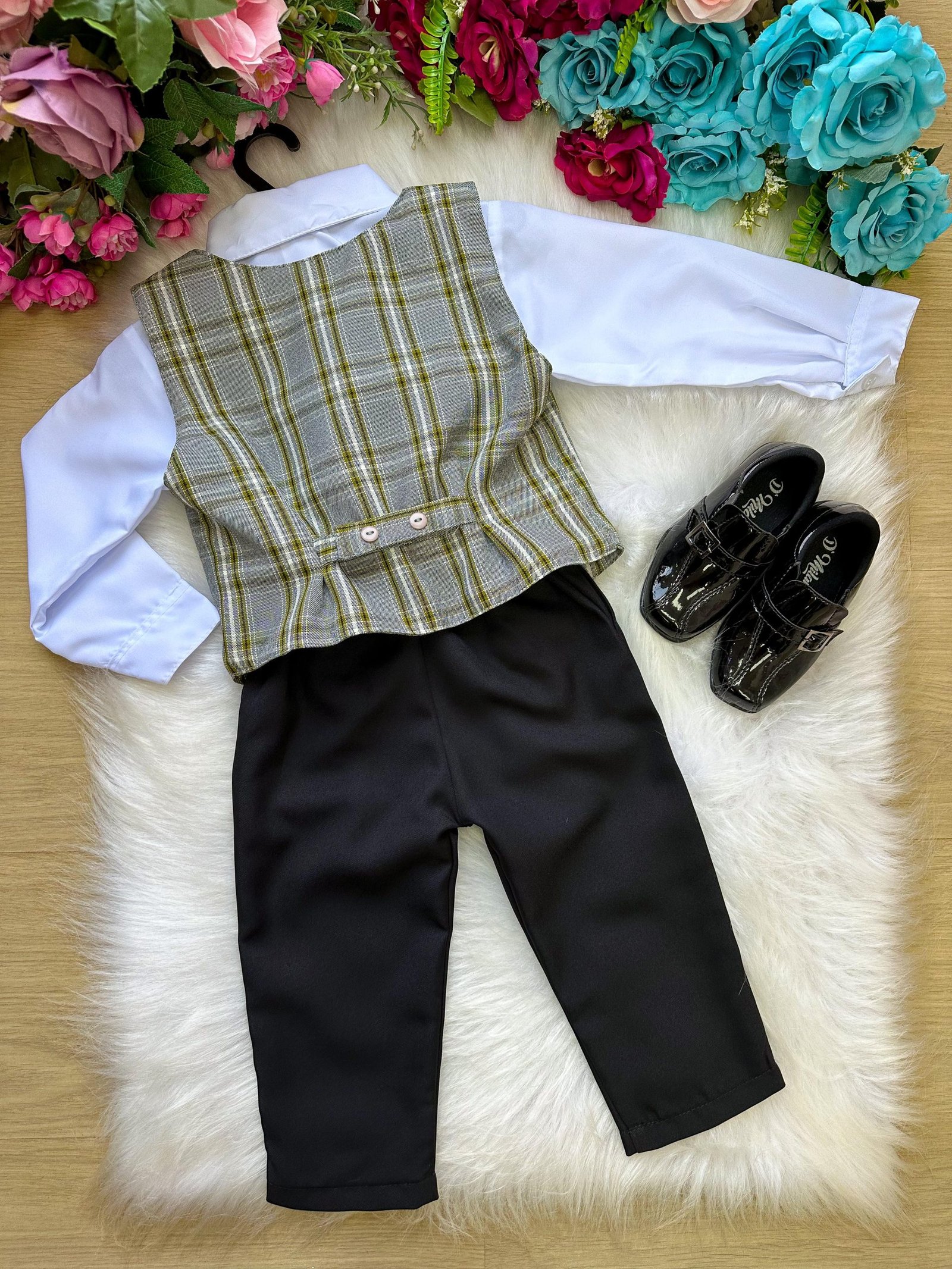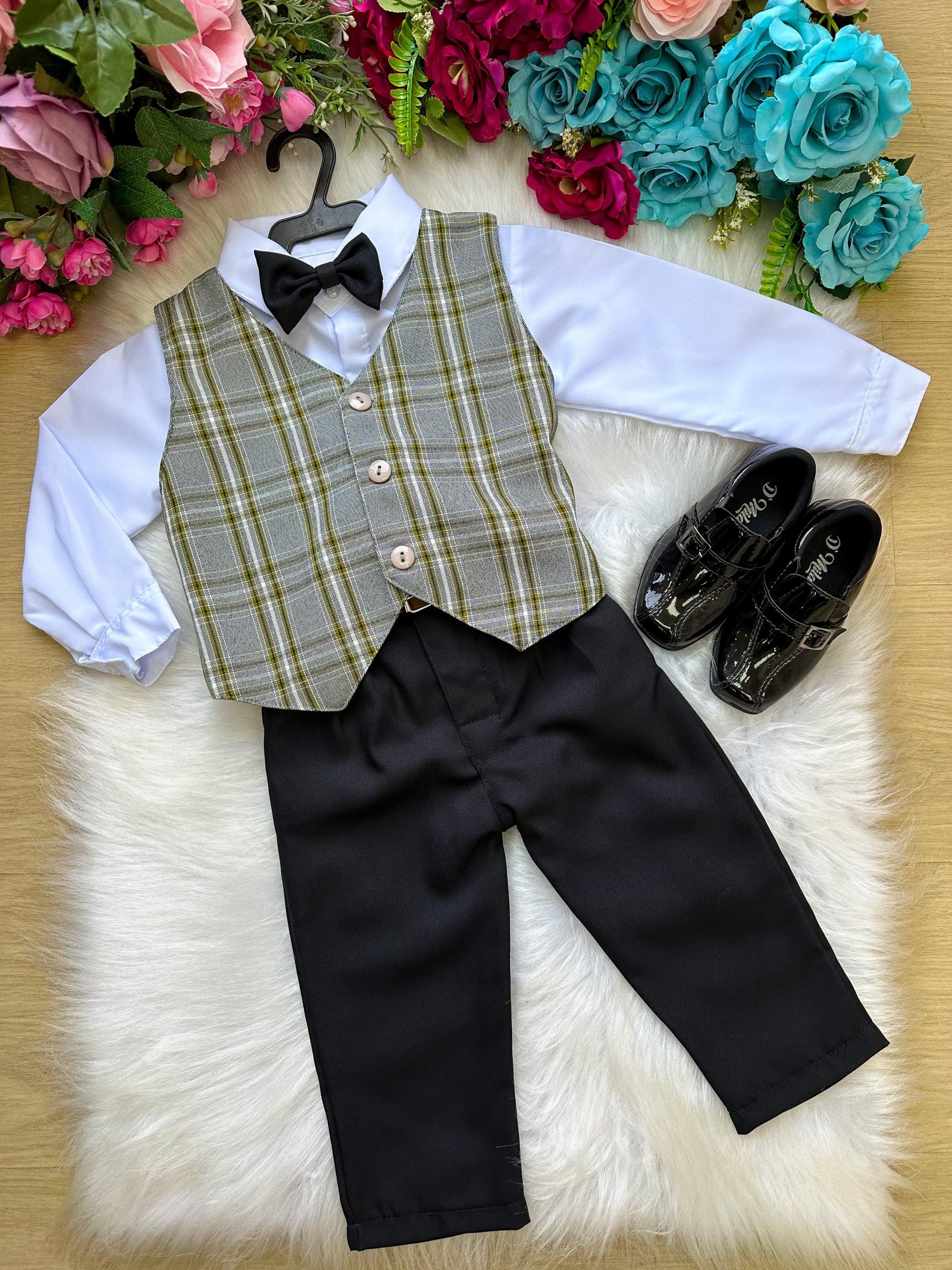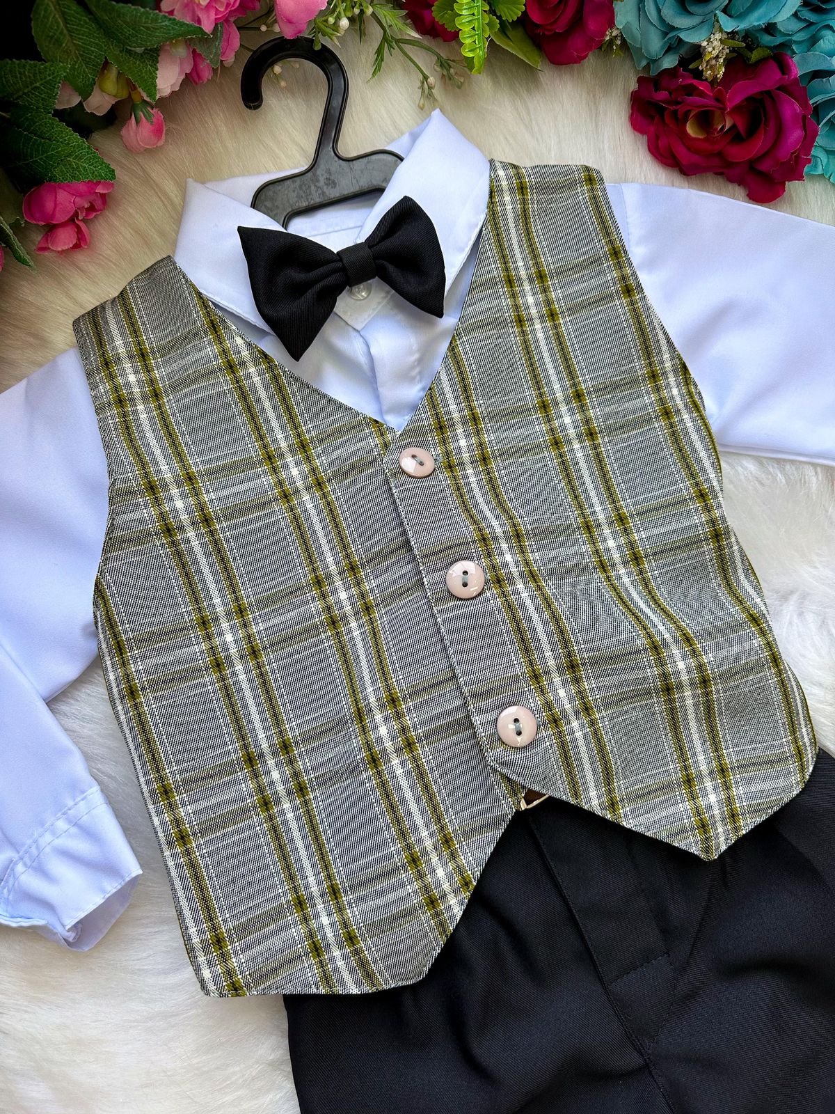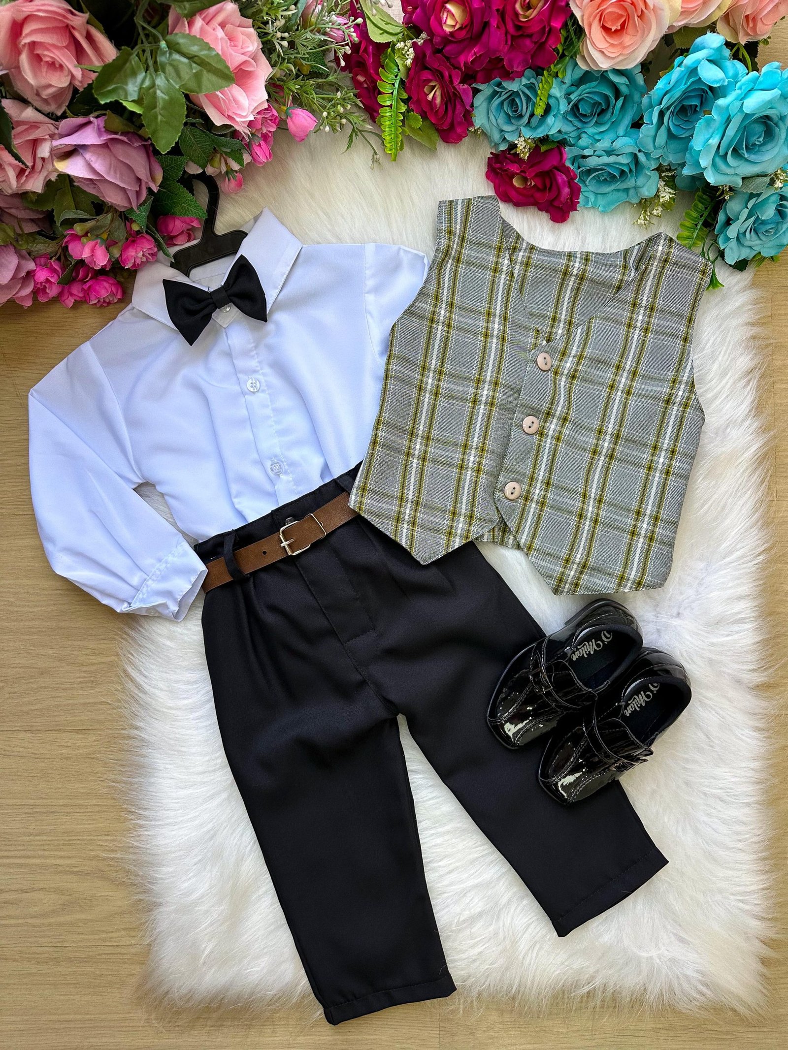 Conjunto composto por: Camisa Social na cor Branca, Gravata Borboleta na preta, Cinto na Cor marrom, Calça preta e colete xadrez