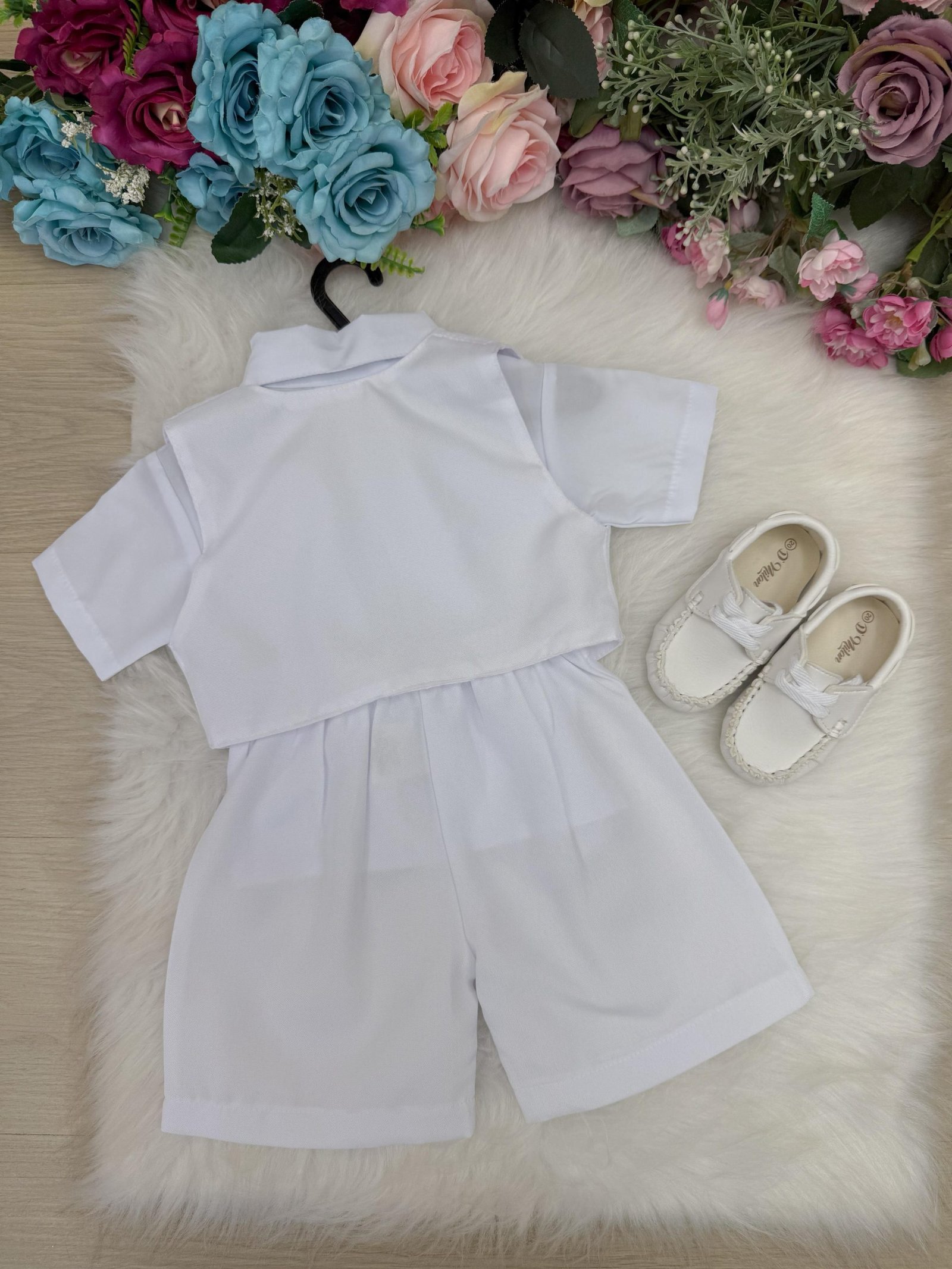 Conjunto composto por: Camisa social na cor Branca, Jardineira na cor Branca e gravata borboleta branca
