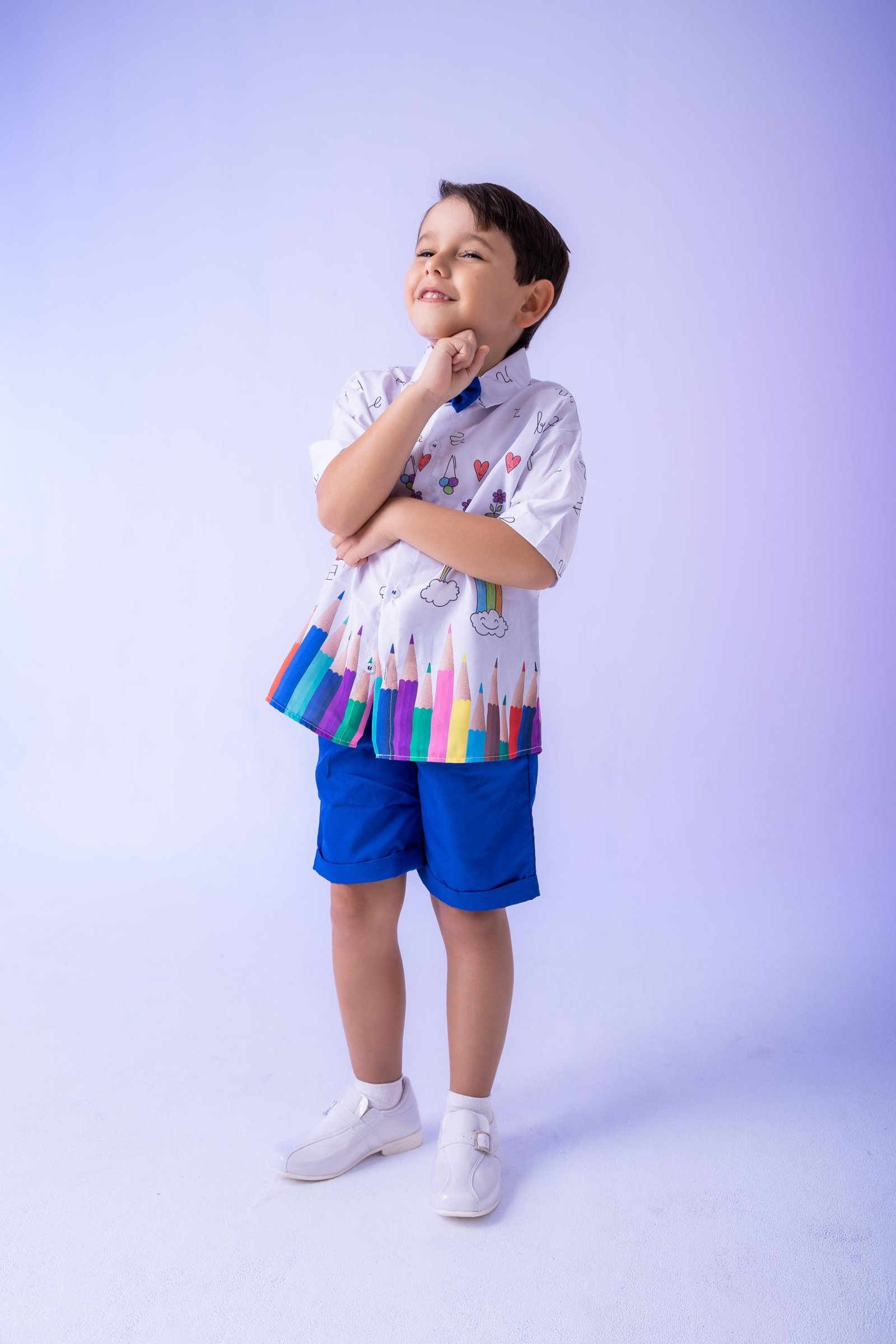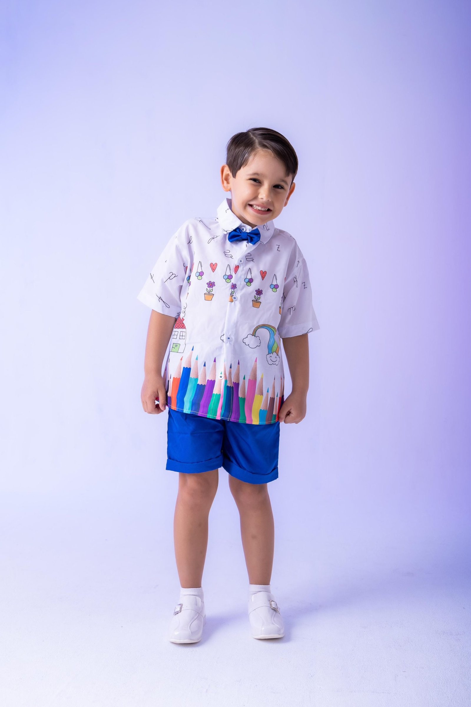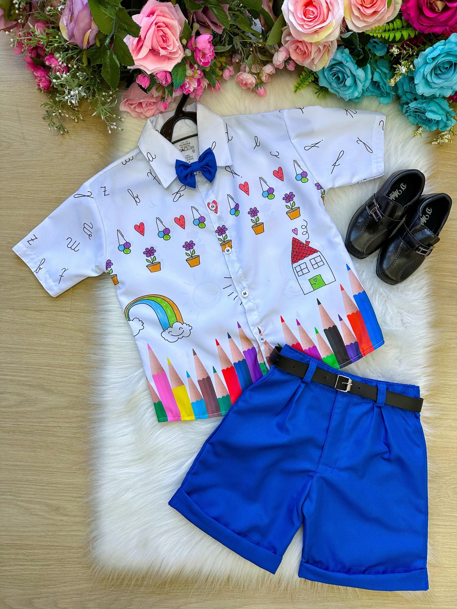 Conjunto composto por: Camisa social na cor Branca com Desenhos, Gravata Borboleta Azu,Shorts na cor Azul e Cinto na Cor Preta