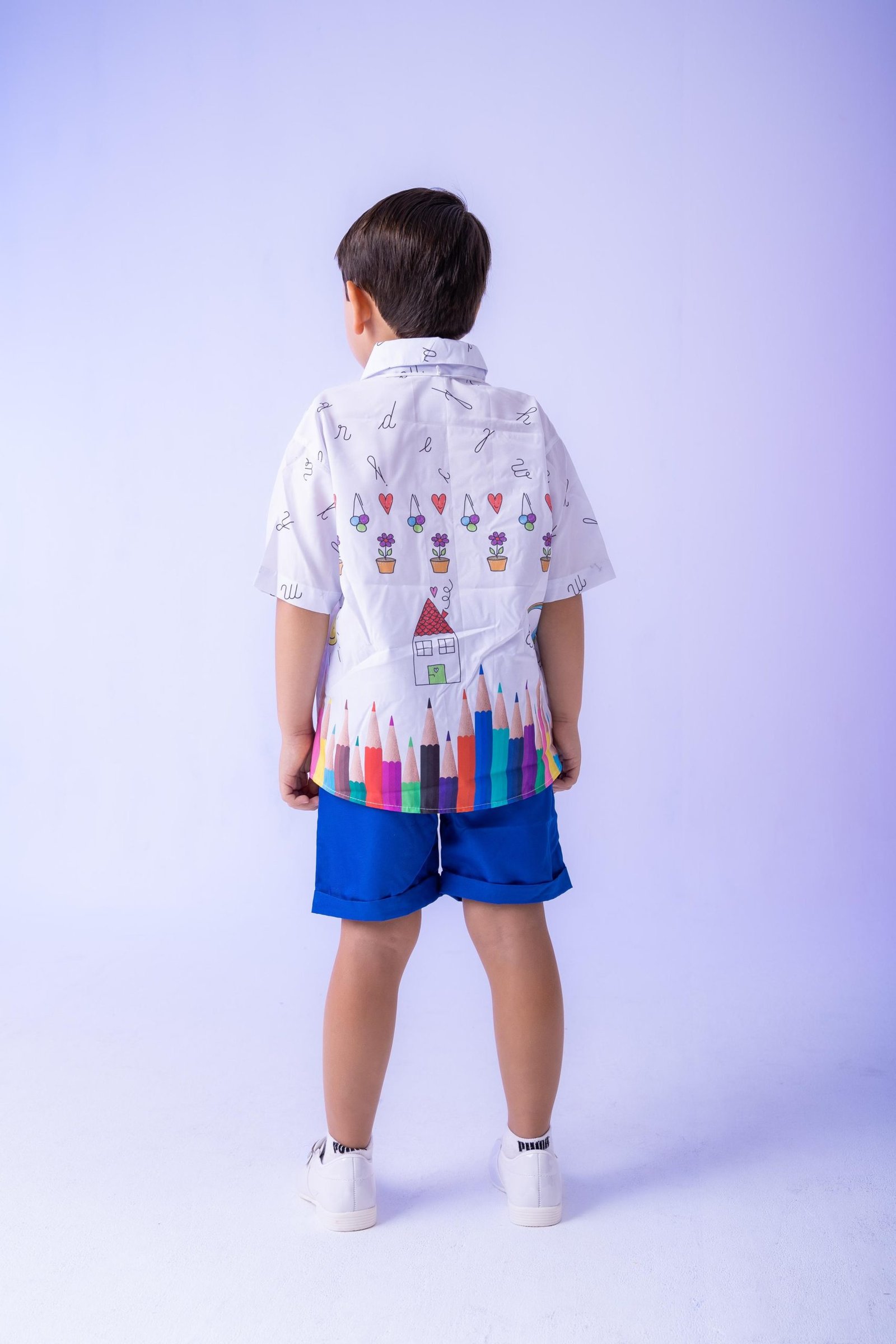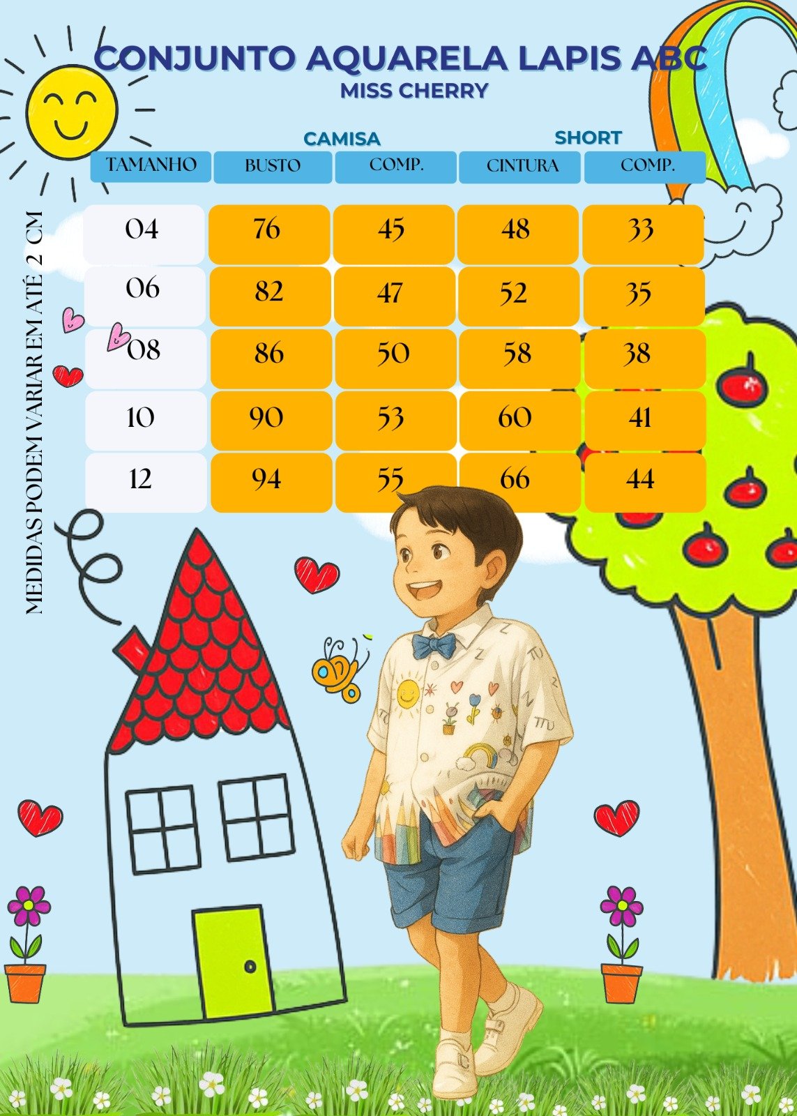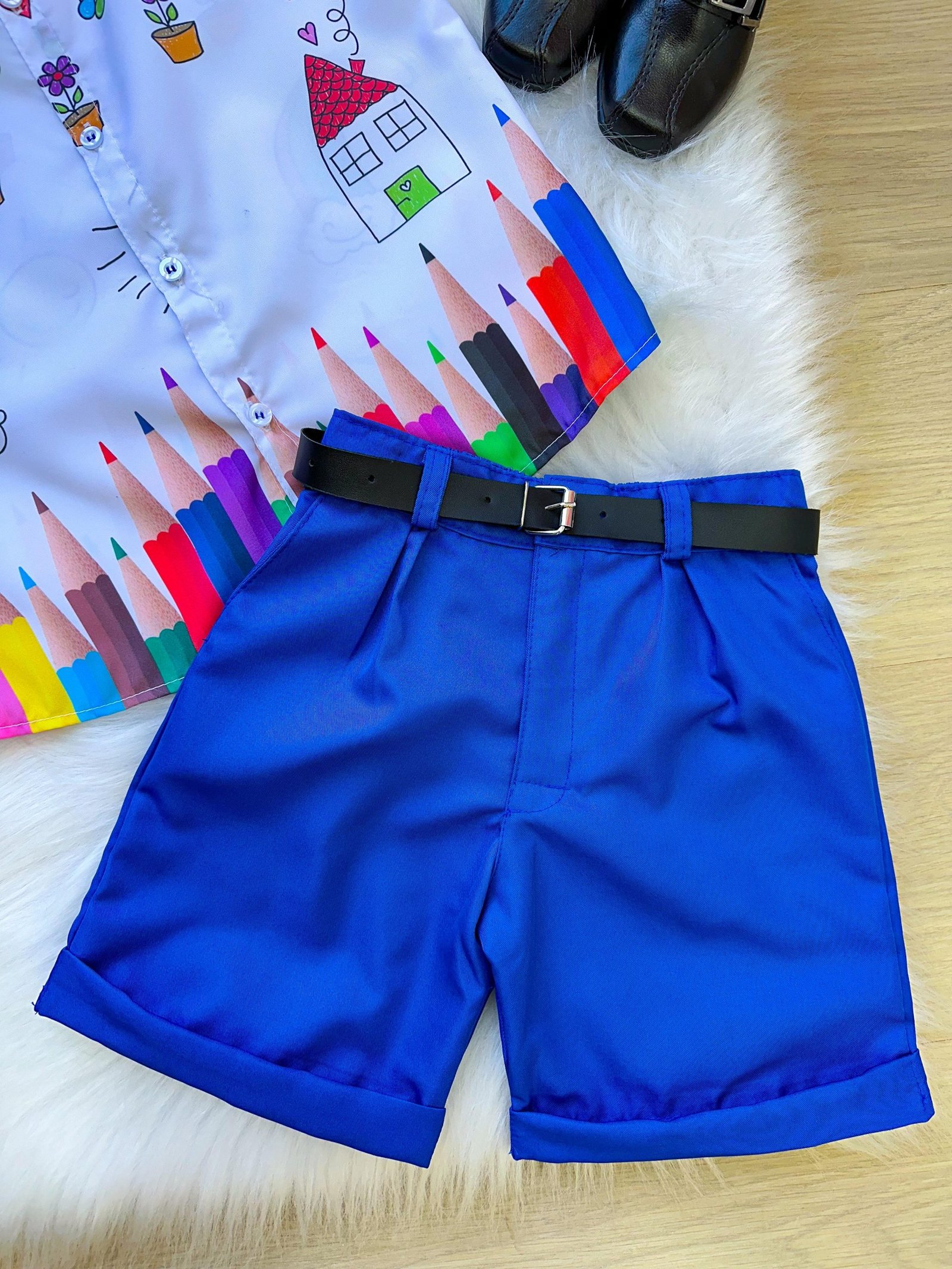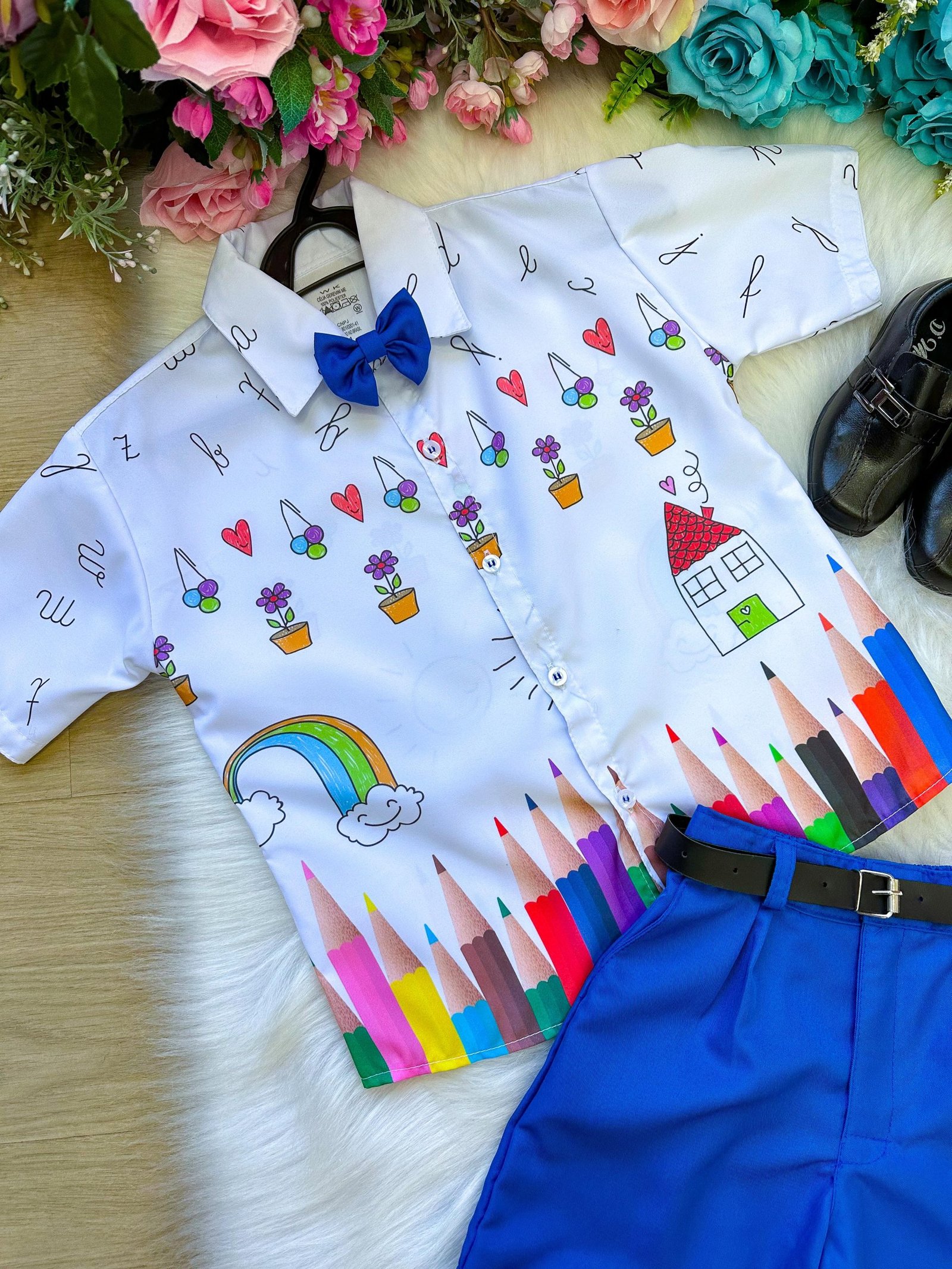 Conjunto composto por: Camisa social na cor Branca com Desenhos, Gravata Borboleta Azu,Shorts na cor Azul e Cinto na Cor Preta