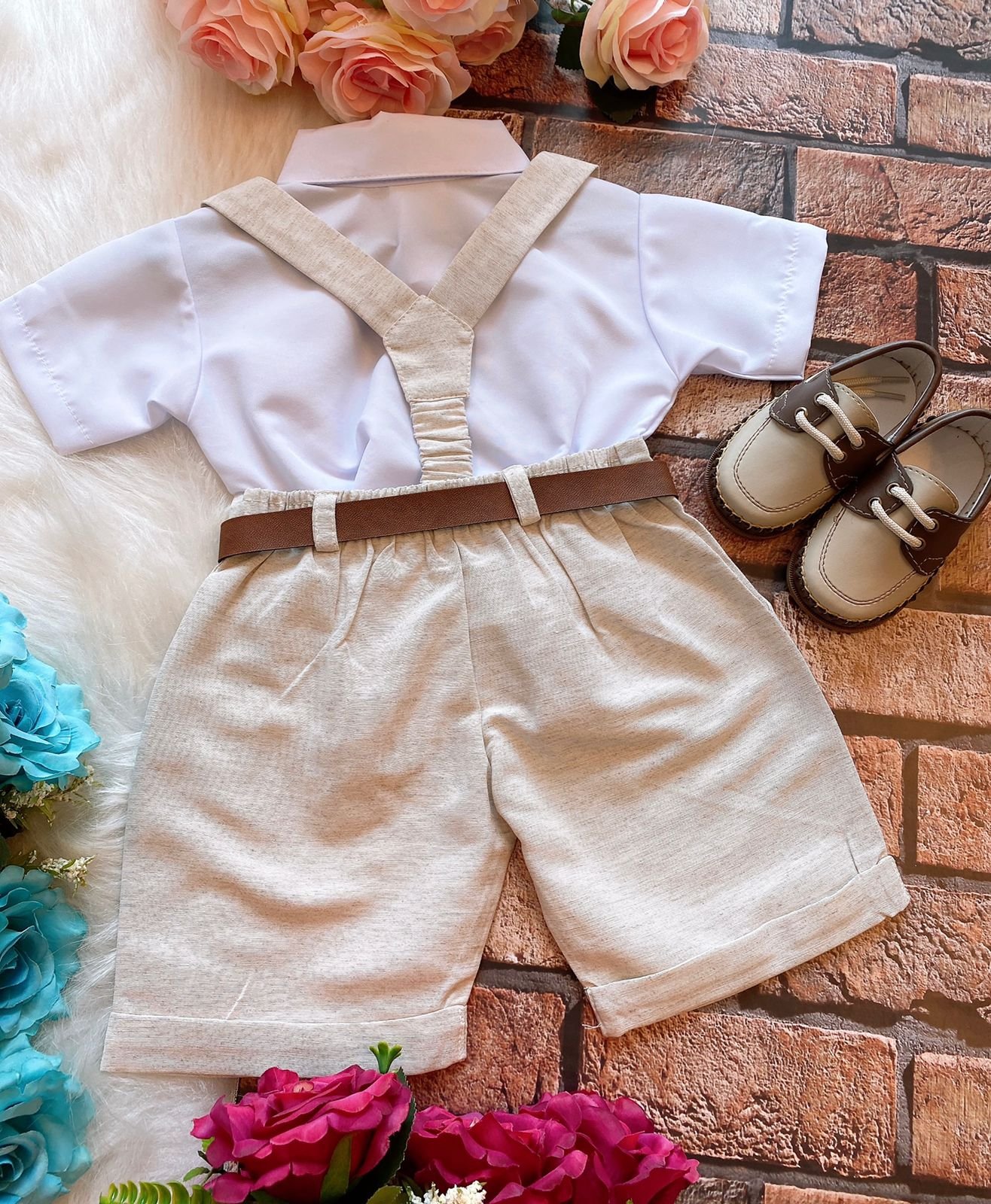 Acompanha gravata borboleta linho, suspensório linho com regulagem e cinto ajustável branco com fivela metálica.