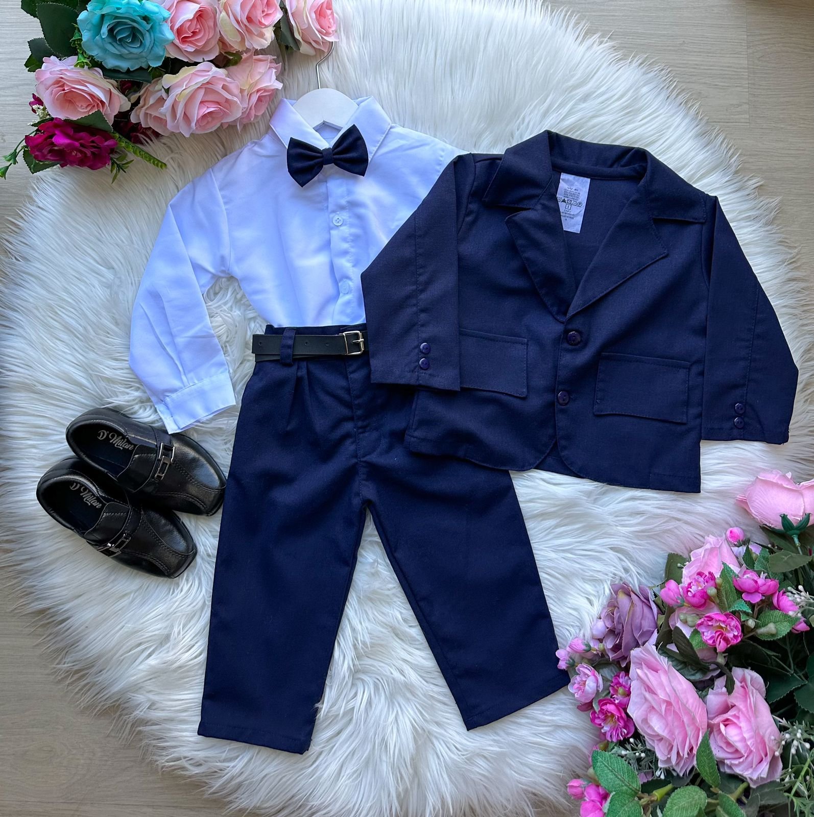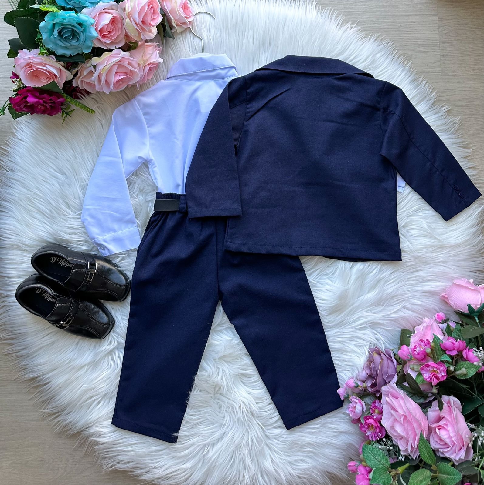 Conjunto composto por: Camisa social na cor branca manga Longa, gravata borboleta Azul marinho, cinto, Calça na cor Azul Marinho e blaizer na cor Azul Marinho