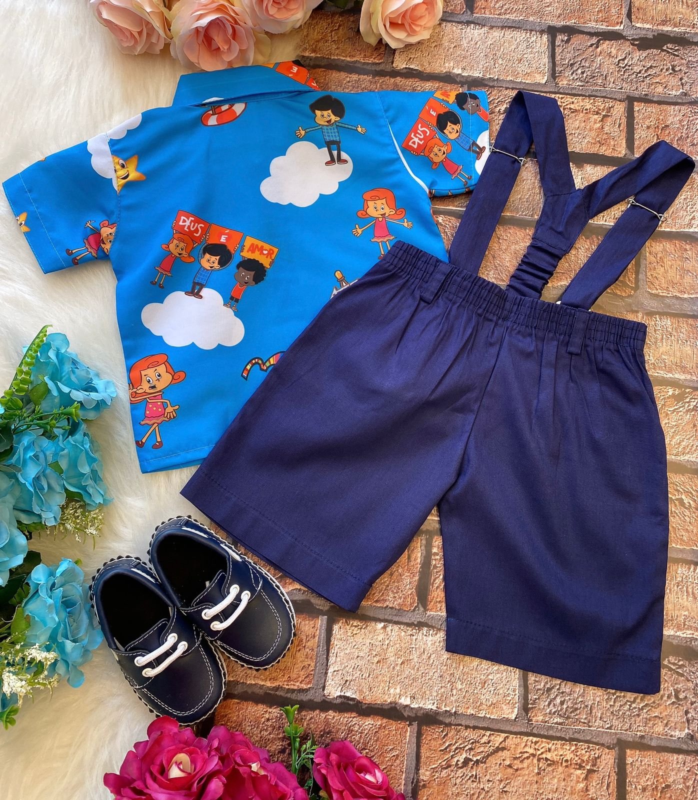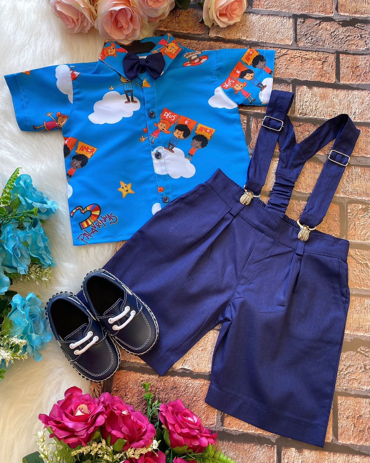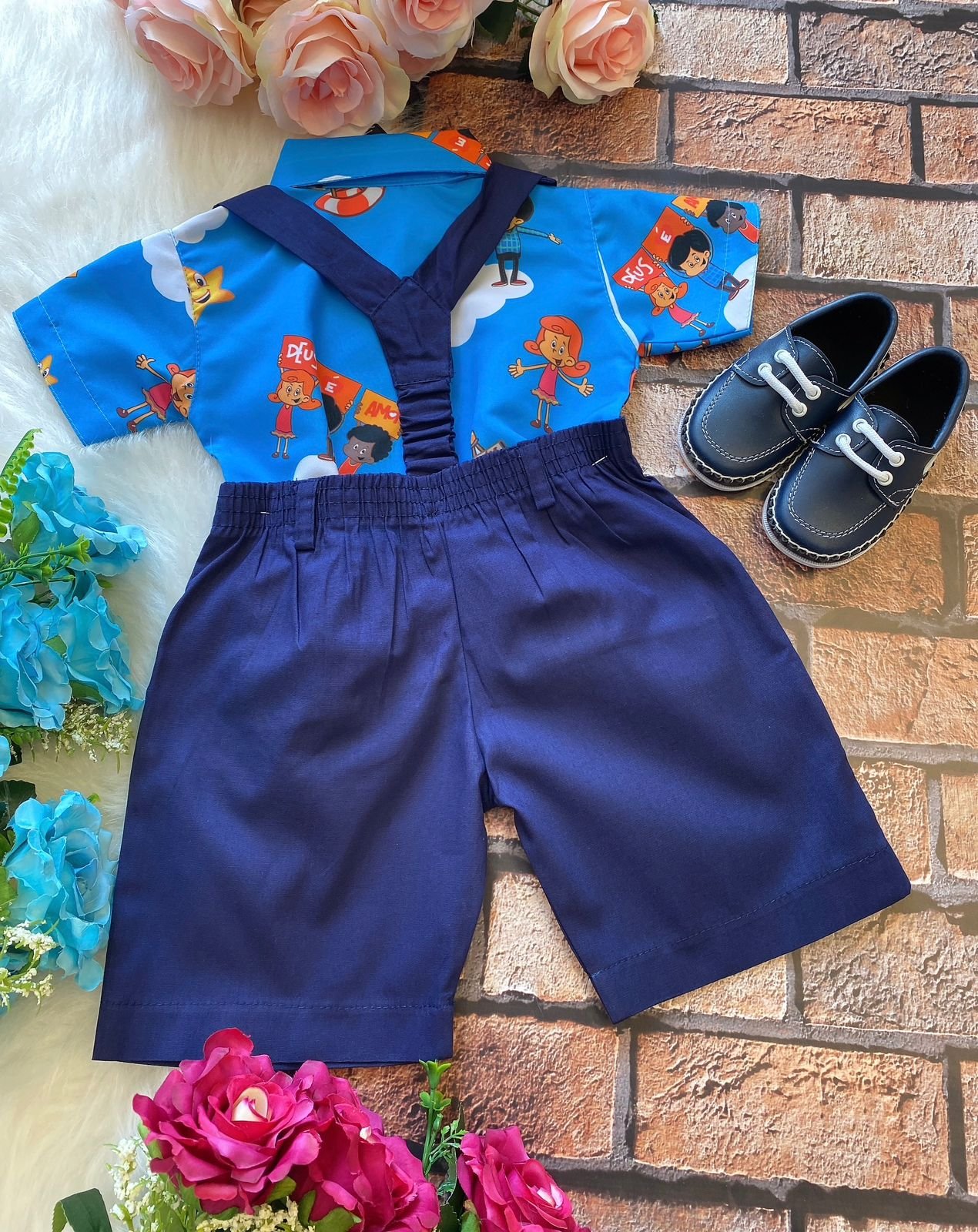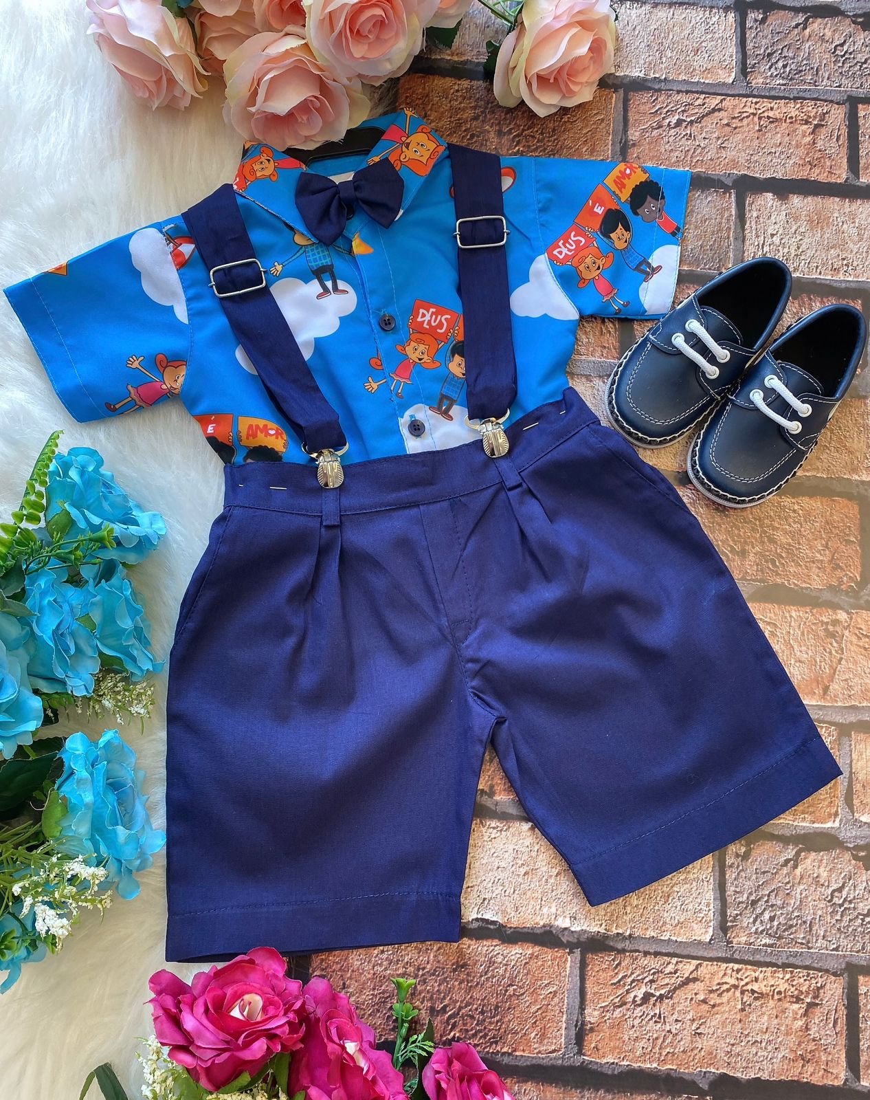 Conjunto composto por: Camisa Personagem, Shorts com suspensorio e gravata borboleta na cor Azul Royal.