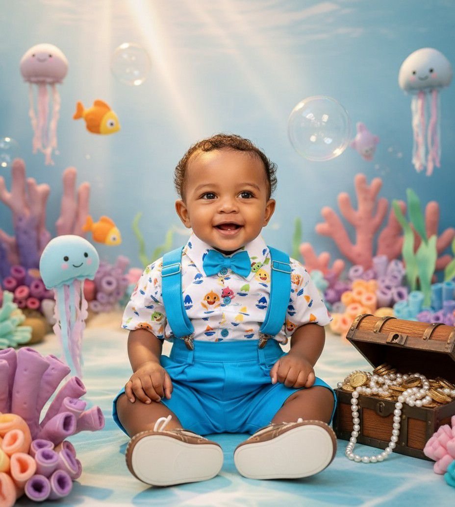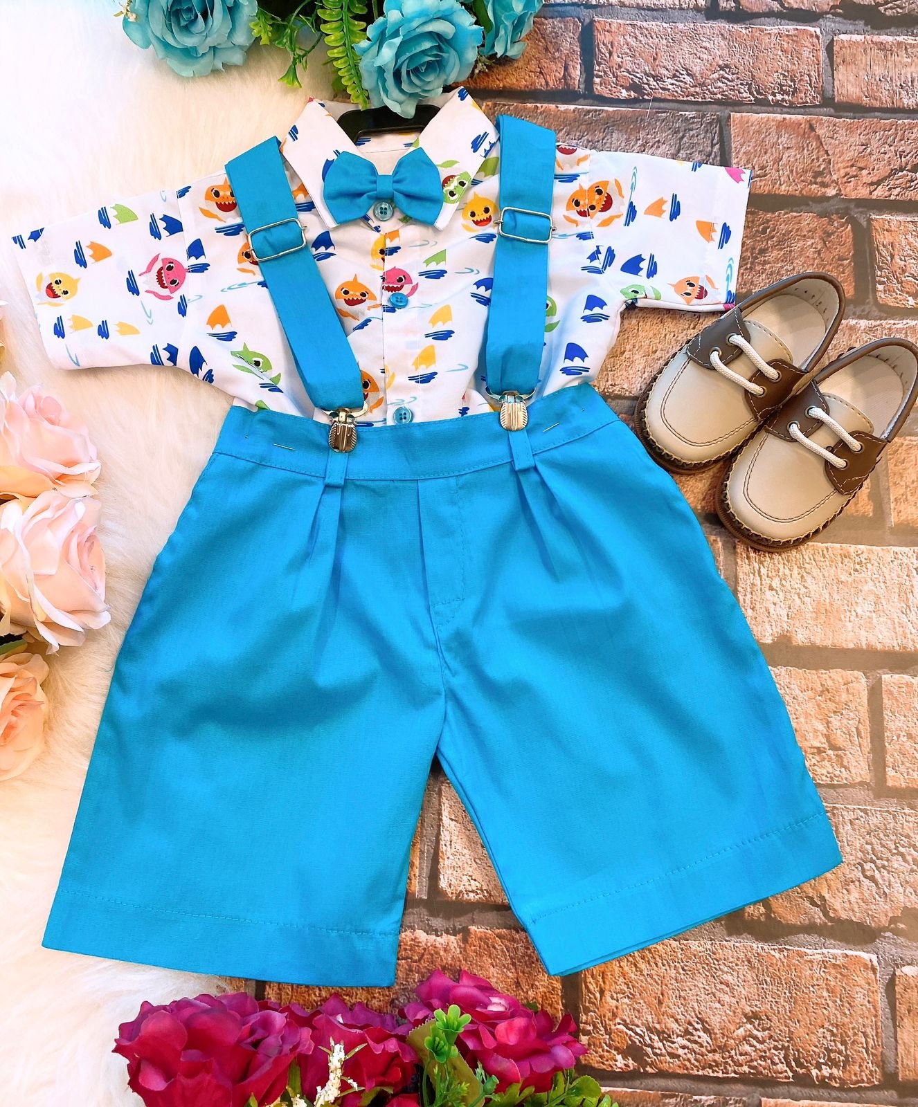 Conjunto composto por: Camisa Personagem, Shorts com suspensorio e gravata borboleta na cor Azul Tiffany.