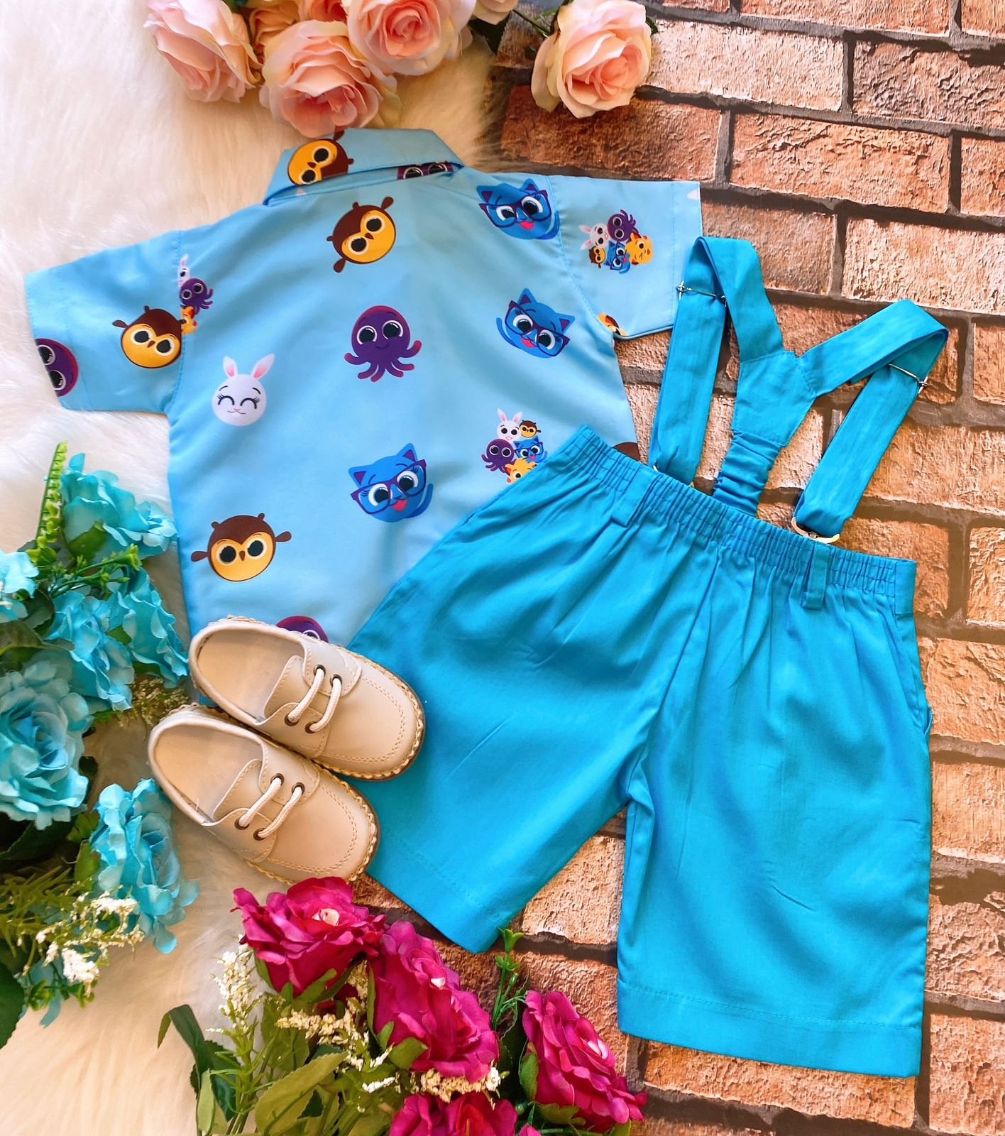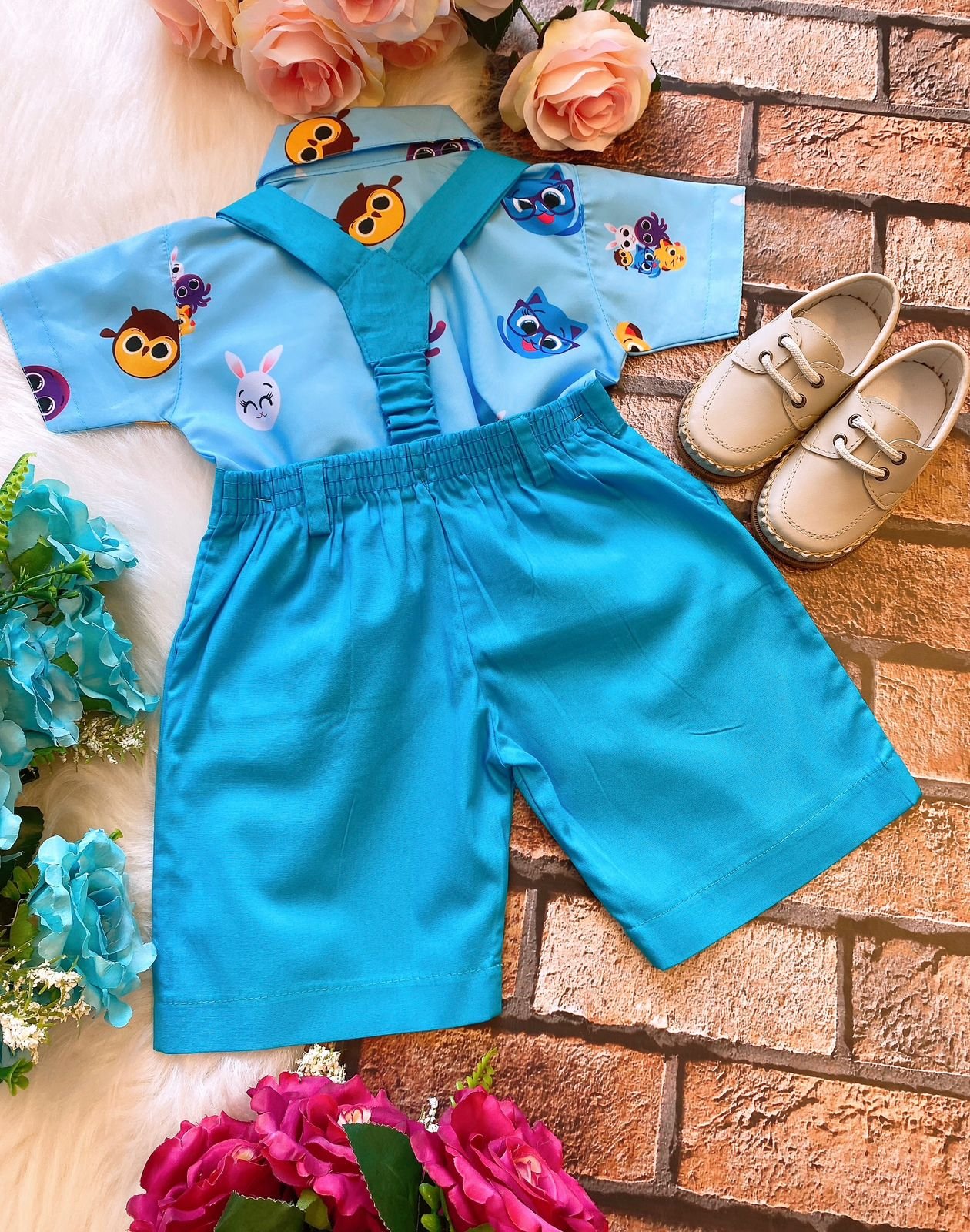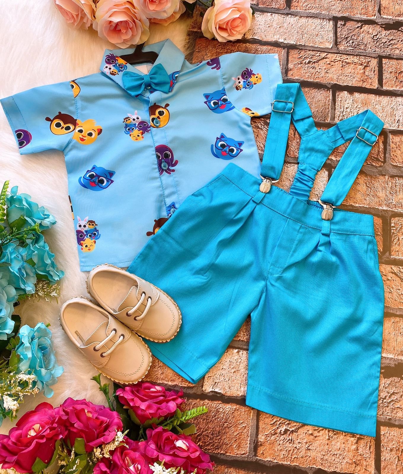 Conjunto composto por: Camisa Personagem, Shorts com suspensorio e gravata borboleta na cor Azul Tiffany.