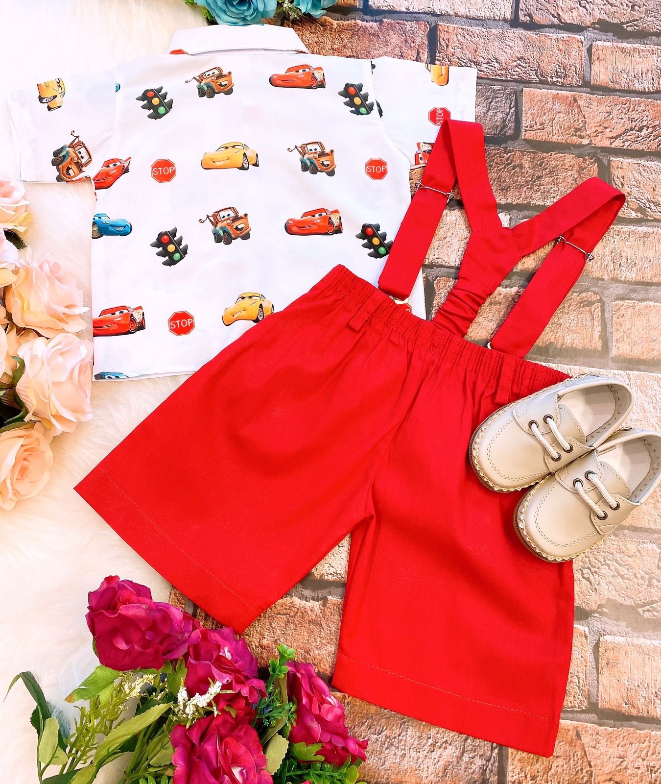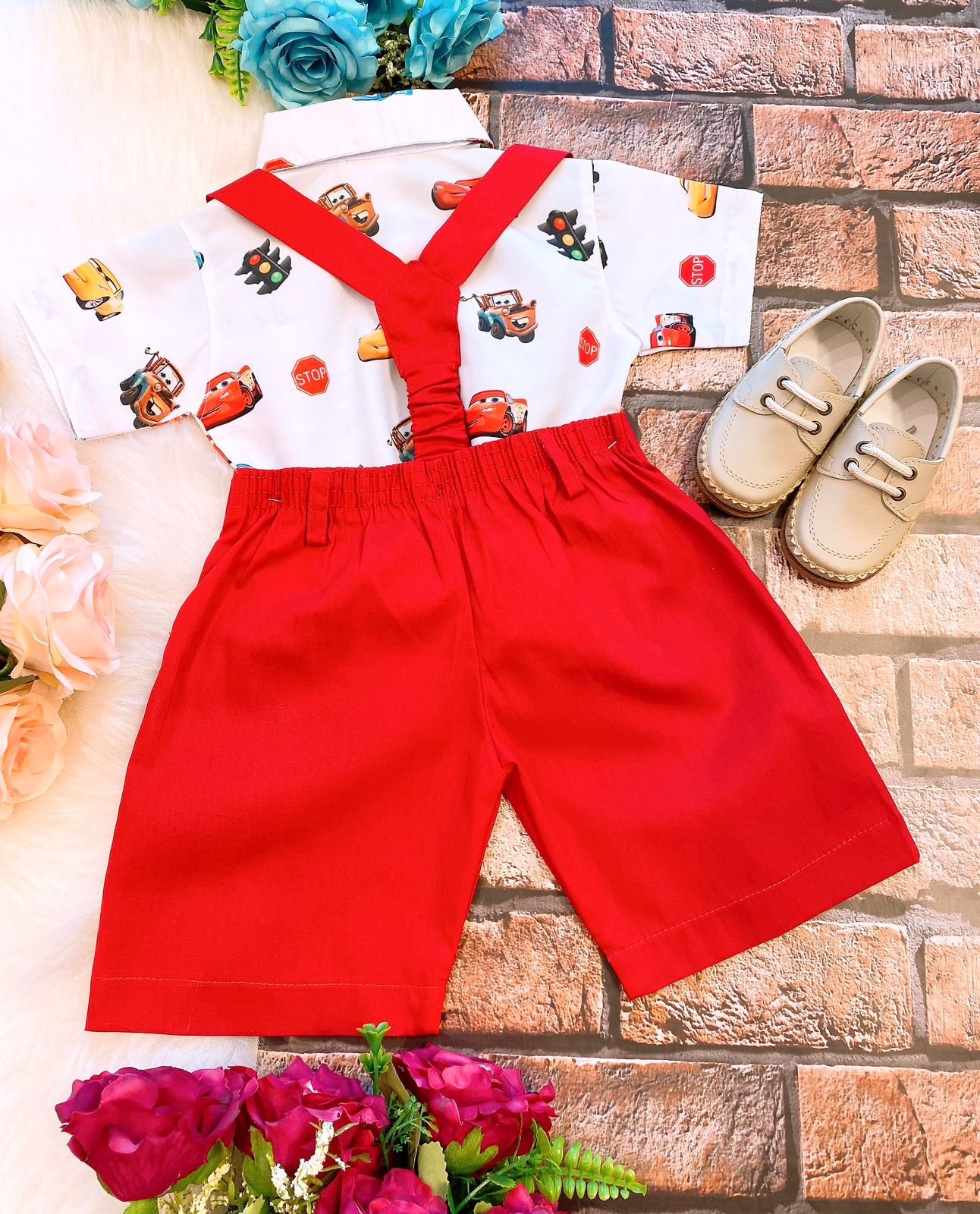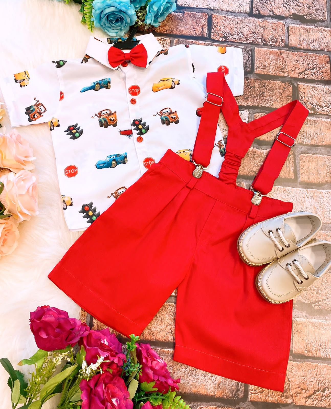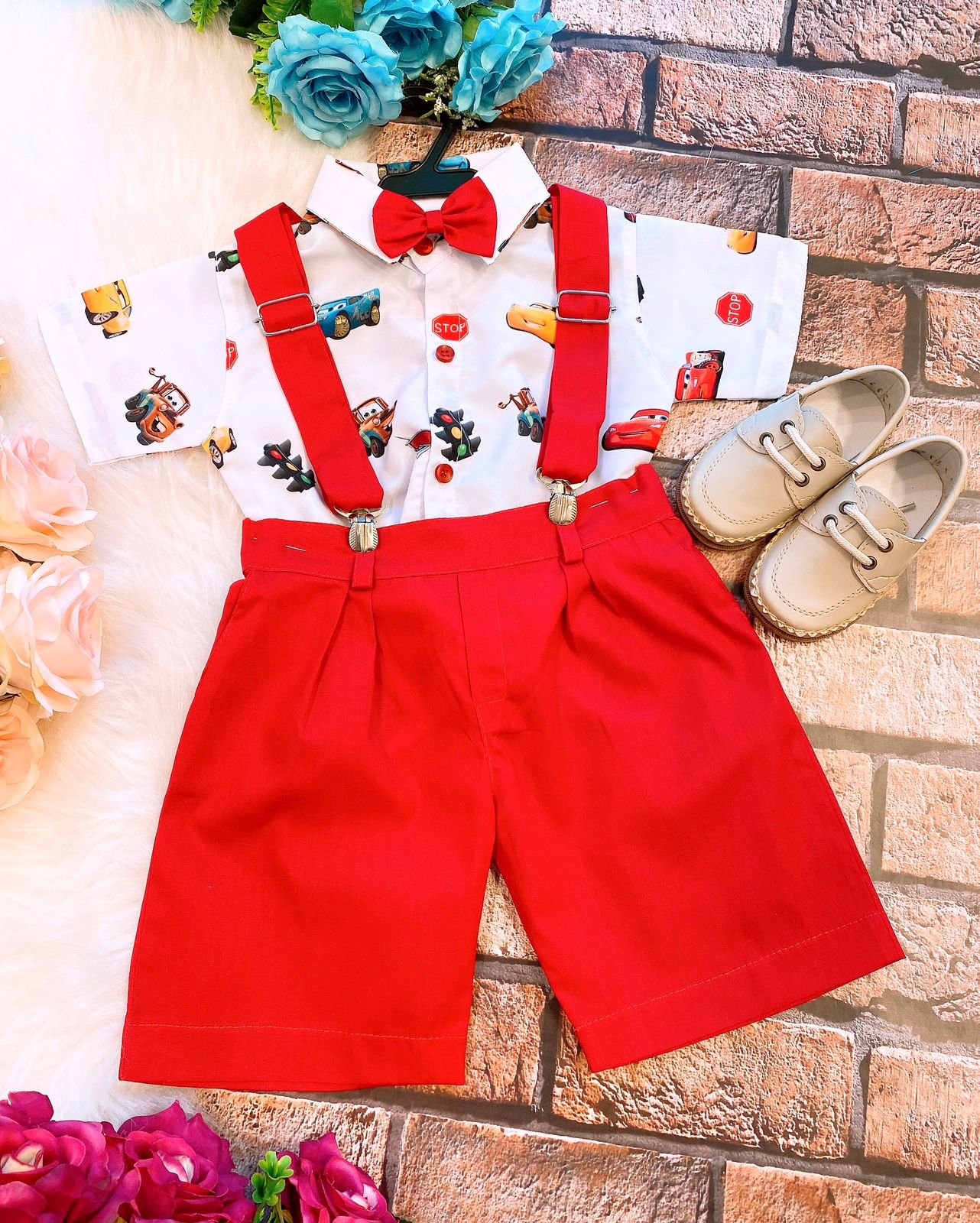 Conjunto composto por: Camisa Personagem, Shorts com suspensorio e gravata borboleta na cor.
