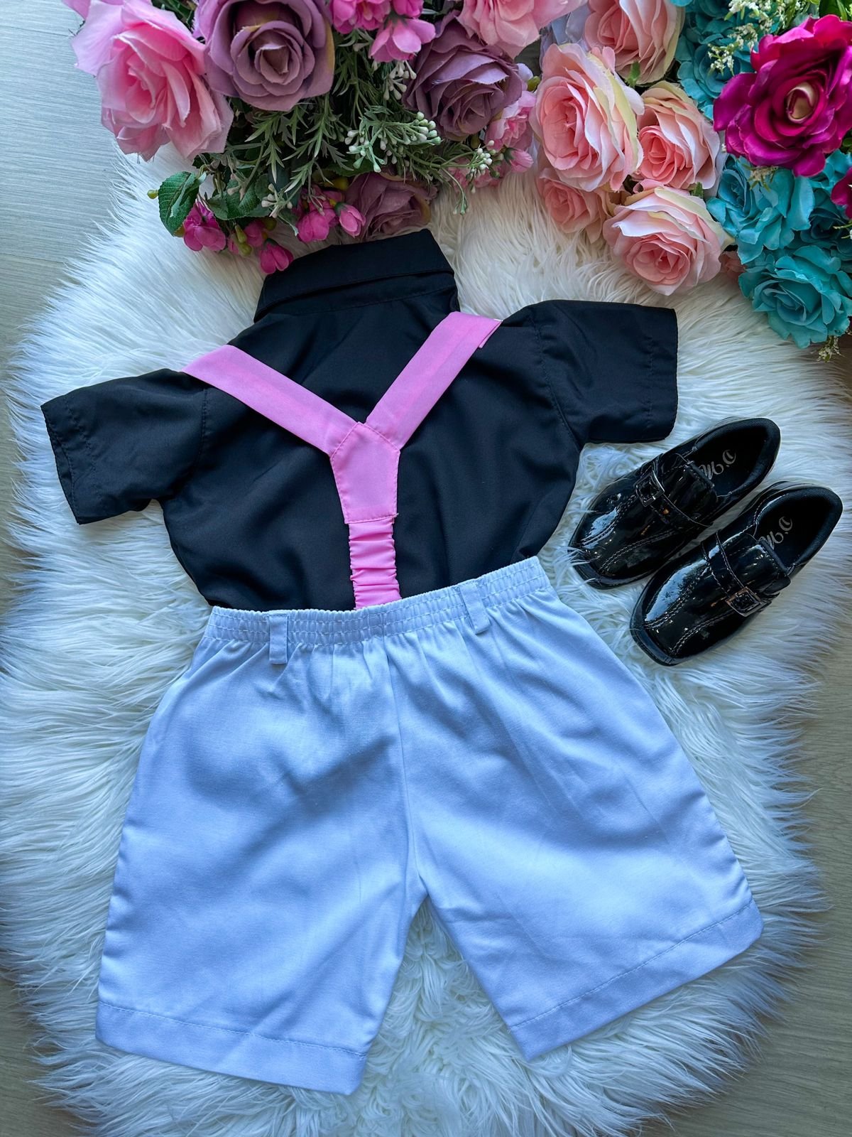 Conjunto composto por: Camisa Preta, Shorts com suspensorio e gravata borboleta.