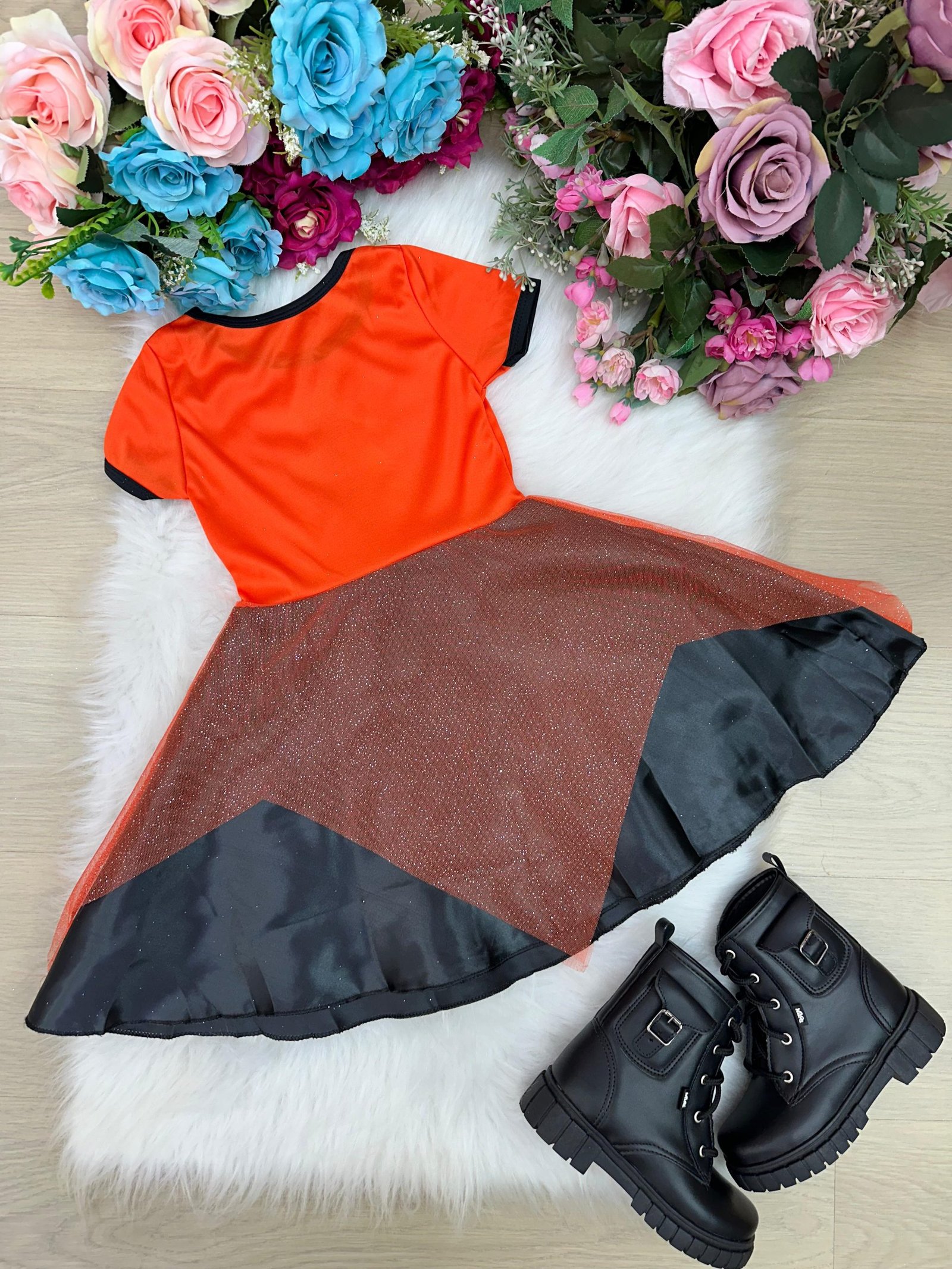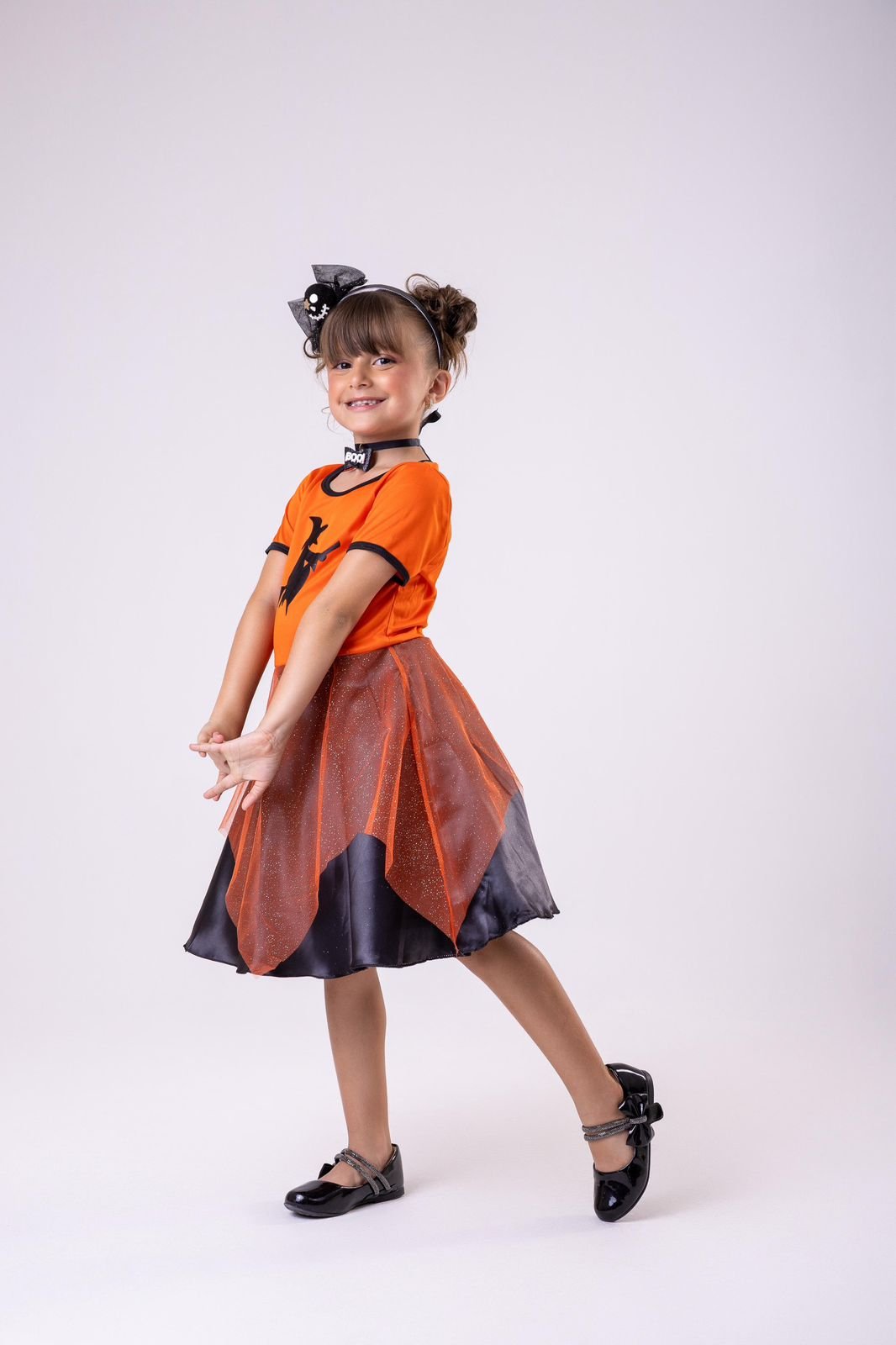O modelo traz a magia da data com estampa de bruxinha voando na parte superior e saia de tule laranja com brilho, sobreposta a tecido preto que dá um charme extra. O acabamento com gola preta e mangas curtinhas deixa o look ainda mais gracioso e confortável.