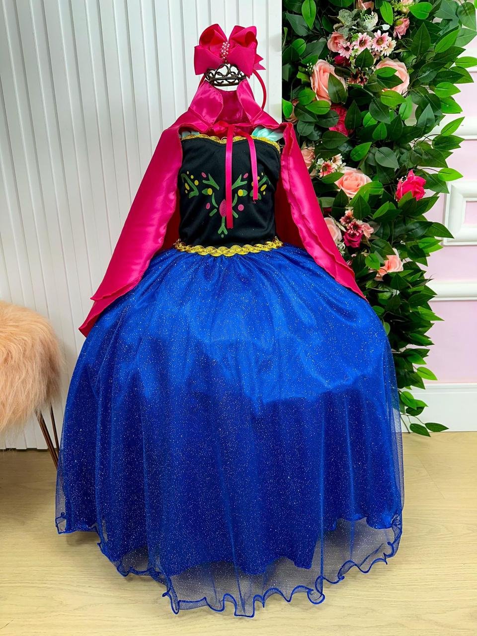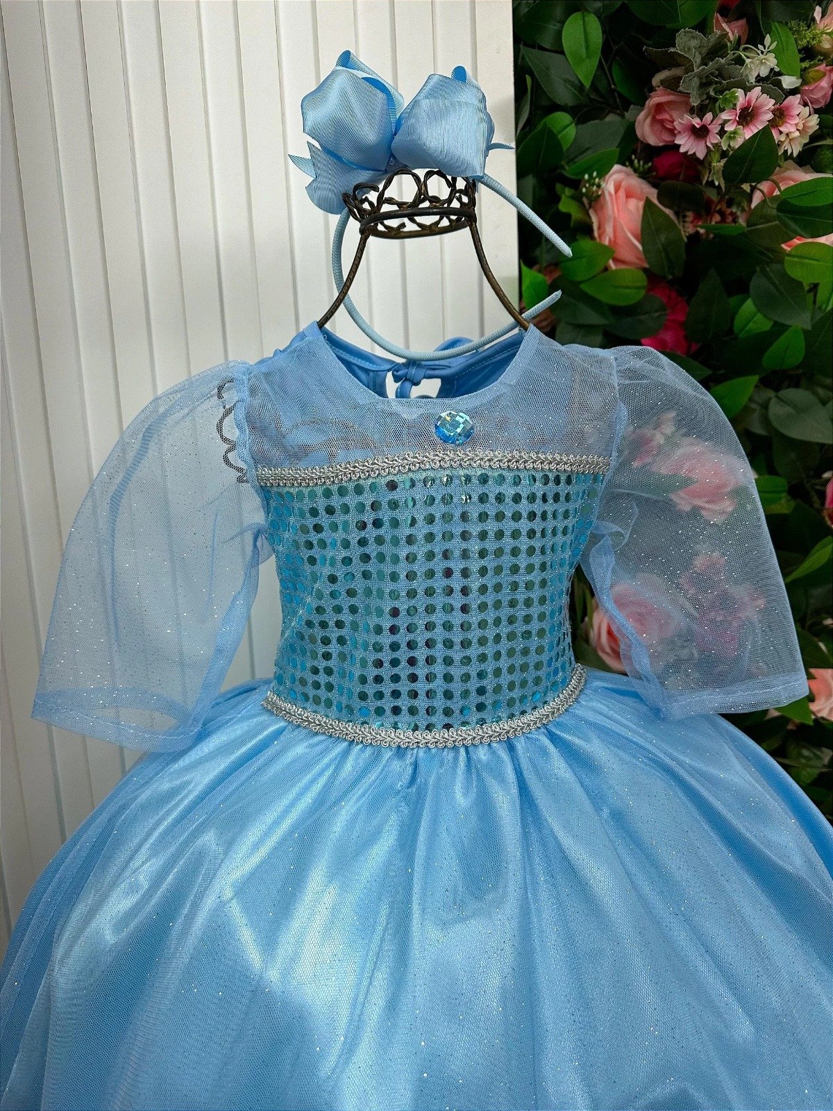 Vestido confeccionado em cetim com saia em tule glitter, proporcionando brilho delicado e visual encantador. A peça acompanha capa temática, completando o look para uma verdadeira aventura congelante.