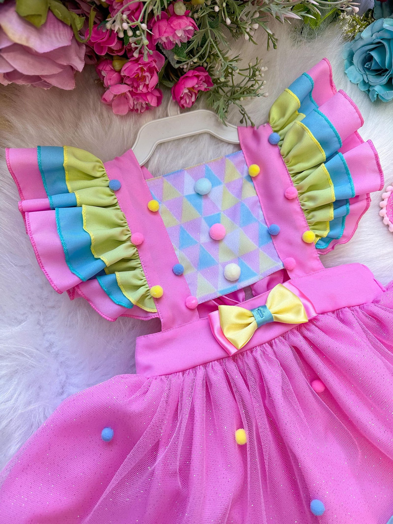 Confeccionado em tecido misto possui forro em poliéster e algodão para não incomodar a criança e proporcionando um caimento incrível e sofisticado, possui gola redonda, comprimento médio, mangas curtas, possui elástico nas costas para melhor ajuste, acabamento com lindo laço na parte posterior do vestido completa o look dos sonhos!