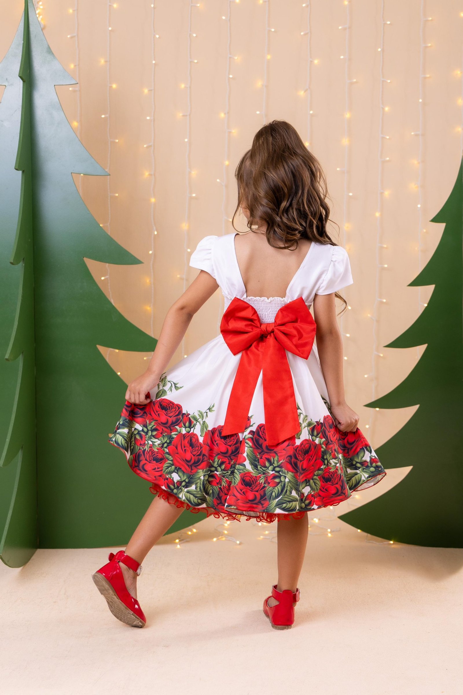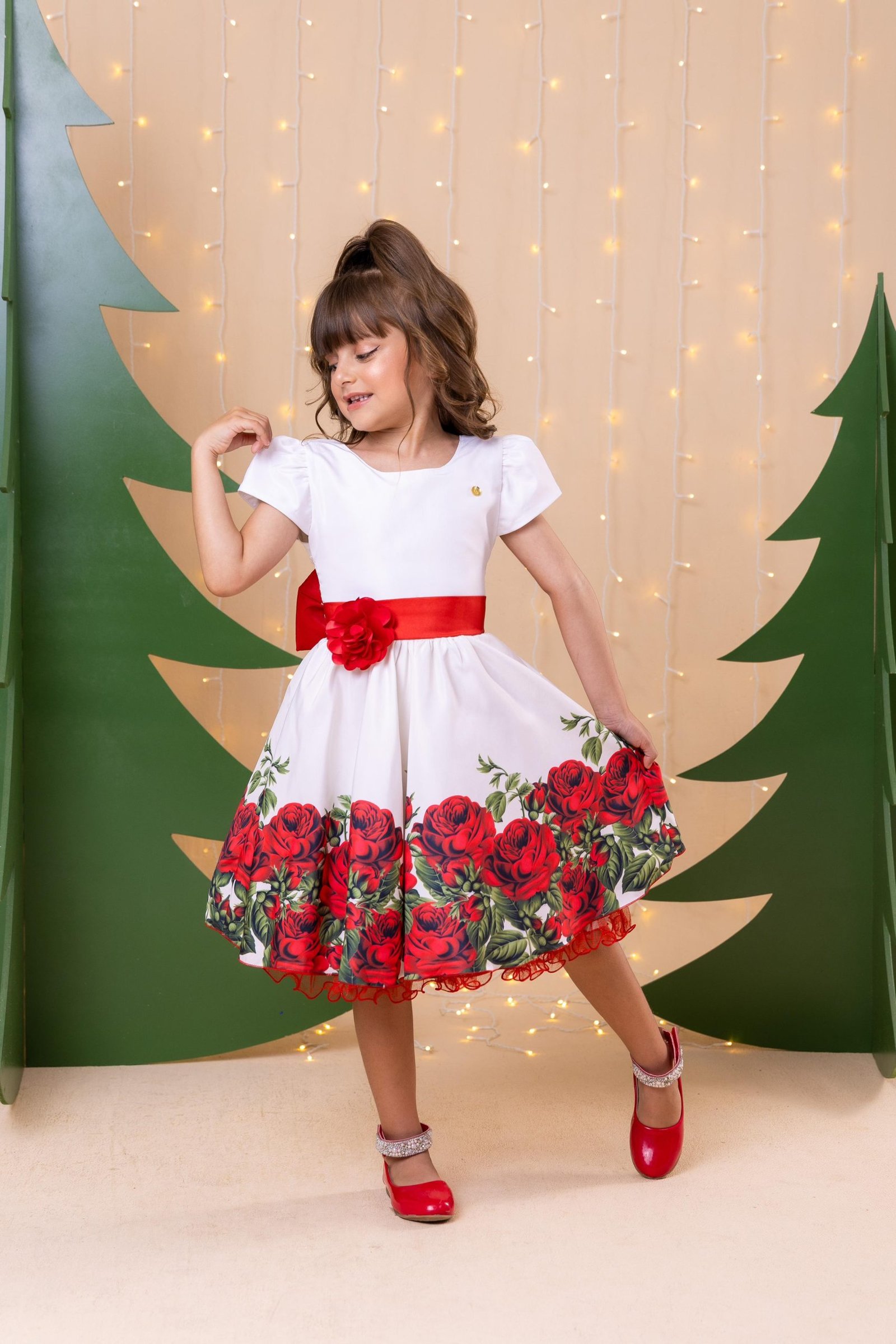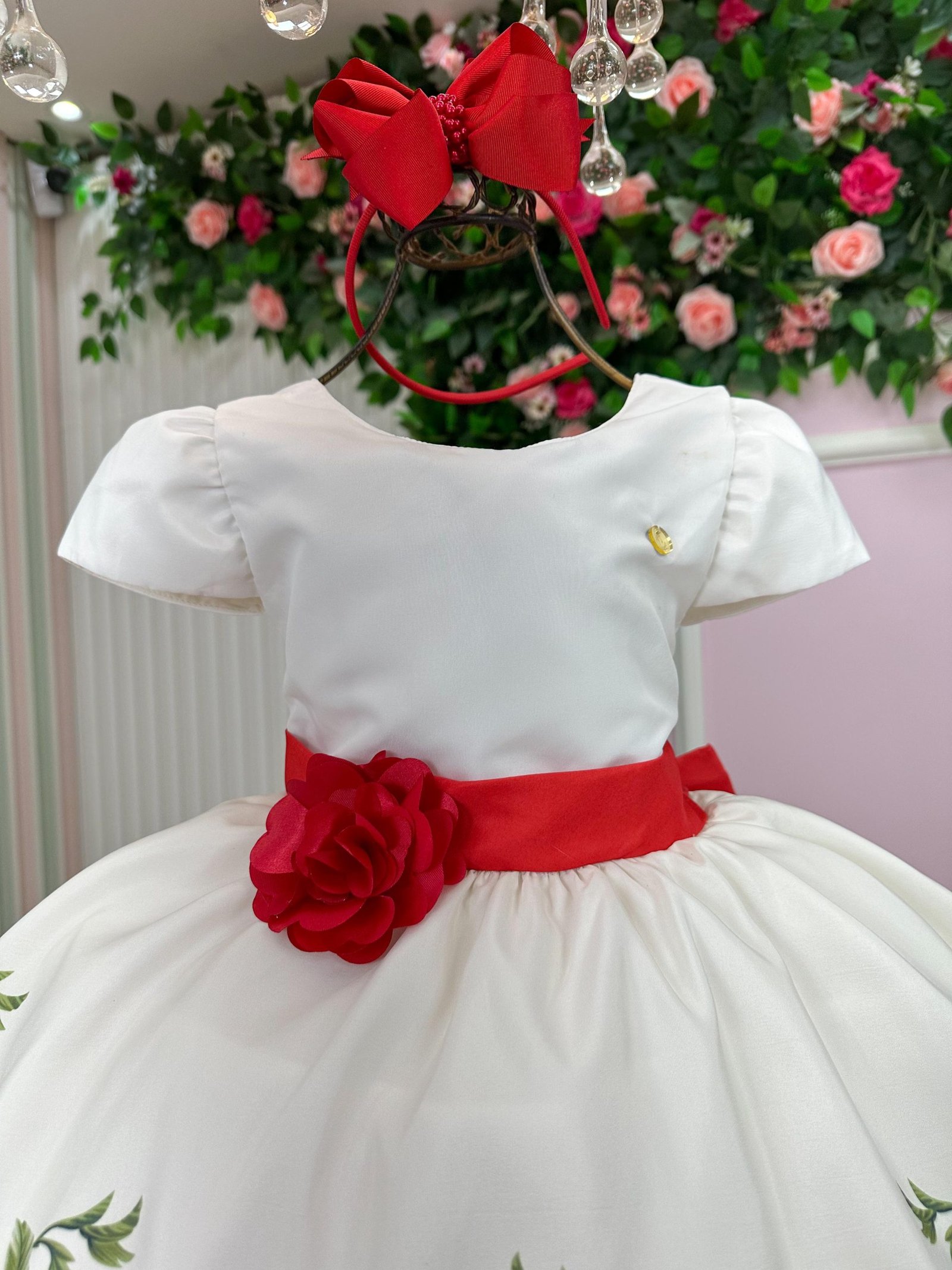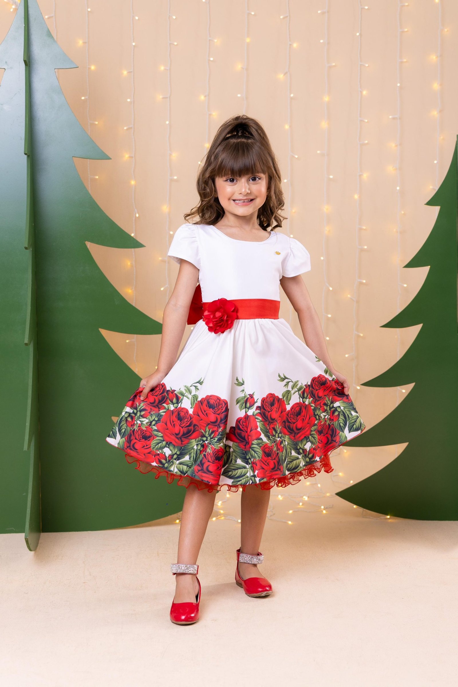 Confeccionado em tecido misto possui forro em poliéster e algodão para não incomodar a criança e proporcionando um caimento incrível e sofisticado, possui gola redonda, comprimento médio, mangas curtas, possui elástico nas costas para melhor ajuste, acabamento com lindo laço na parte posterior do vestido completa o look dos sonhos!