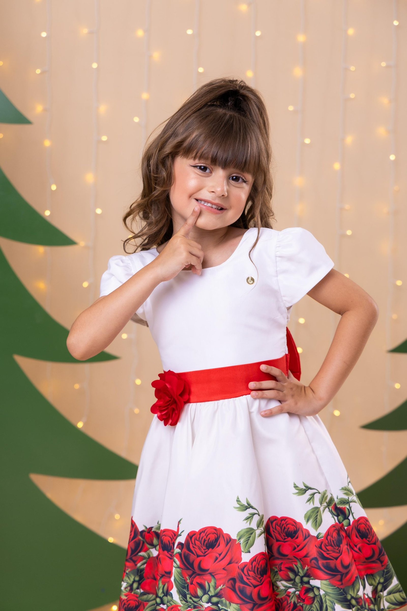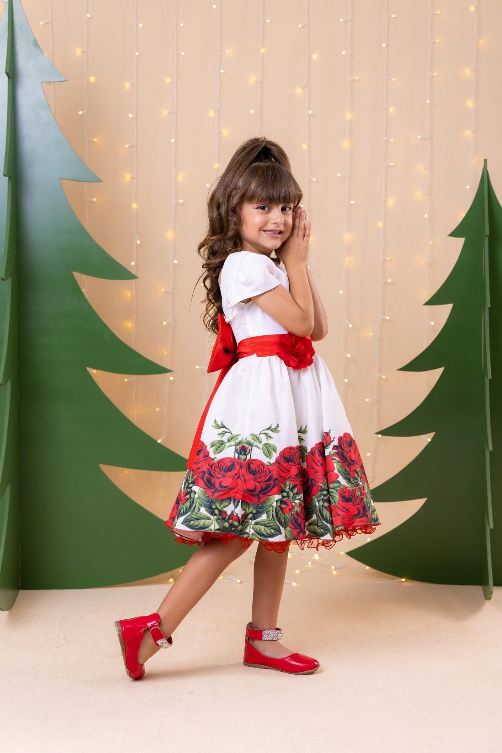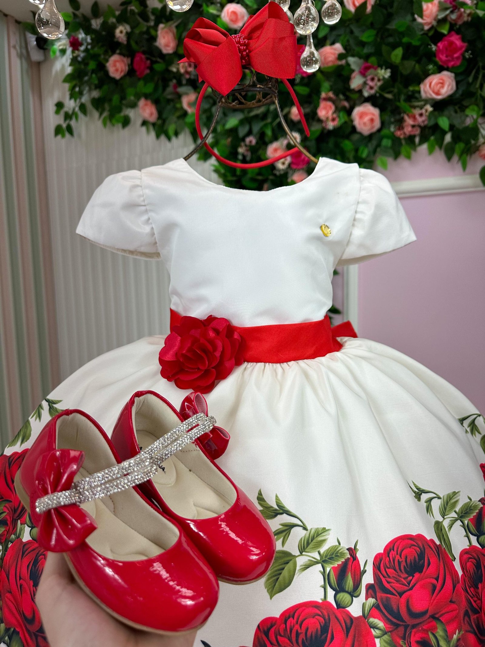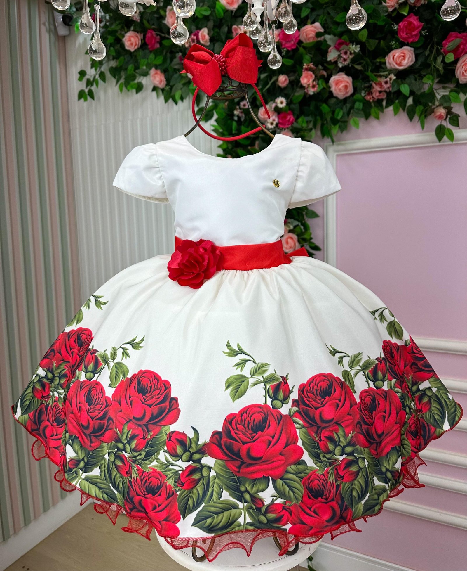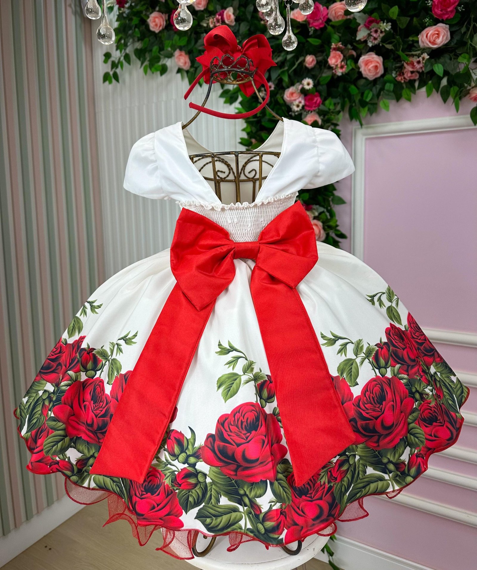 Confeccionado em tecido misto possui forro em poliéster e algodão para não incomodar a criança e proporcionando um caimento incrível e sofisticado, possui gola redonda, comprimento médio, mangas curtas, possui elástico nas costas para melhor ajuste, acabamento com lindo laço na parte posterior do vestido completa o look dos sonhos!