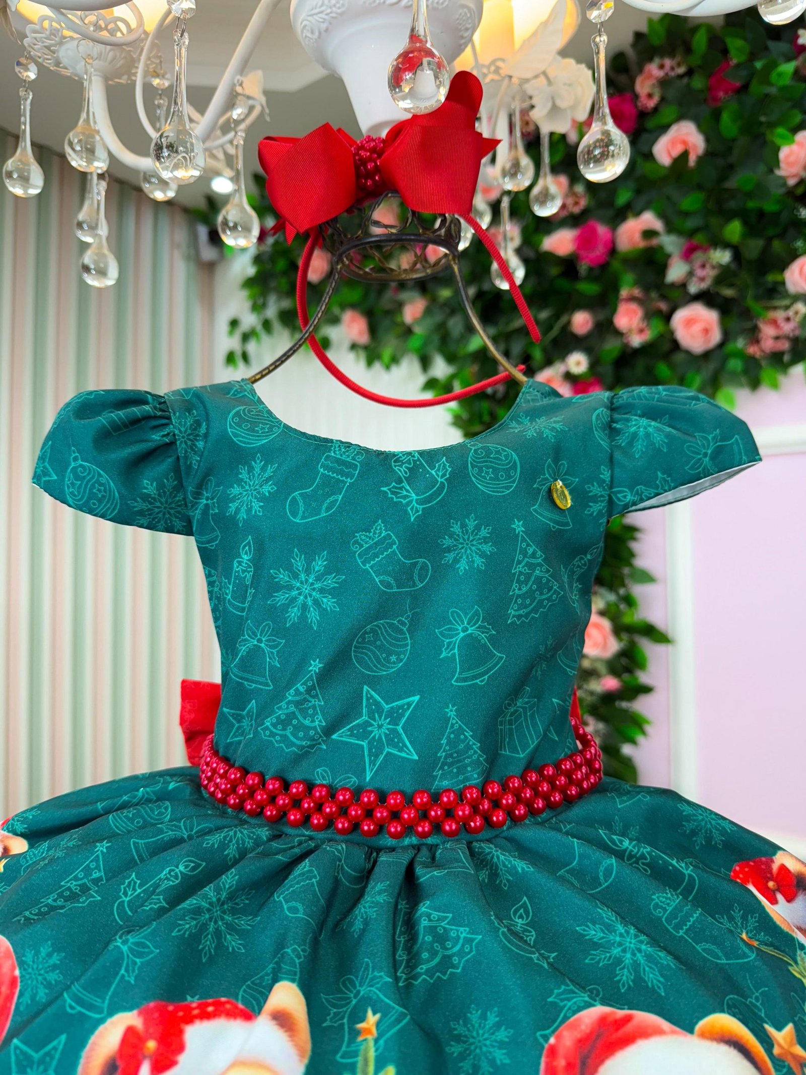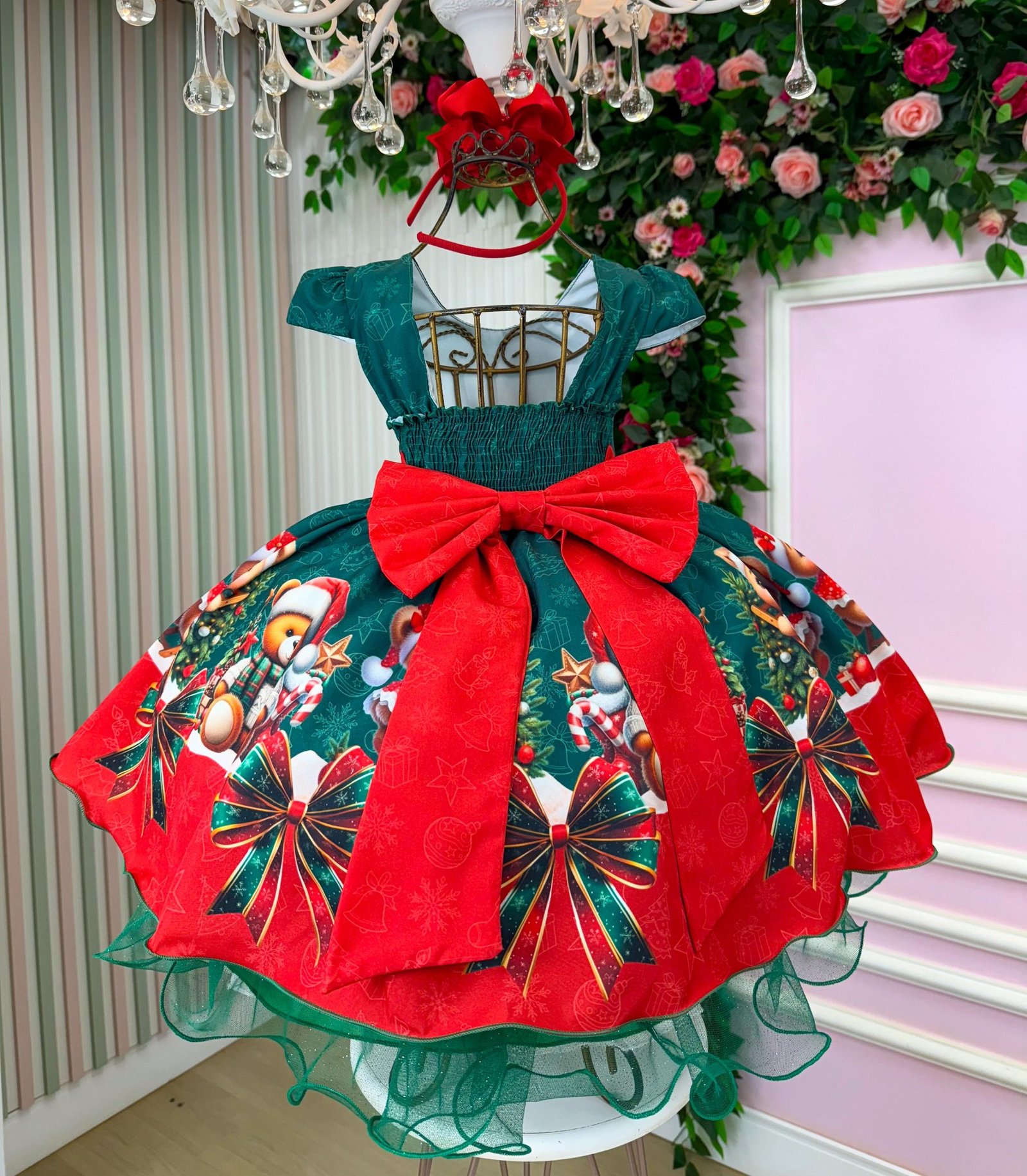 • Laço vermelho volumoso na parte de trás, que garante um acabamento delicado e elegante.