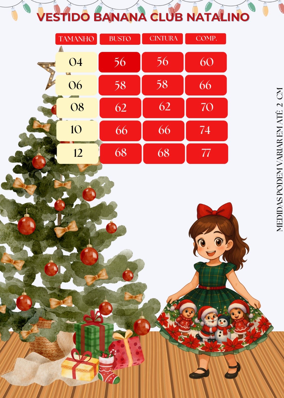 • As medidas podem variar em até 2cm. Recomendamos sempre consultar a tabela de medidas antes da compra para evitar erros.