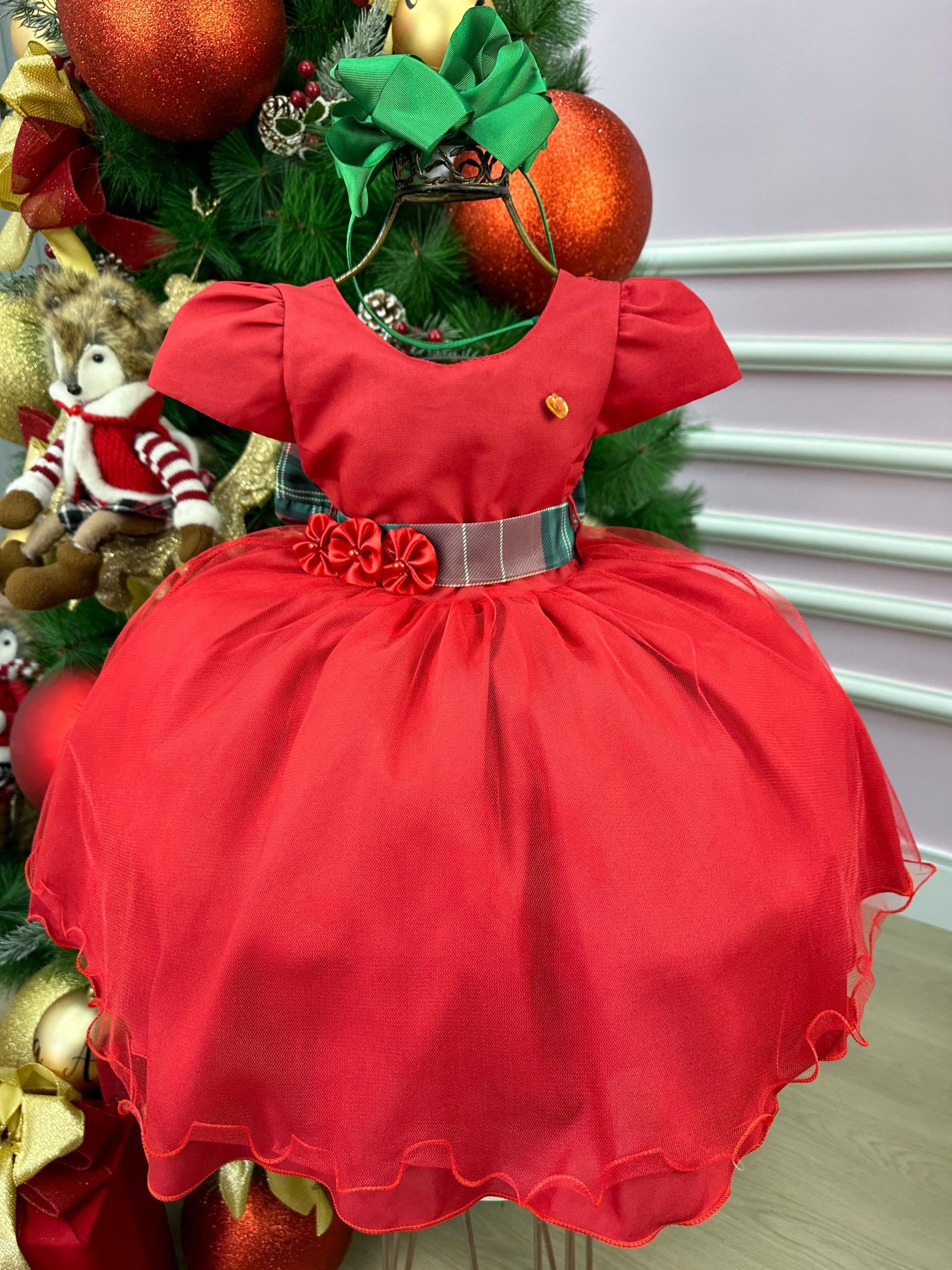 Confeccionado em tecido misto possui forro em poliéster e algodão para não incomodar a criança e proporcionando um caimento incrível e sofisticado, possui gola redonda,renda de flores e apliques de strass no peito, comprimento médio, mangas curtas, possui elástico nas costas para melhor ajuste, acabamento com lindo laço na parte posterior do vestido completa o look dos sonhos!