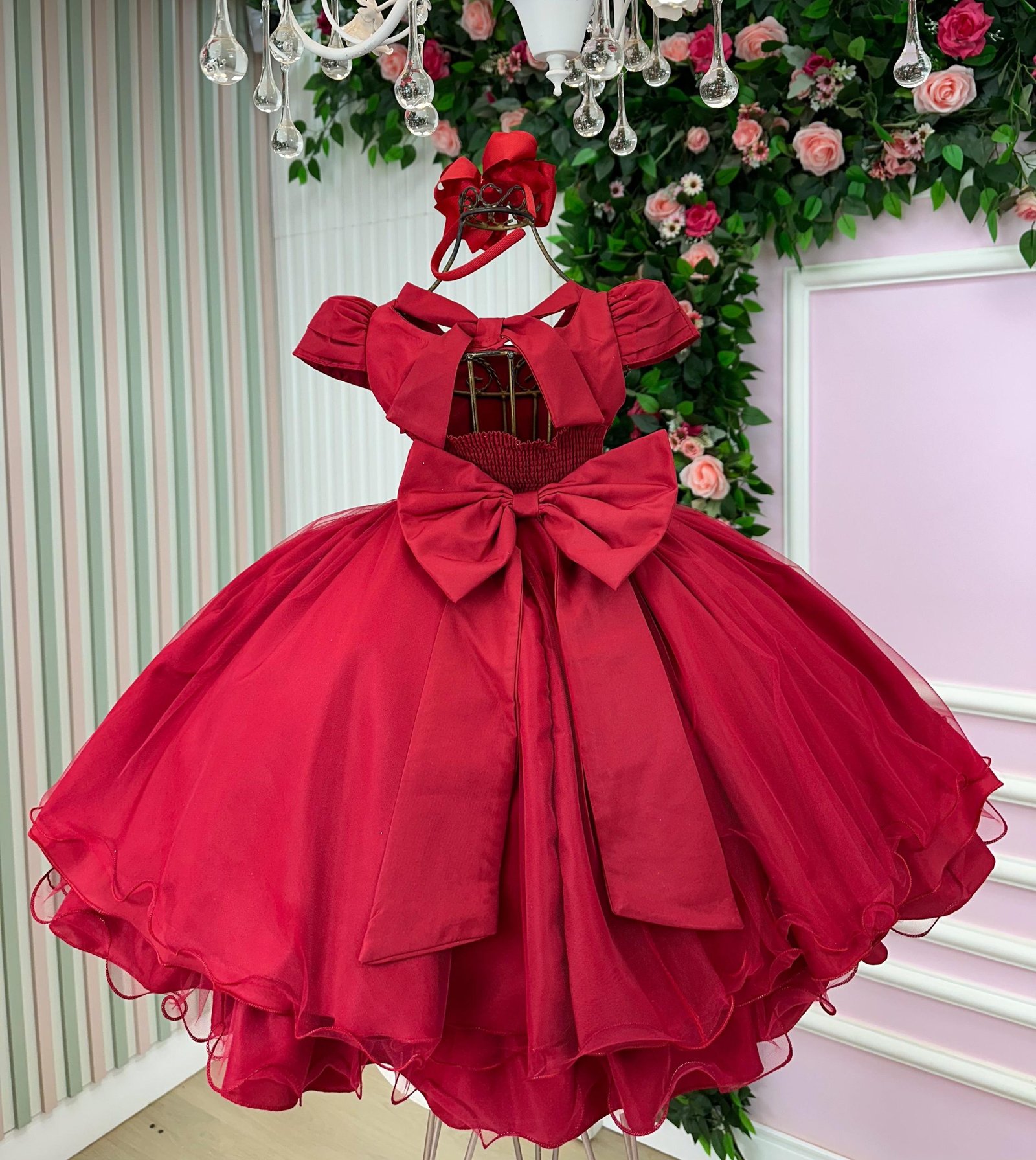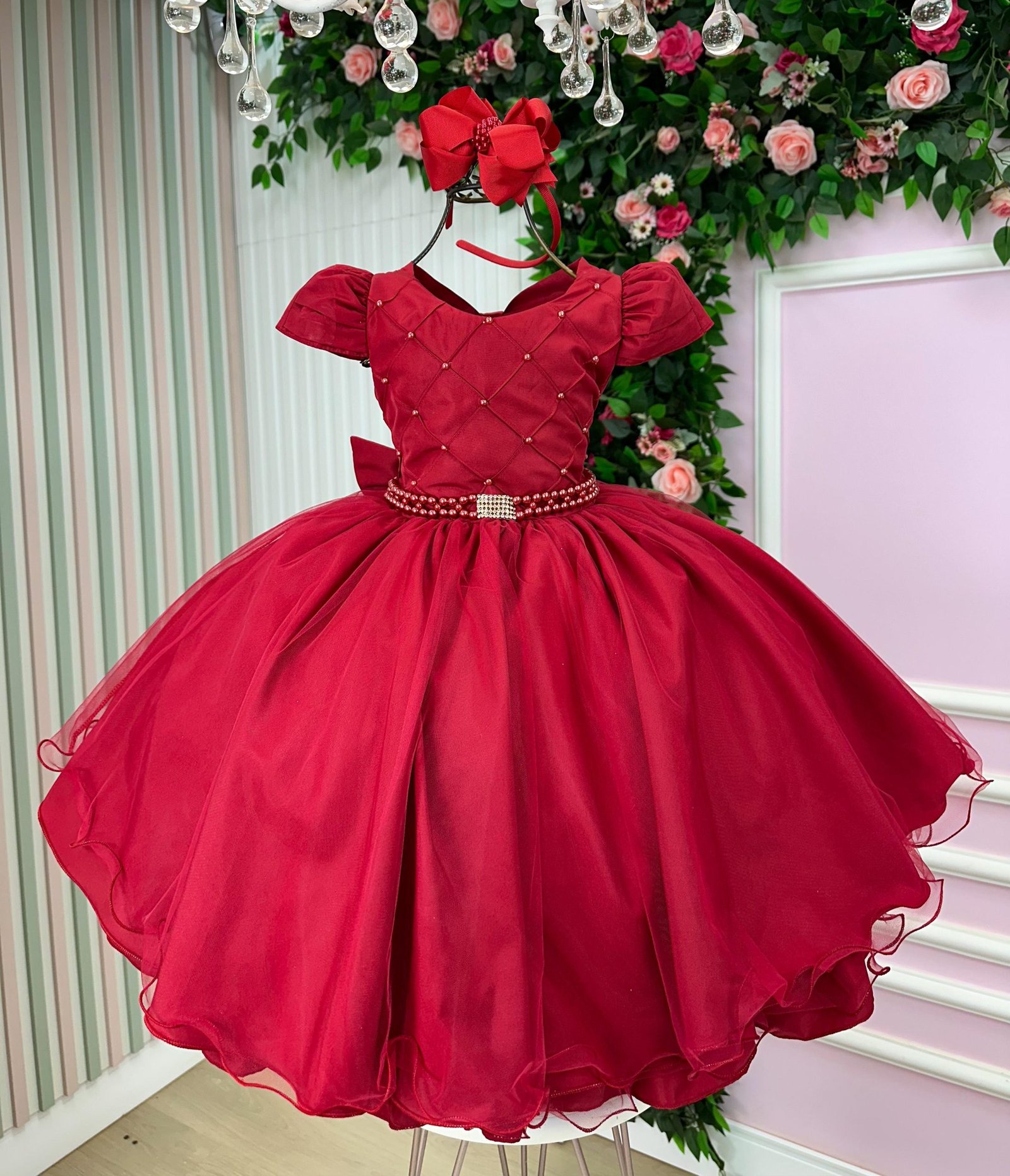 Confeccionado em tecido misto possui forro em poliéster e algodão para não incomodar a criança e proporcionando um caimento incrível e sofisticado, possui gola redonda, comprimento médio, mangas curtas, possui elástico nas costas para melhor ajuste, acabamento com lindo laço na parte posterior do vestido completa o look dos sonhos!