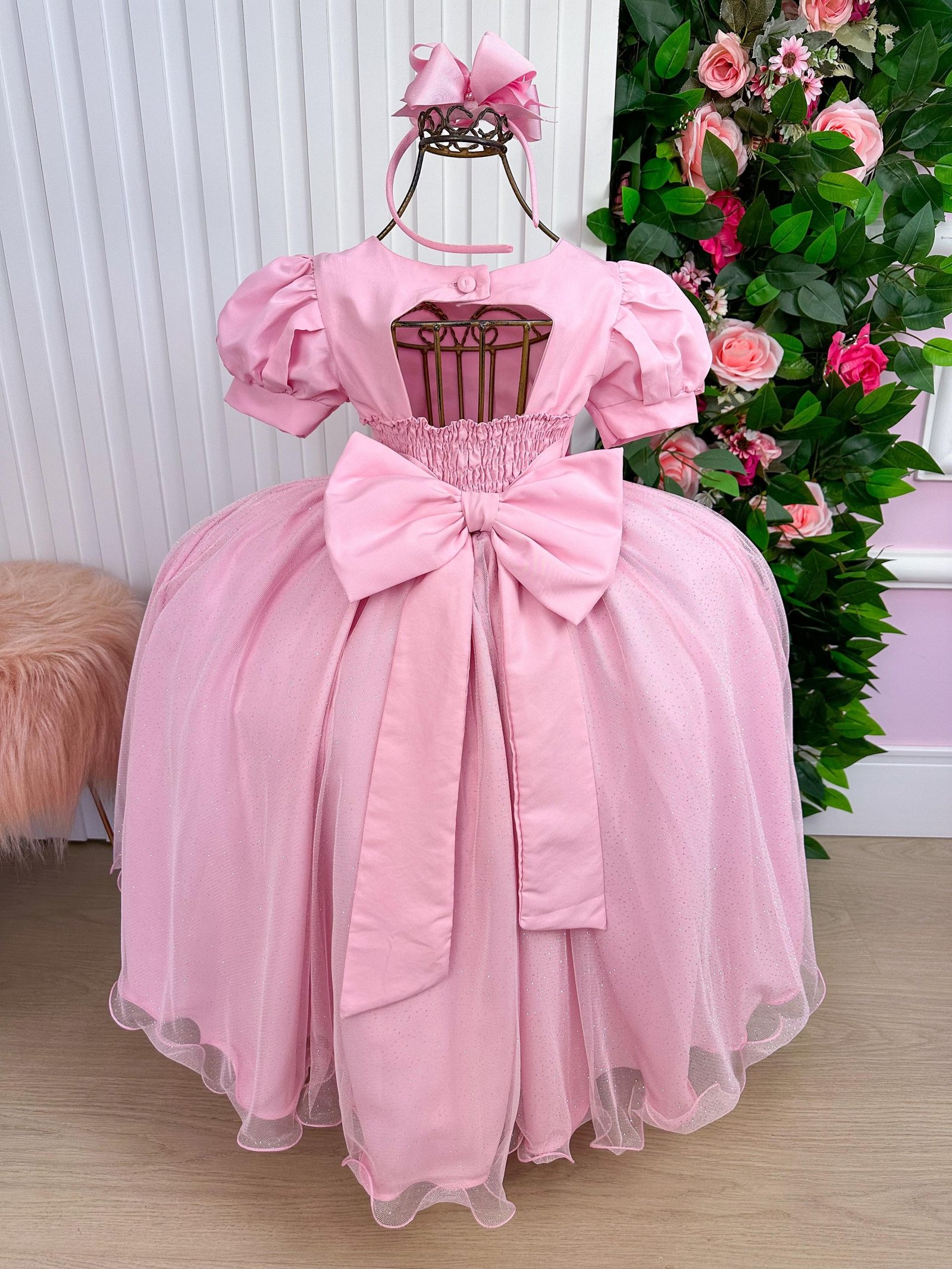 Com saia ampla em camadas de tule rosado com brilho suave, o modelo cria um visual leve e majestoso. O corpete estruturado traz fitas douradas cruzadas e flores de cetim aplicadas nas mangas bufantes e na cintura, adicionando um toque delicado e sofisticado.