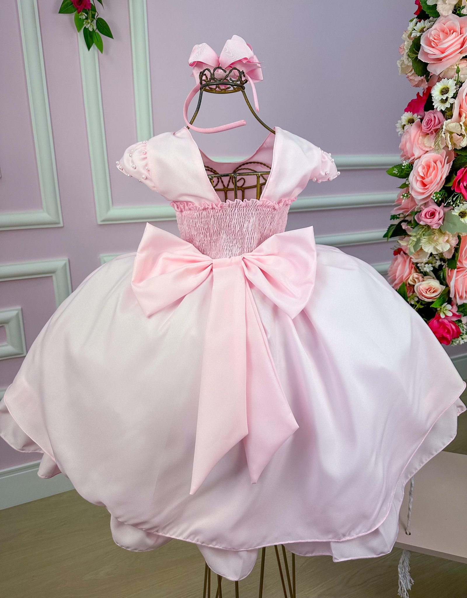 Confeccionado em tecido misto possui forro em poliéster e algodão para não incomodar a criança e proporcionando um caimento incrível e sofisticado, possui gola redonda, comprimento médio, mangas curtas, possui elástico nas costas para melhor ajuste, e acabamento com lindo laço na parte posterior do vestido completa o look dos sonhos!