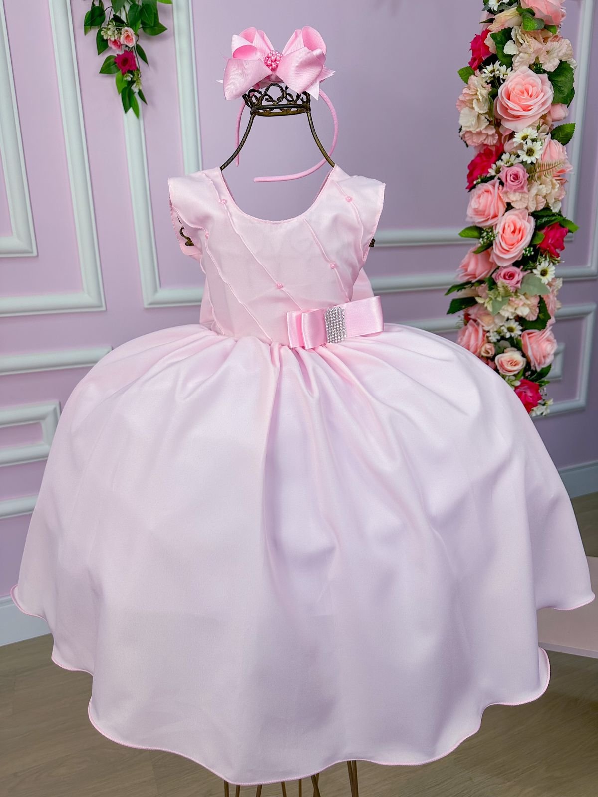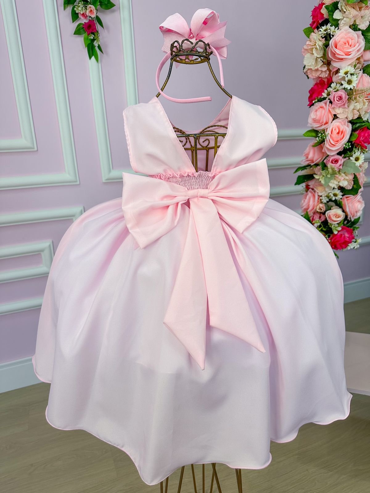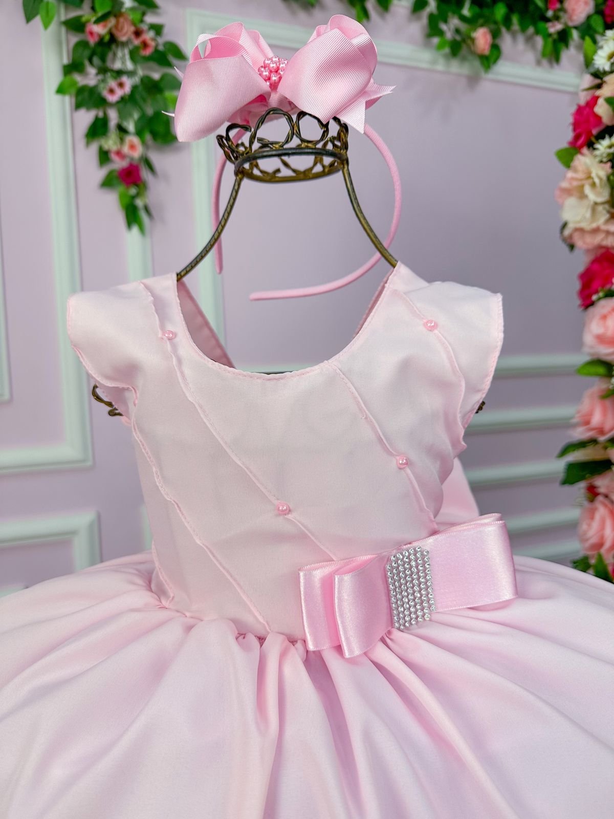 Confeccionado em tecido misto possui forro em poliéster e algodão para não incomodar a criança e proporcionando um caimento incrível e sofisticado, possui gola redonda, comprimento médio, mangas curtas, possui elástico nas costas para melhor ajuste, e acabamento com lindo laço na parte posterior do vestido completa o look dos sonhos!