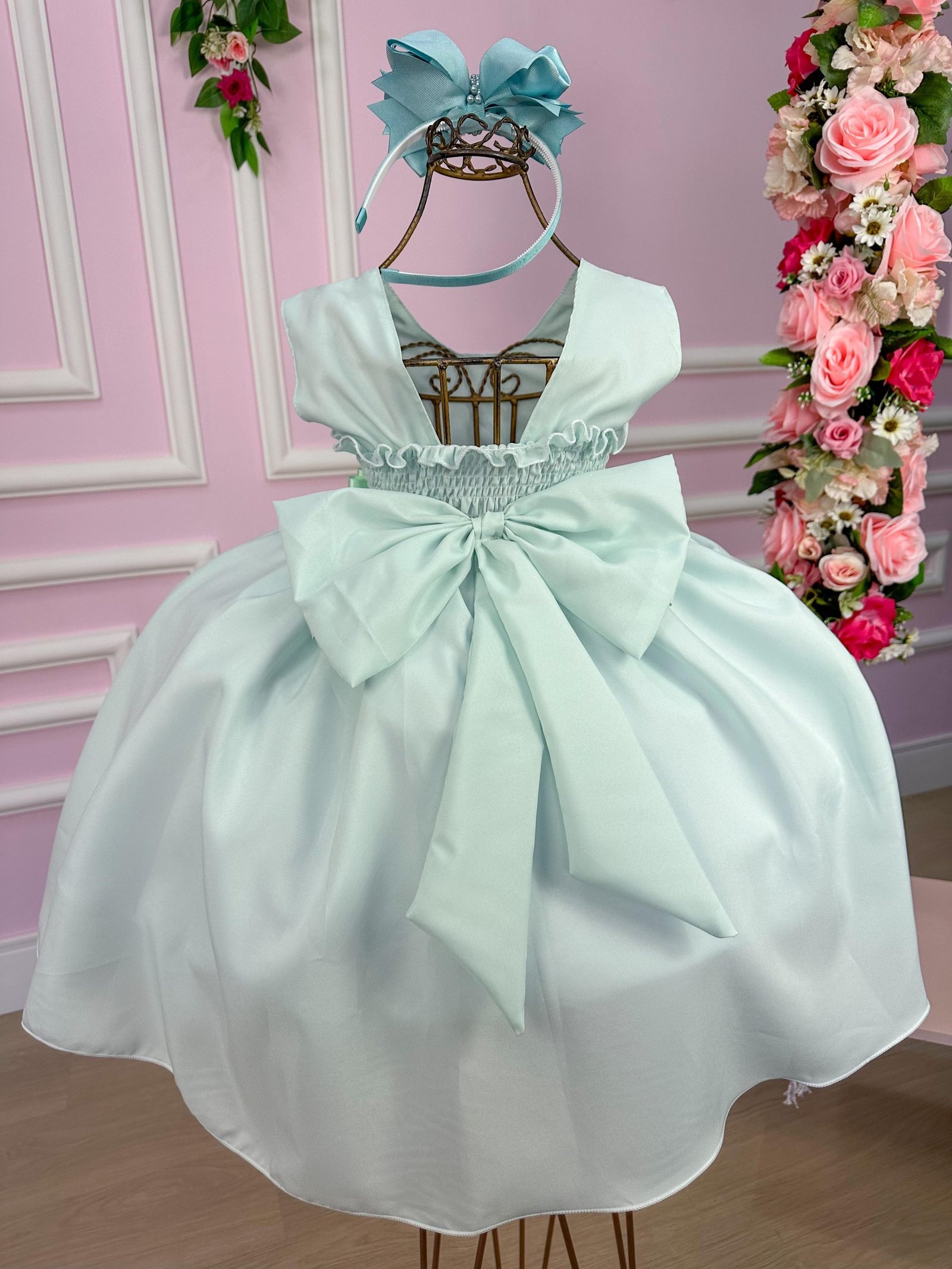 Confeccionado em tecido misto possui forro em poliéster e algodão para não incomodar a criança e proporcionando um caimento incrível e sofisticado, possui gola redonda, comprimento médio, mangas curtas, possui elástico nas costas para melhor ajuste, e acabamento com lindo laço na parte posterior do vestido completa o look dos sonhos!