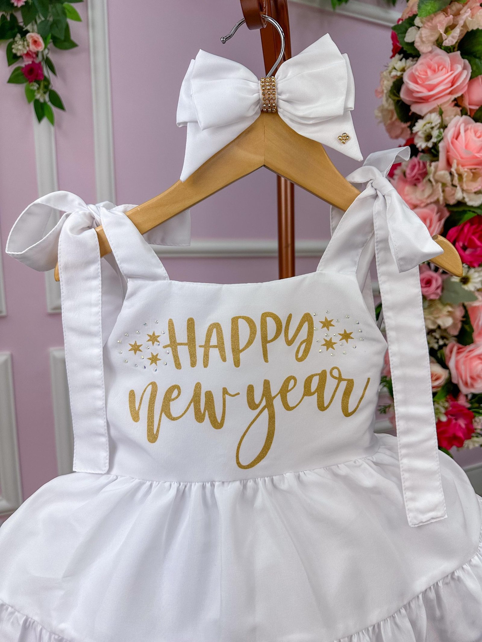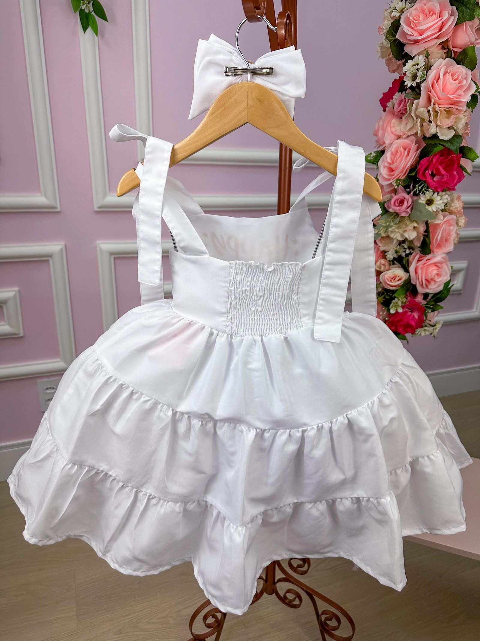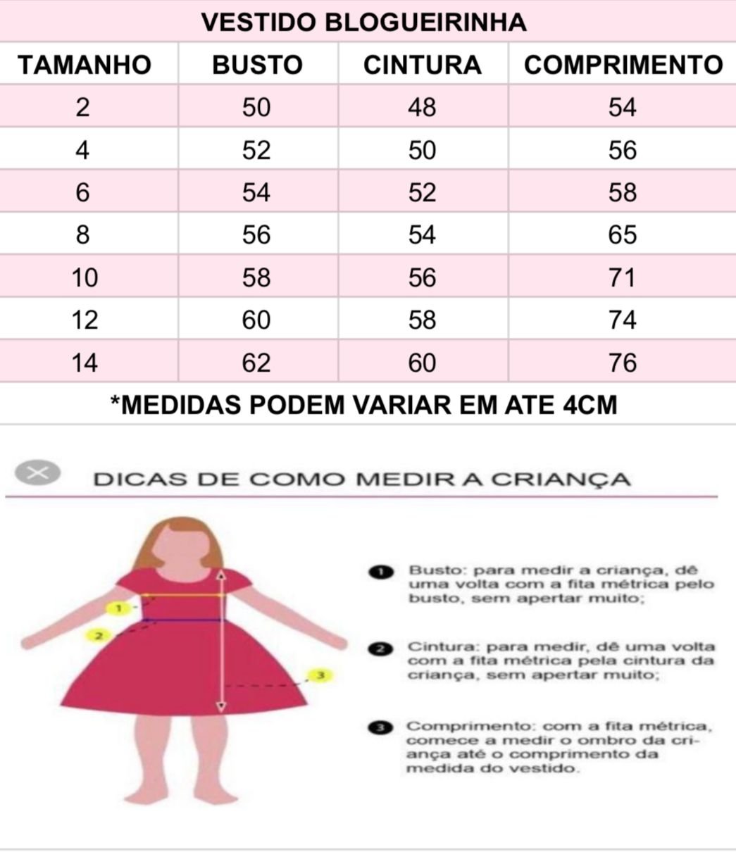 Confeccionado em tecido misto possui forro em poliéster e algodão para não incomodar a criança e proporcionando um caimento incrível e sofisticado, possui gola redonda, comprimento médio, mangas curtas, possui elástico nas costas para melhor ajuste, acabamento com lindo laço na parte posterior do vestido completa o look dos sonhos!