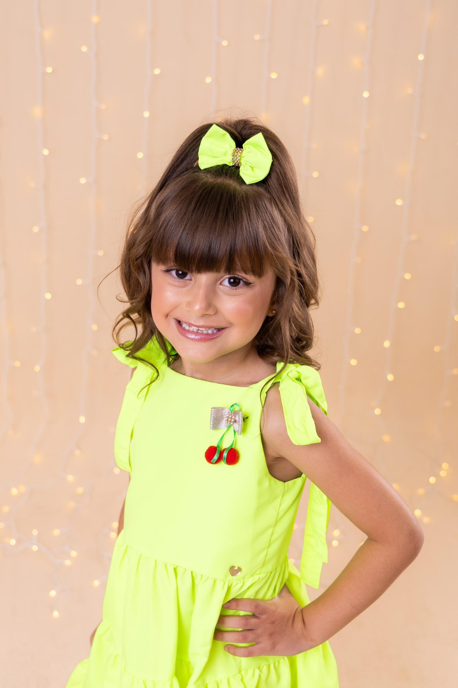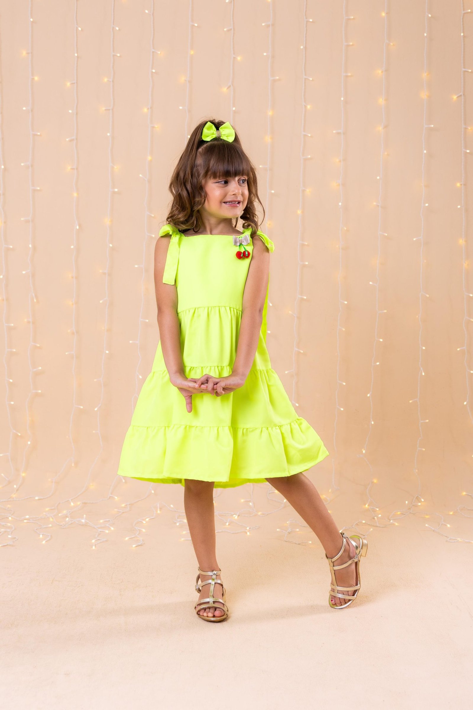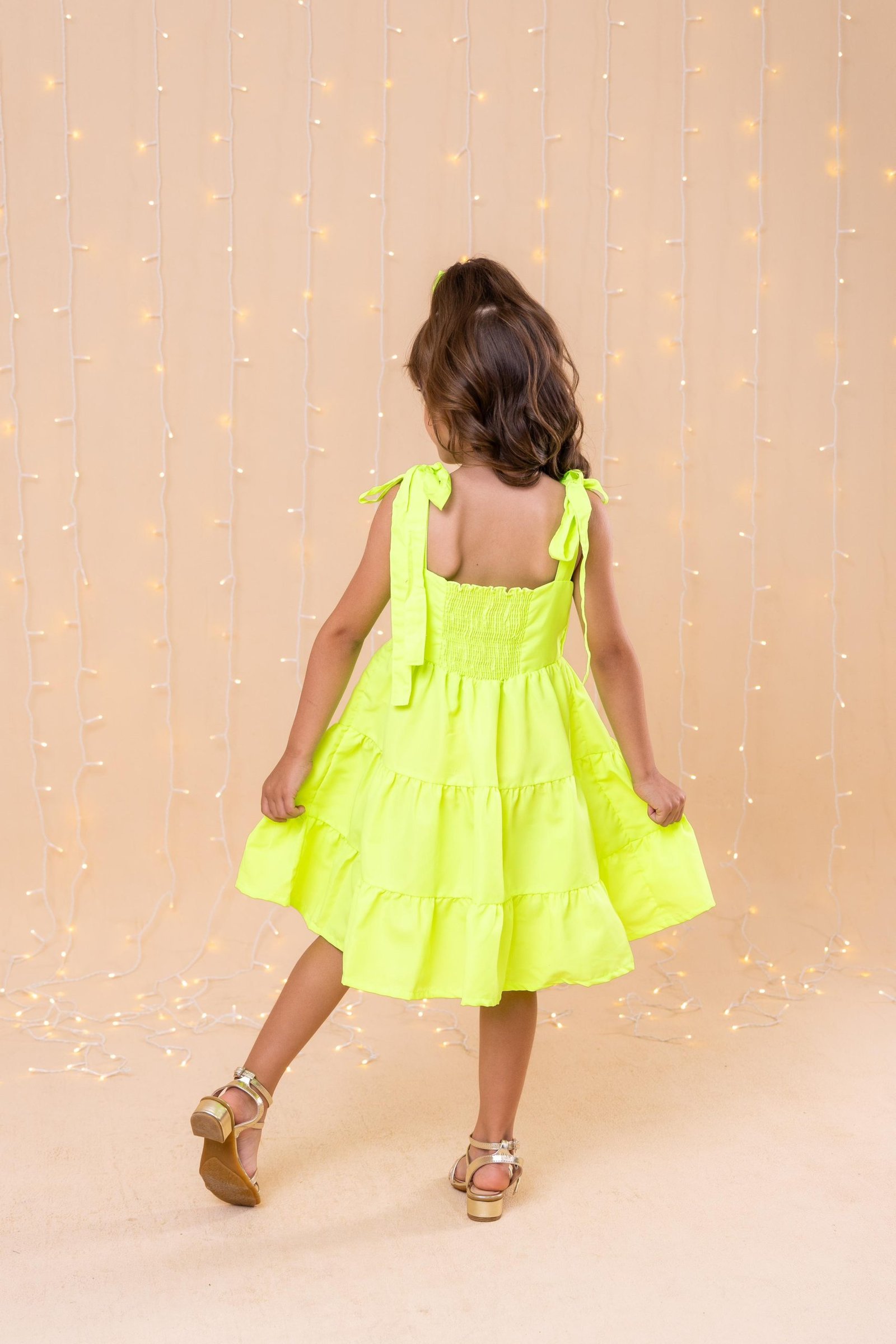 Confeccionado em tecido misto proporcionando um caimento incrível e sofisticado, possui gola redonda, comprimento médio, mangas curtas, possui elástico nas costas para melhor ajuste, acabamento com lindo laço na parte posterior do vestido completa o look dos sonhos!