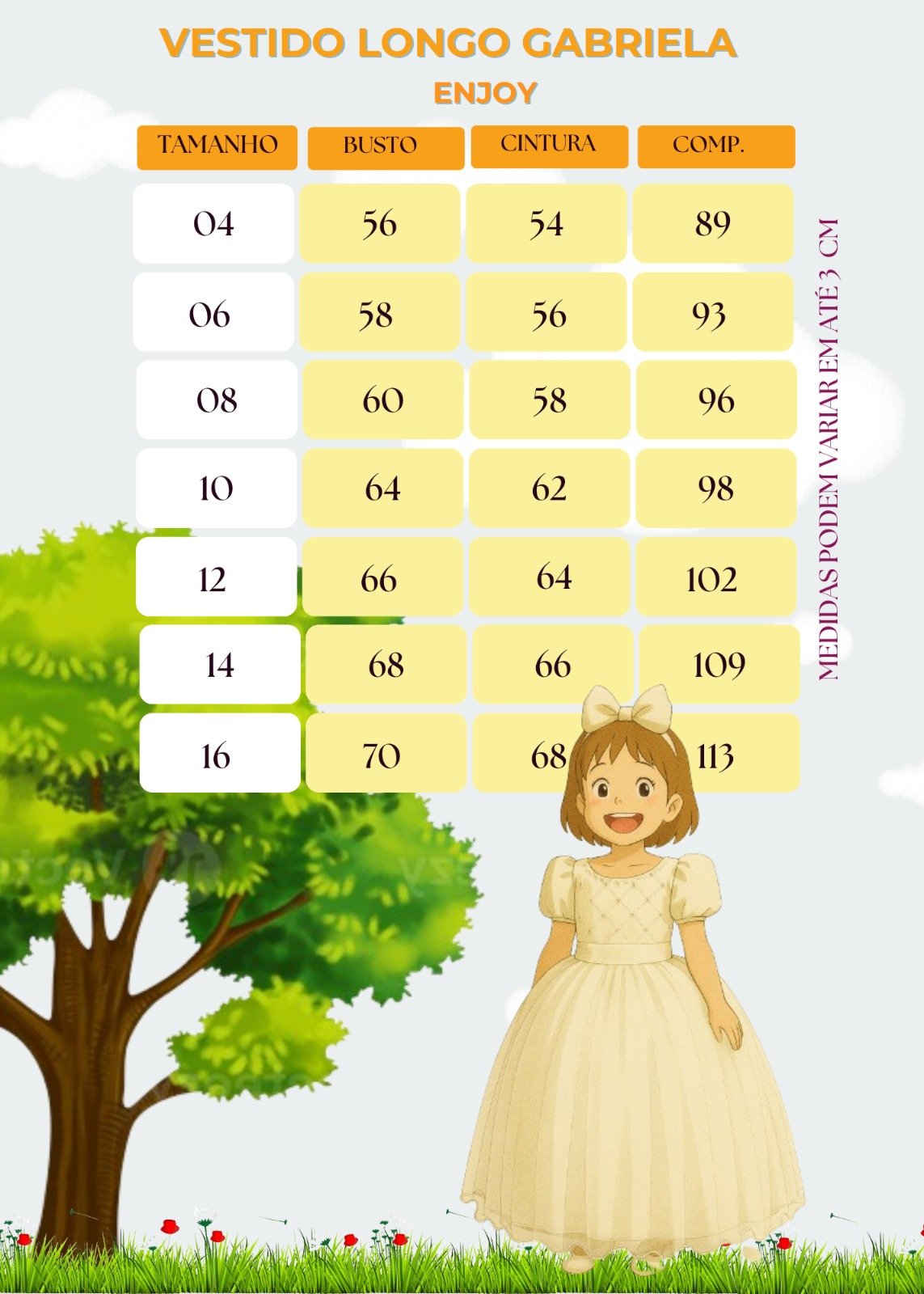As medidas podem variar em até 2cm. Recomendamos sempre consultar a tabela de medidas antes da compra para evitar erros.
