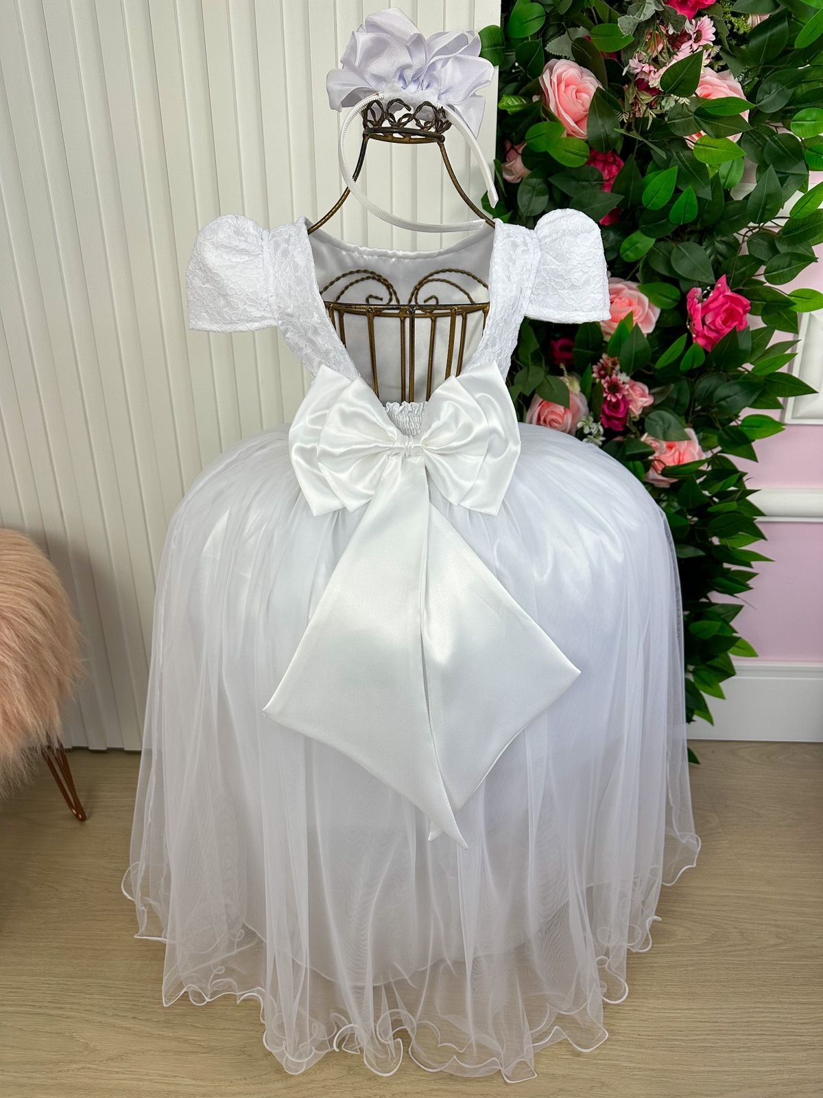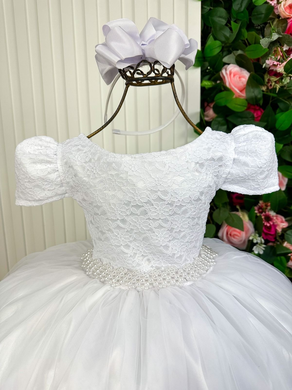 Esse vestido infantil longo é pura delicadeza e sofisticação. O corpete em renda delicada traz um toque romântico e clássico, enquanto a saia volumosa em camadas de tule suave garante movimento encantador, digno de princesa. A cintura é realçada por um cinto feito de pérolas, que adiciona elegância e um brilho especial ao visual.