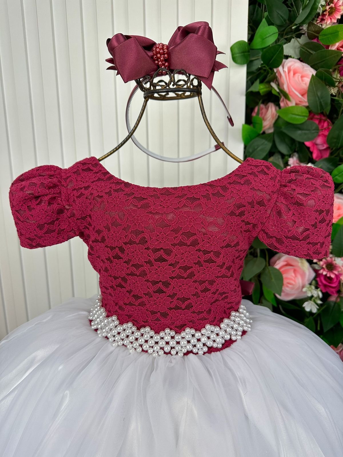 Corpo em renda marsala com mangas curtas, trazendo um ar clássico e elegante.