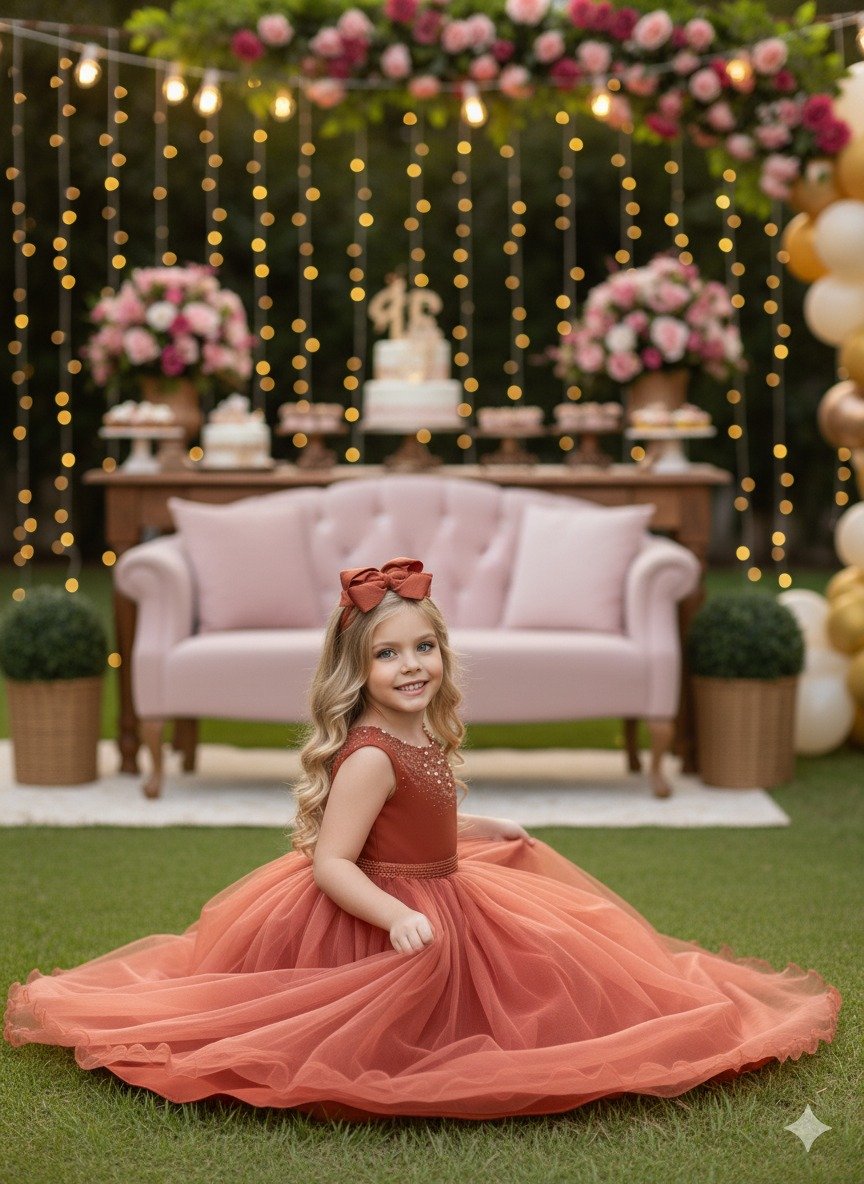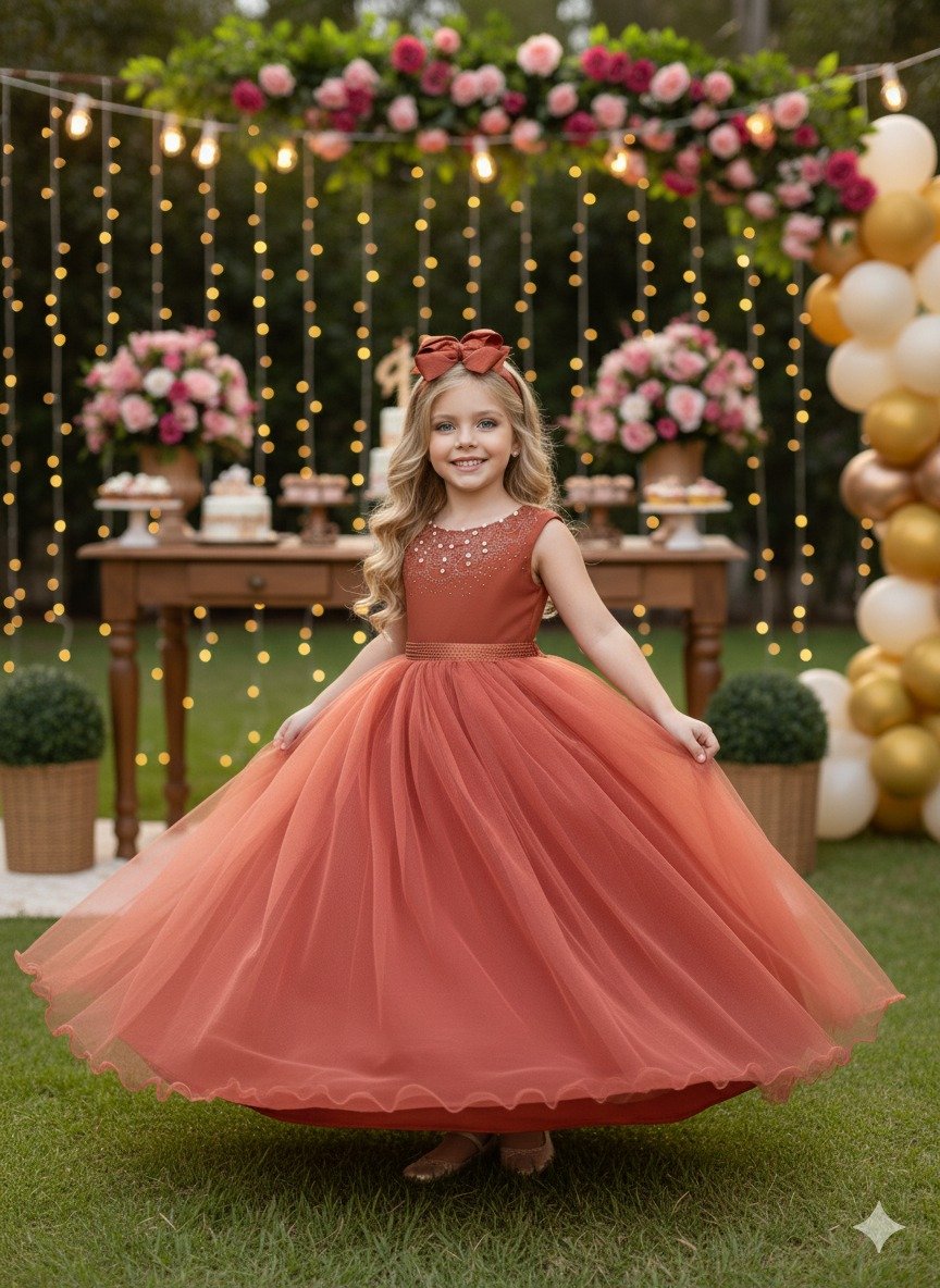 Um modelo sofisticado, cheio de elegância e encanto, perfeito para ocasiões especiais que pedem um look digno de princesa.