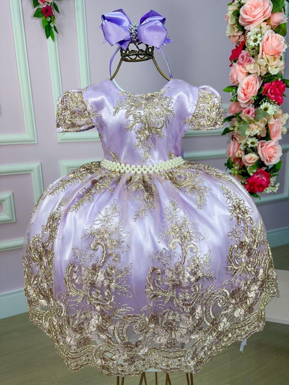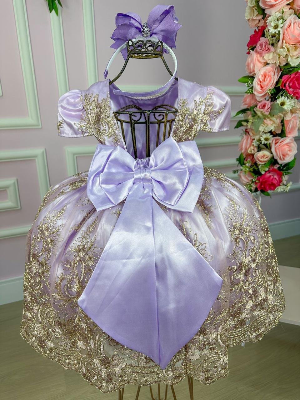 Confeccionado em tecido misto possui forro em poliéster e algodão para não machucar a criança e proporcionando um caimento incrível e sofisticado, possui gola redonda, comprimento médio, mangas curtas, possui elástico nas costas para melhor ajuste, acabamento com lindo laço na parte posterior do vestido completa o look dos sonhos!