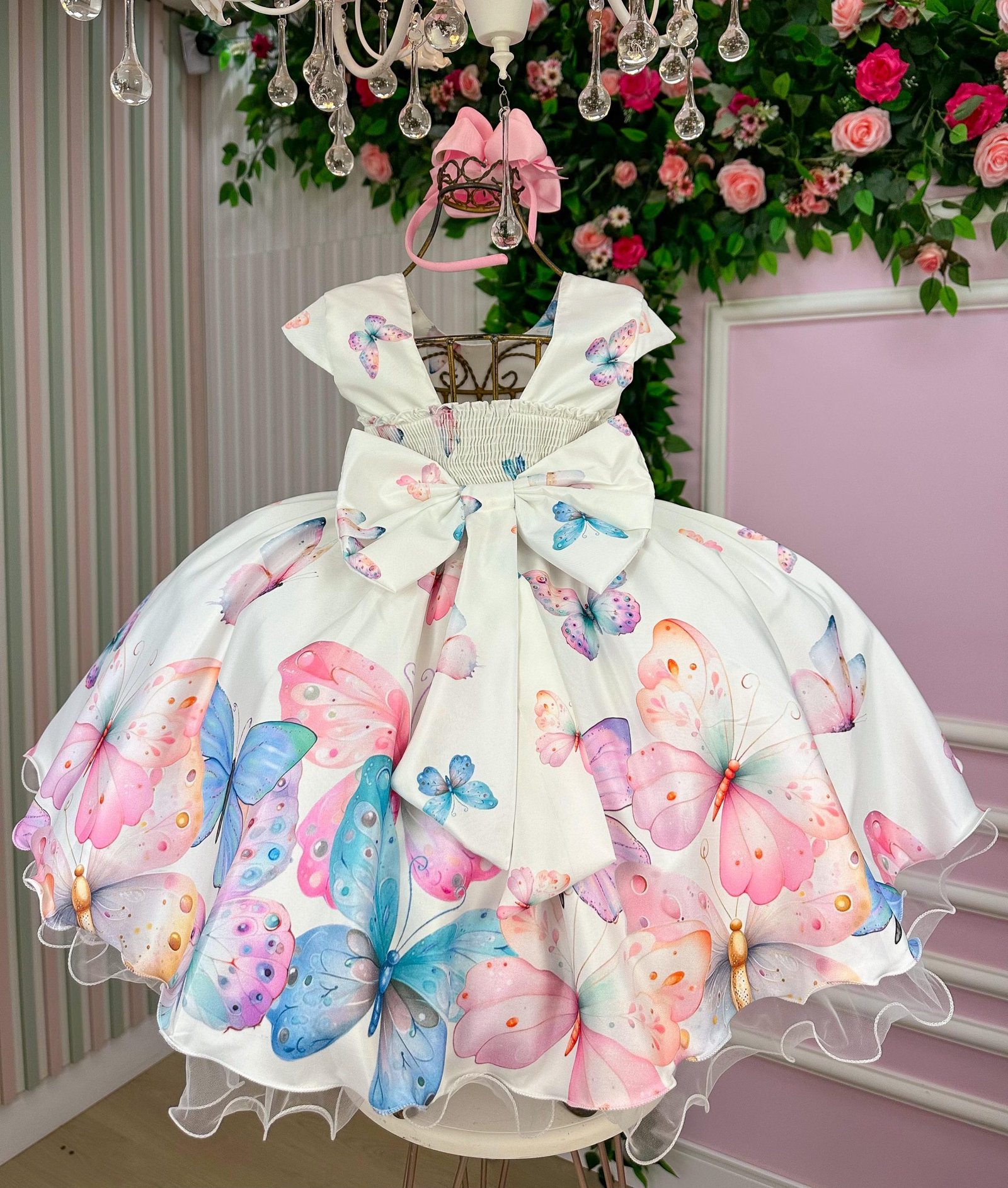 Confeccionado em tecido misto possui forro em poliéster e algodão para não incomodar a criança e proporcionando um caimento incrível e sofisticado, possui gola redonda, comprimento médio, mangas curtas de tule, possui elástico nas costas para melhor ajuste, acabamento com lindo laço na parte posterior do vestido completa o look dos sonhos!
