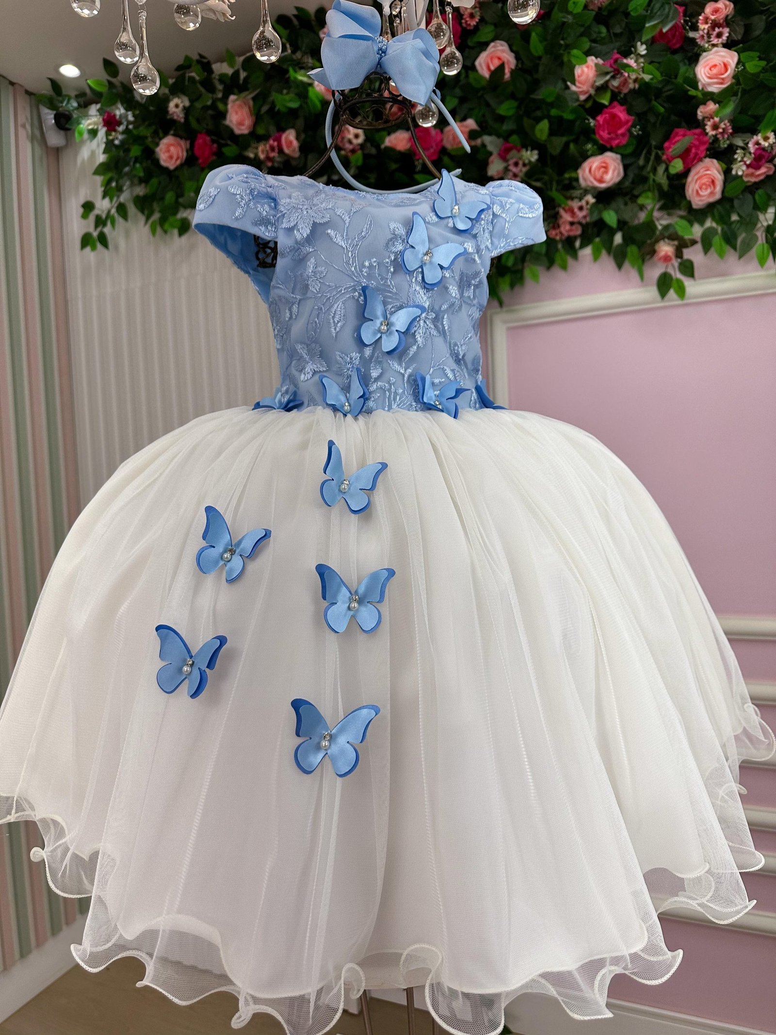 O modelo possui corpete estruturado com bordados florais e aplicações de borboletas 3D com detalhes em strass e pérolas, que trazem movimento e sofisticação. A saia em camadas de tule com acabamento ondulado cria um caimento leve e volumoso, digno de uma princesa.