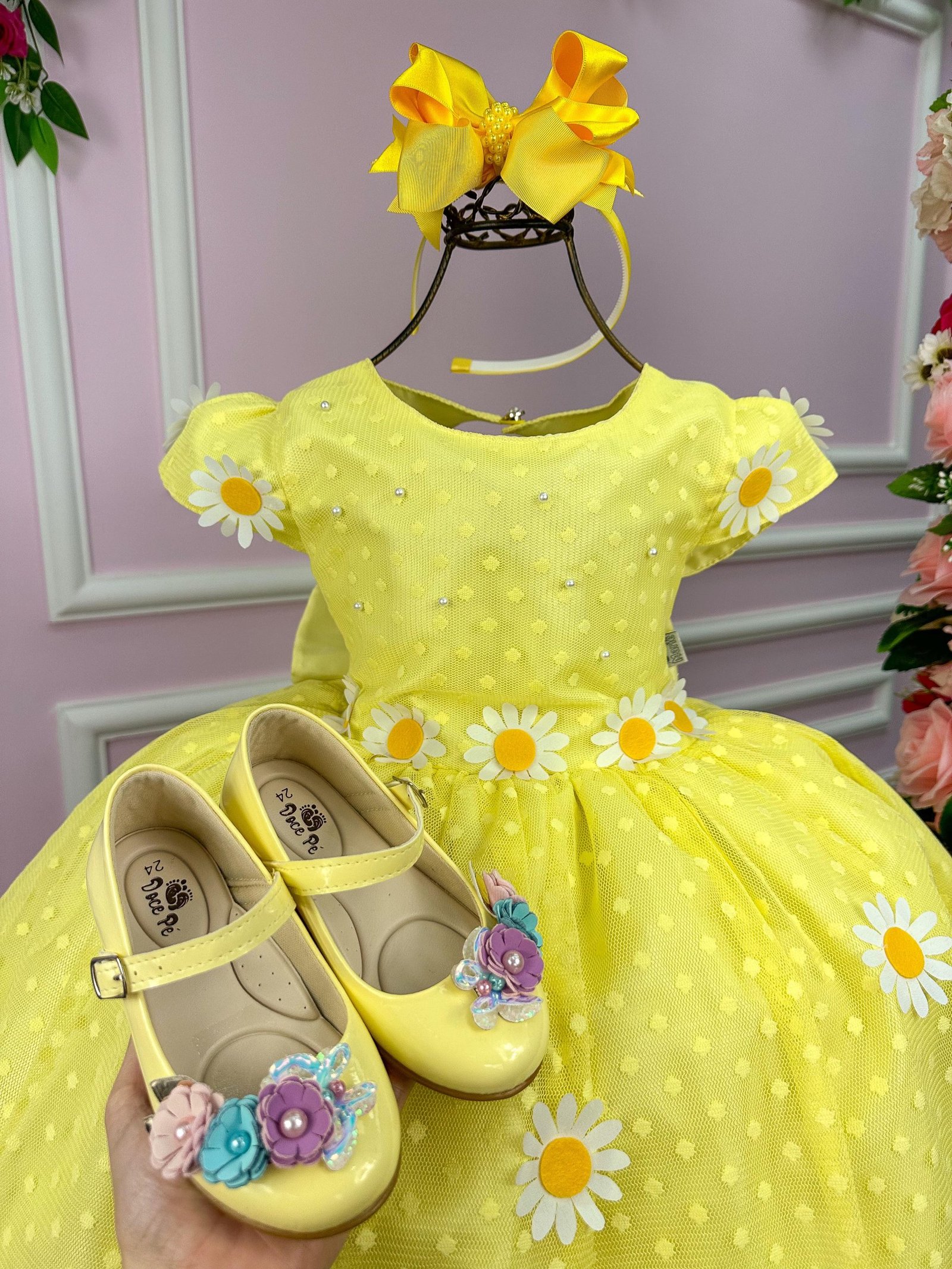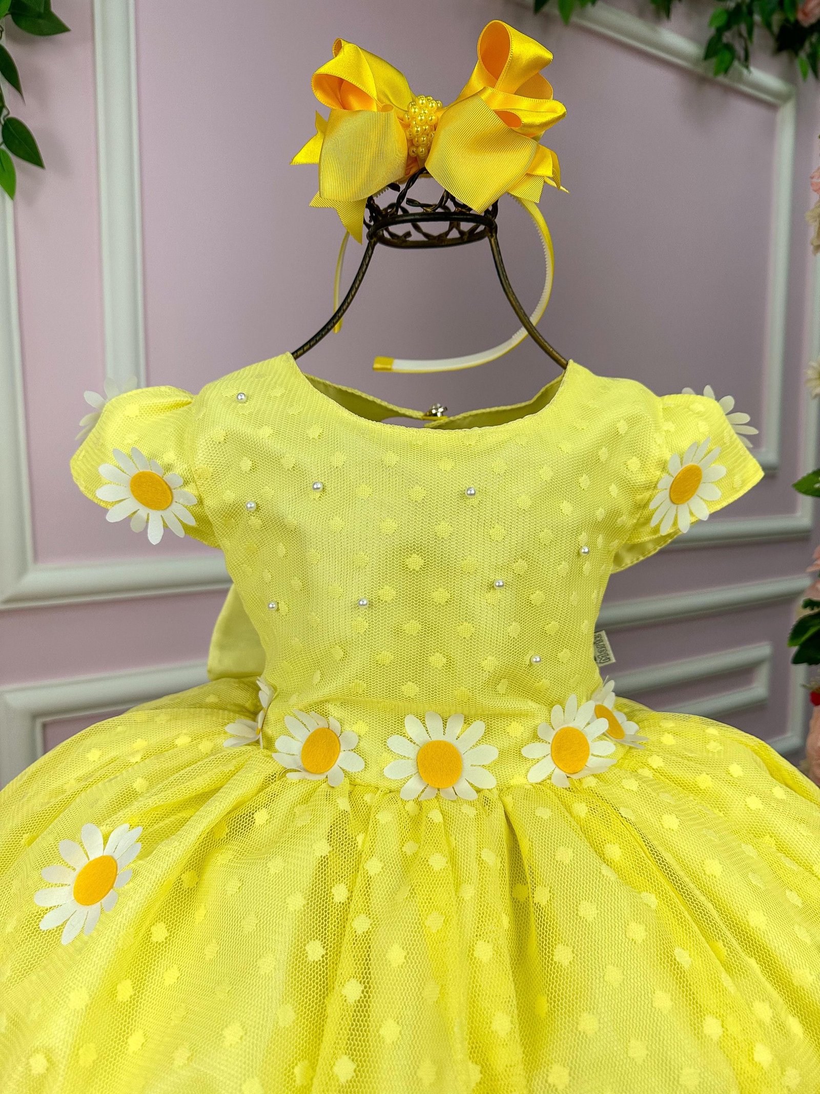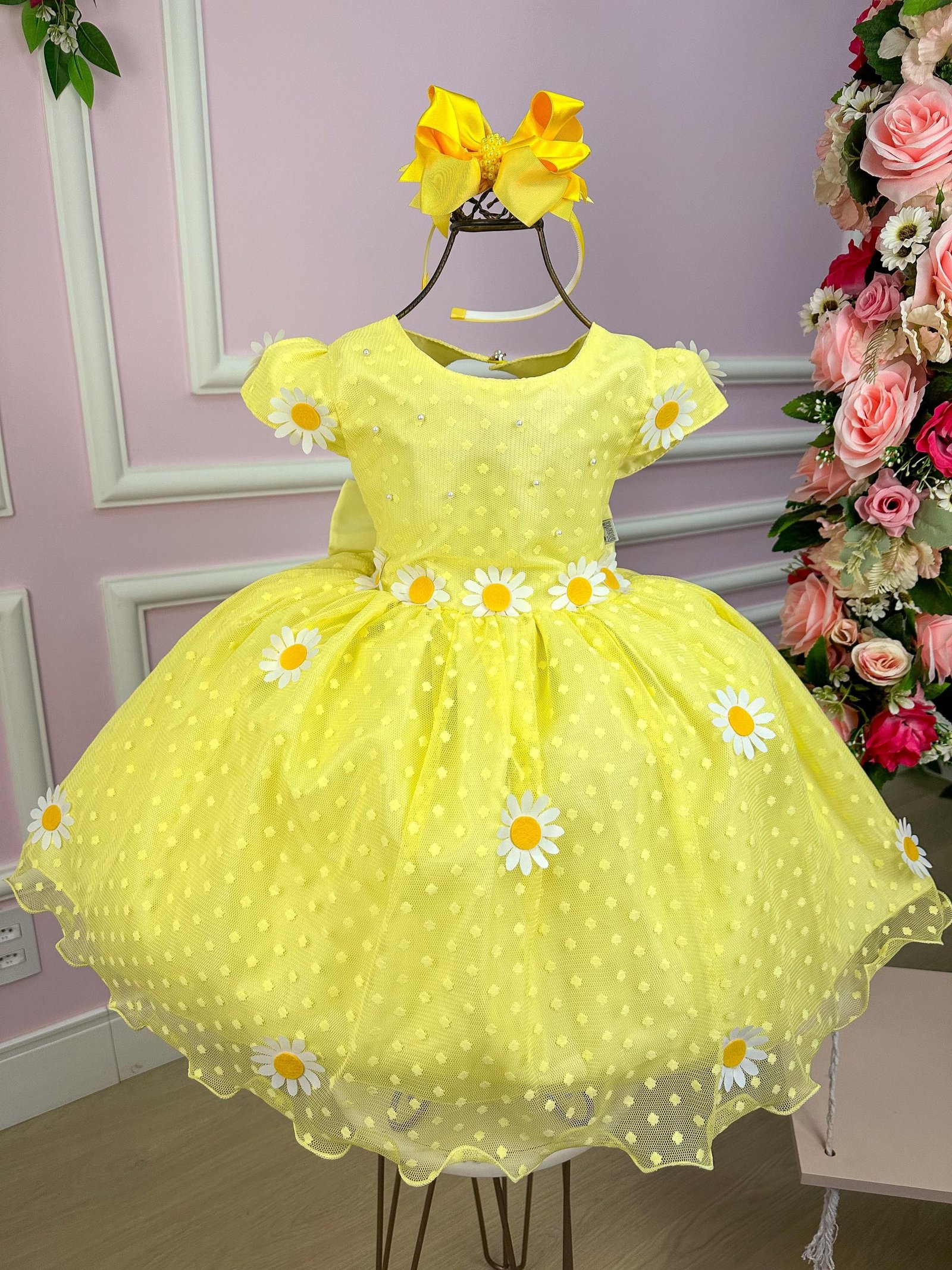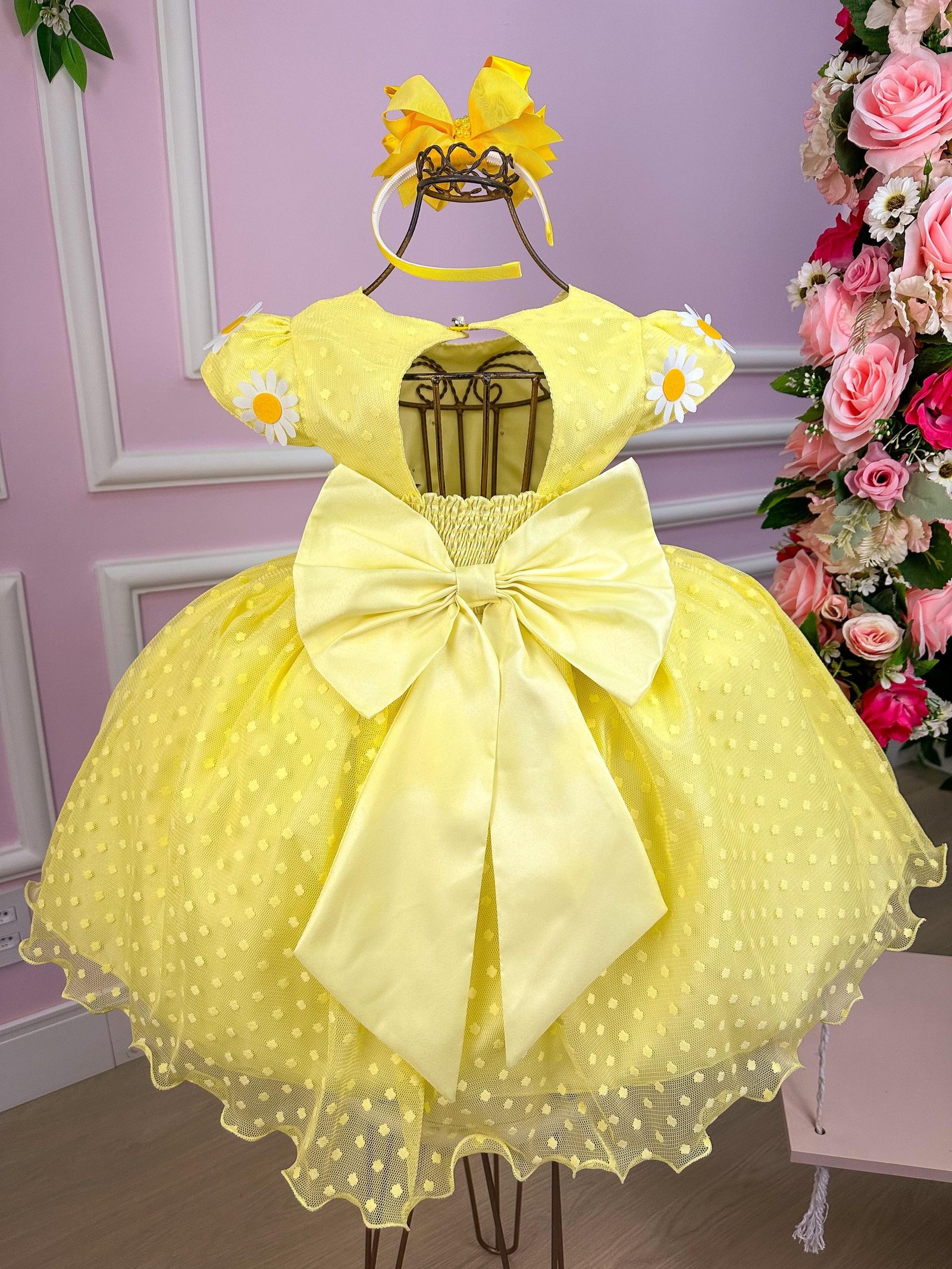 Confeccionado em tecido misto possui forro em poliéster e algodão para não incomodar a criança e proporcionando um caimento incrível e sofisticado, possui gola redonda, comprimento médio, mangas curtas, possui elástico nas costas para melhor ajuste, acabamento com lindo laço na parte posterior do vestido completa o look dos sonho