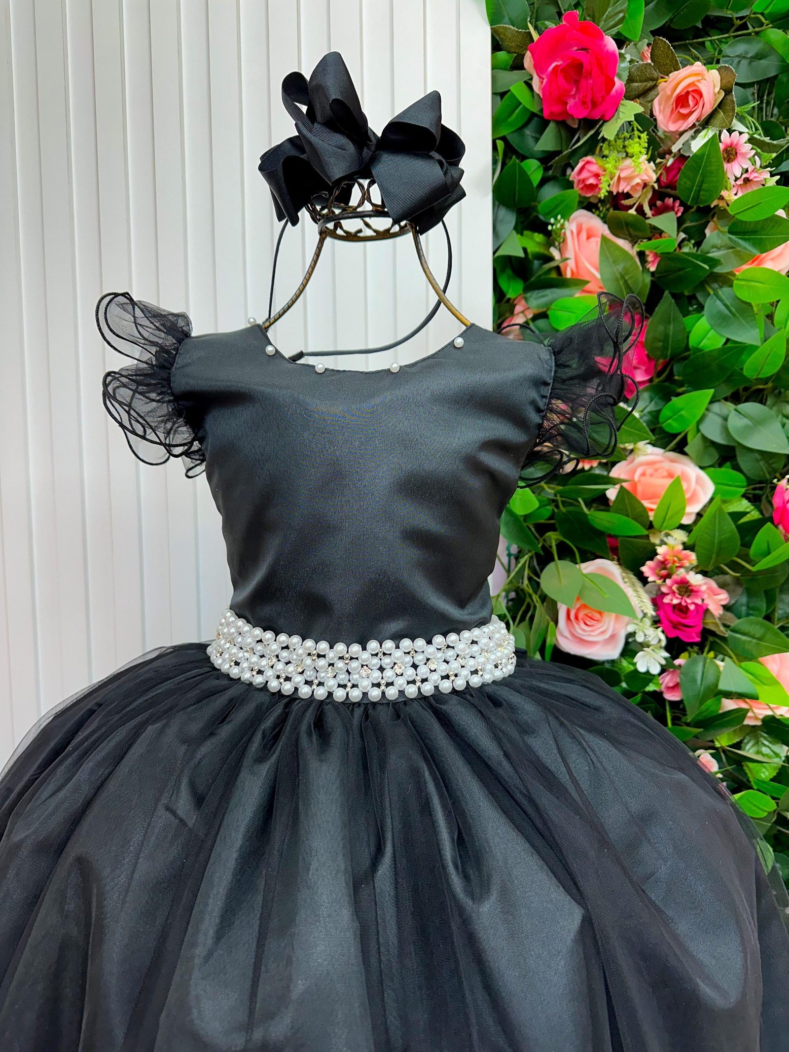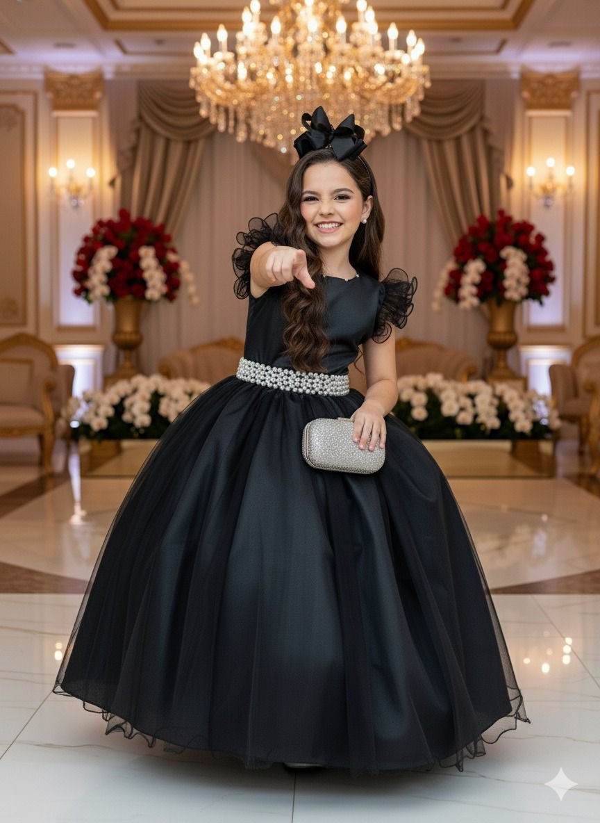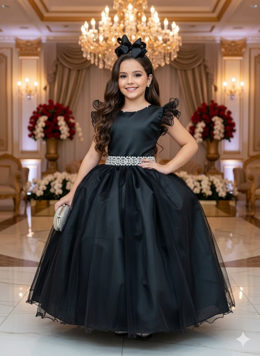 - Cintura marcada por um cinto de pérolas, realçando o charme da peça.