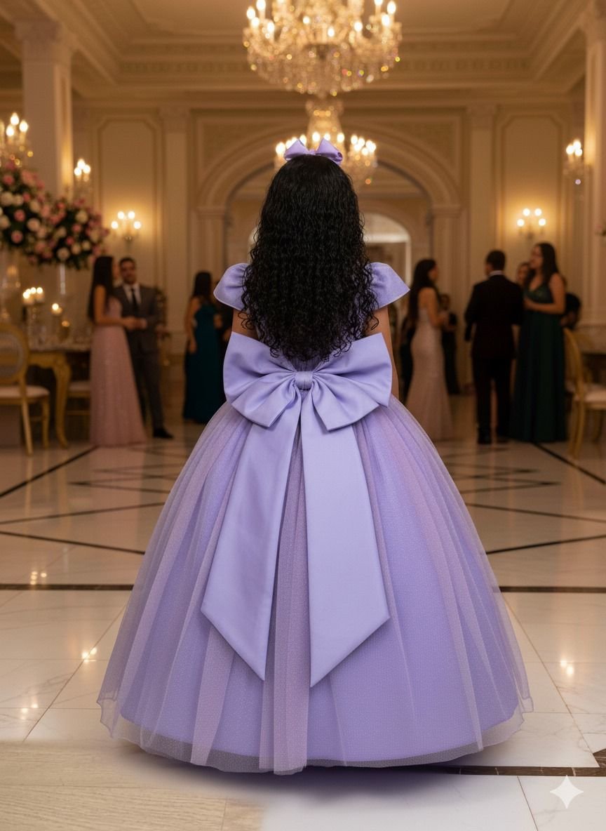 Confeccionado em tule com brilho suave, o modelo traz um caimento leve e elegante, com mangas e corpete estruturado que valoriza o visual clássico. O destaque vai para o cinto de pérolas entrelaçadas, que adiciona um toque de luxo e luminosidade à peça.