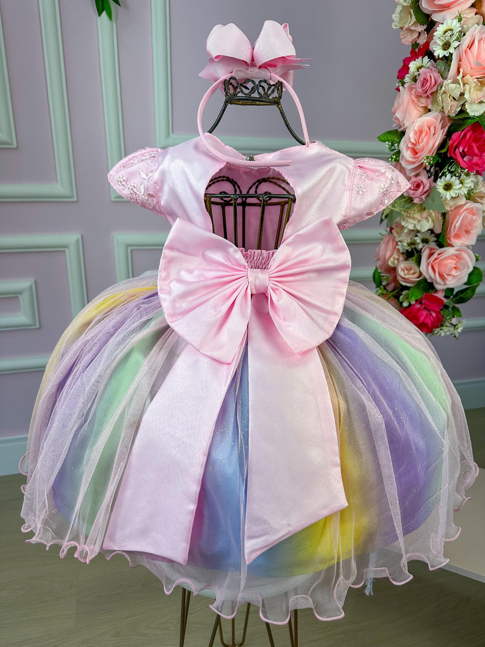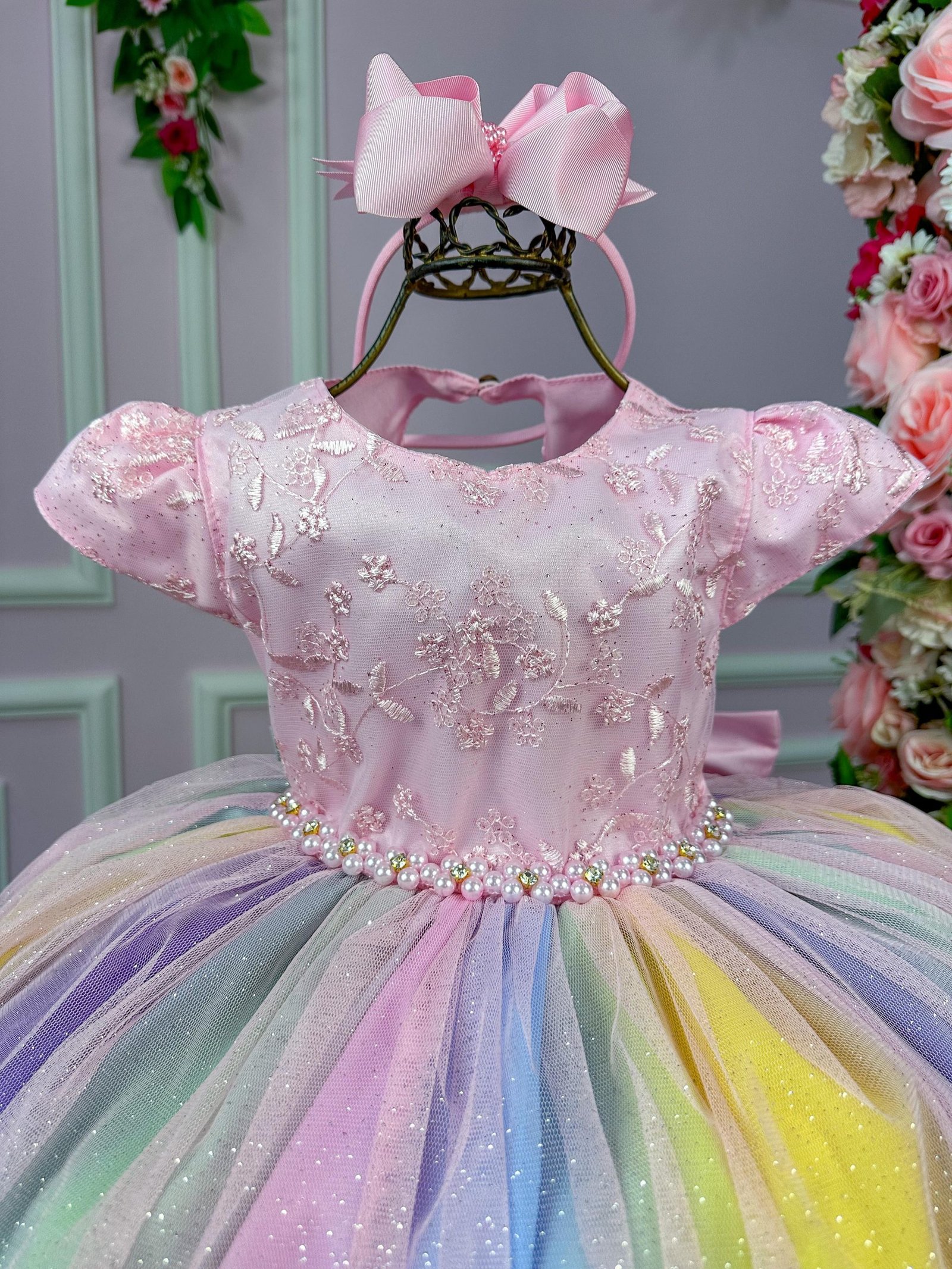 Confeccionado em tecido misto possui forro em poliéster e algodão para não incomodar a criança e proporcionando um caimento incrível e sofisticado, possui gola redonda, comprimento médio, mangas curtas, apliques de concha, perolás, flores,laços e de tecido no ombro com efeito de água viva, possui elástico nas costas para melhor ajuste, acabamento com lindo laço na parte posterior do vestido completa o look dos sonhos!