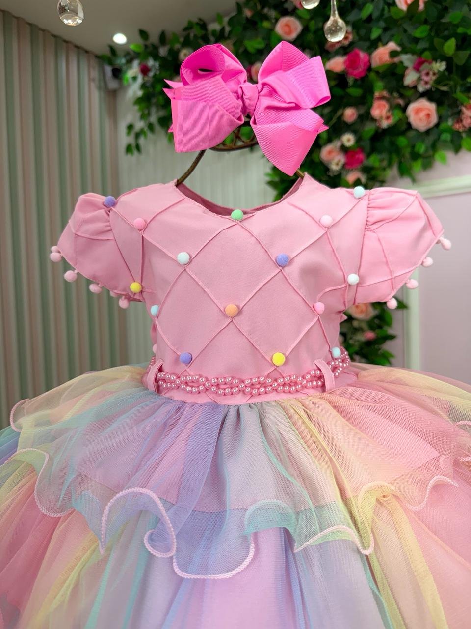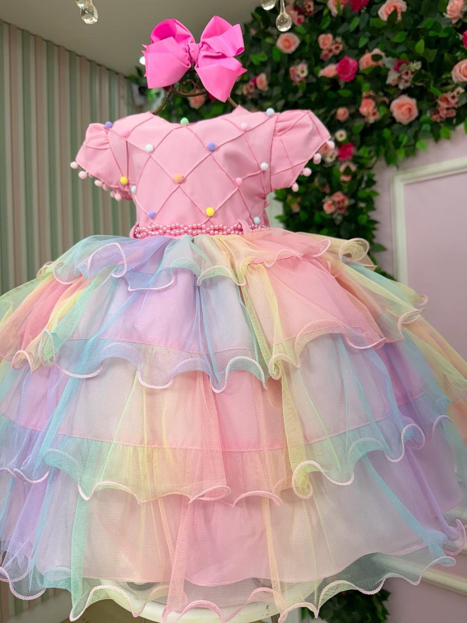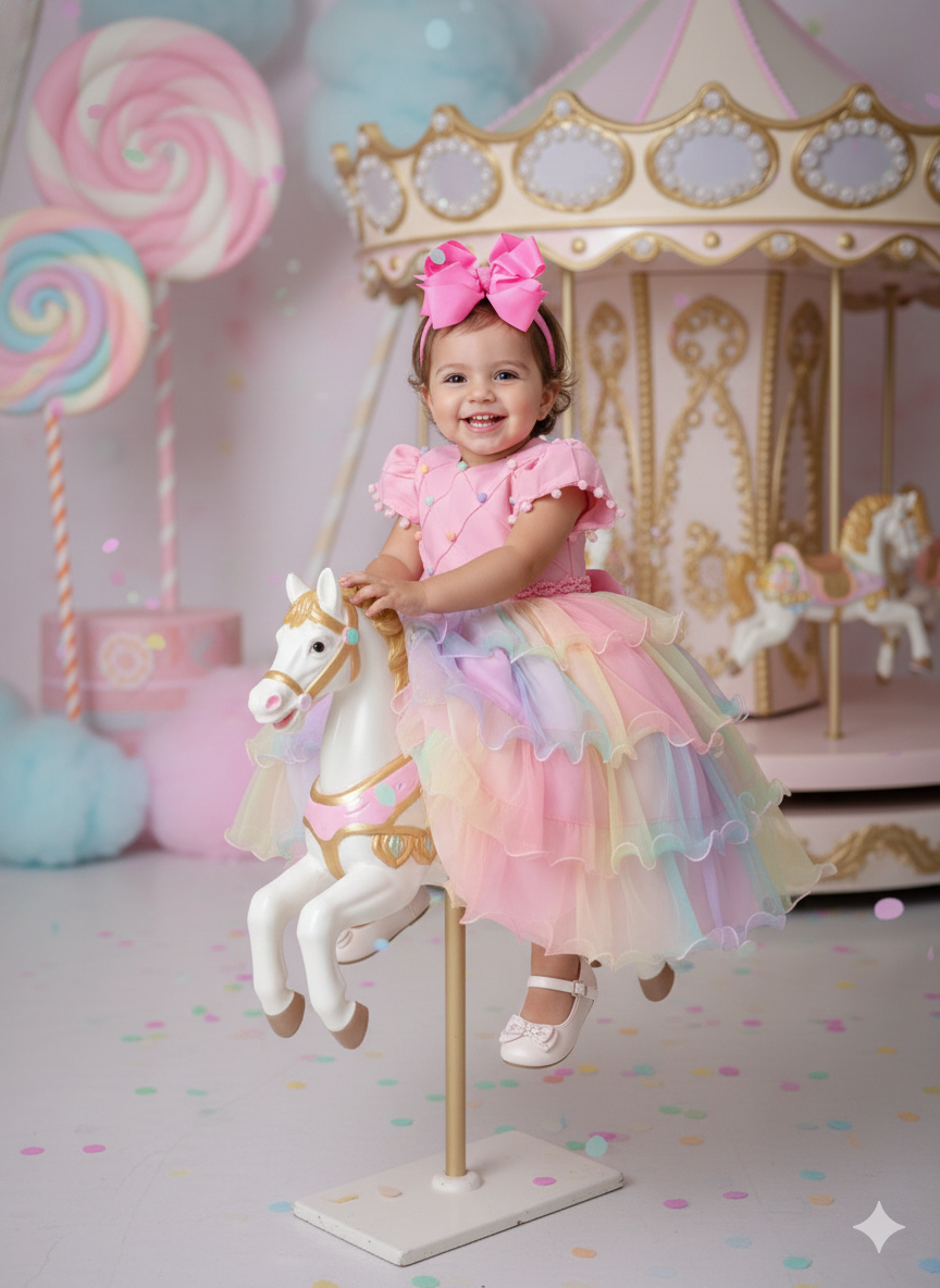 Com sua paleta candy super suave e a saia em camadas de tule multicolorido, ele combina com vários temas infantis, criando um visual cheio de fantasia e alegria.