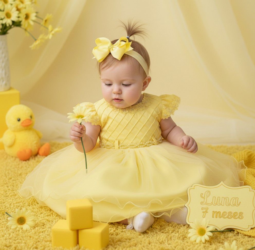 Confeccionado em tecido misto possui forro em poliéster e algodão para não incomodar a criança e proporcionando um caimento incrível e sofisticado, possui gola redonda, comprimento médio, mangas curtas, possui elástico nas costas para melhor ajuste, acabamento com lindo laço na parte posterior do vestido completa o look dos sonhos!