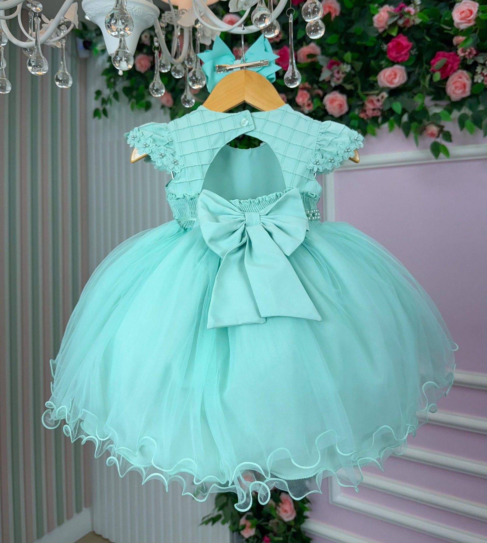 Confeccionado em tecido misto possui forro em poliéster e algodão para não incomodar a criança e proporcionando um caimento incrível e sofisticado, possui gola redonda, comprimento médio, mangas curtas, possui elástico nas costas para melhor ajuste, acabamento com lindo laço na parte posterior do vestido completa o look dos sonhos!