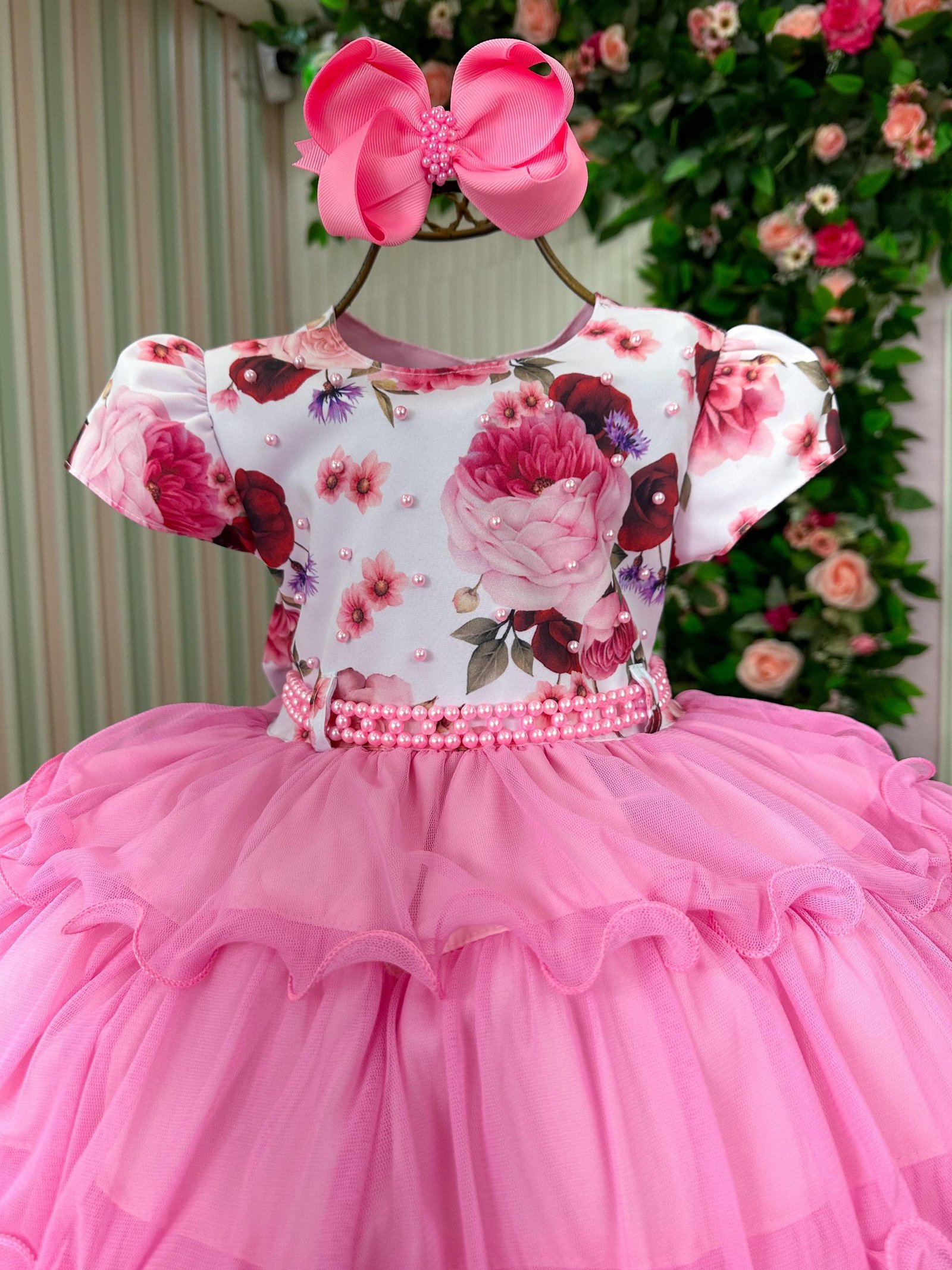 Confeccionado em tecido misto possui forro em poliéster e algodão para não incomodar a criança e proporcionando um caimento incrível e sofisticado, possui gola redonda, comprimento médio, mangas curtas, possui elástico nas costas para melhor ajuste, acabamento com lindo laço na parte posterior do vestido completa o look dos sonho